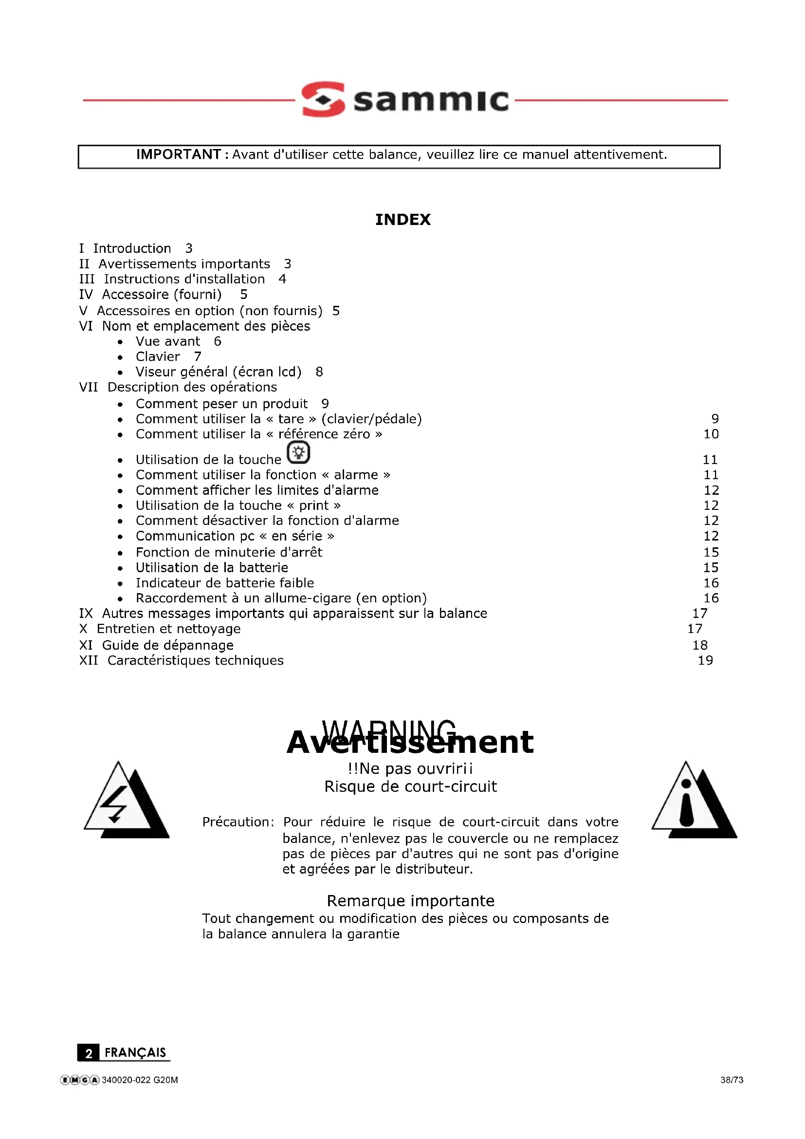 Avertissement !!Ne pas ouvrir¡¡ Risque de court-circuit Précaution: Pour réduire le risque de court-circuit dans votre balance, n'enlevez pas le couvercle ou ne remplacez pas de pièces par d'autres qui ne sont pas d'origine et agréées par le distributeur. Remarque importante Tout changement ou modification des pièces ou composants de la balance annulera la garantie 340020-022 G20M 38/73FRANÇAIS 3
