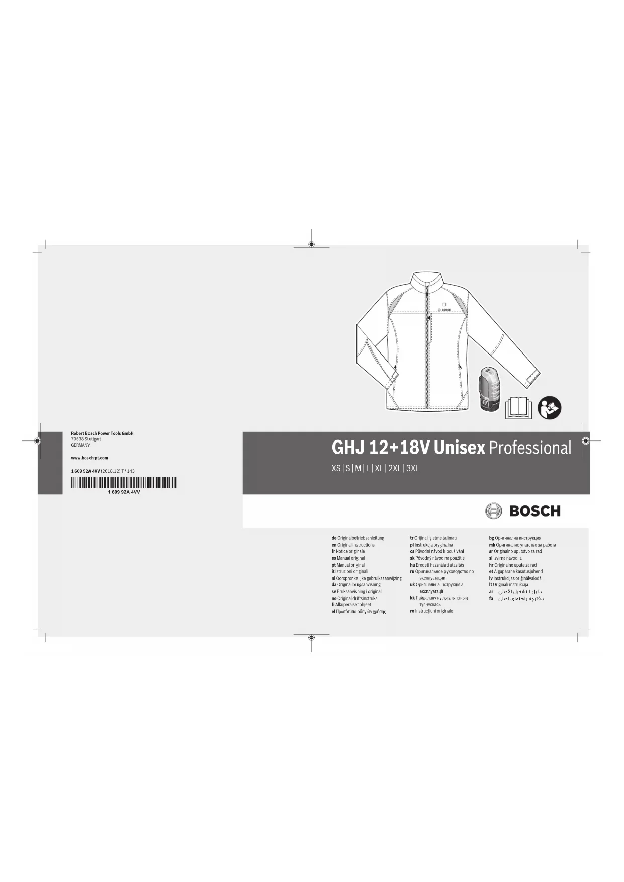 A) Some external USB devices cannot be charged with this battery adapter despite being consistent with the technical data. Maintenance and Servicing u Before undertaking any work on the garment itself (e.g. cleaning, etc.), as well as during transport and storage, remove the battery from the battery adapter. Cleaning u Remove the battery adapter from the garment before cleaning. If the battery adapter becomes wet, it can cause a malfunction of the garment. Remove all contents from the pockets when cleaning the gar- ment, especially the battery adapter (2), the battery (7) and any connected USB cables. The connector plug(4) can be washed with the garment. Follow the instructions on the care label in the garment: Machine wash on medium temperature setting Do not bleach Tumble-dry on low temperature setting Do not iron Do not wring out Do not dry clean Not to be used by very young children (0–3 years) Do not insert pins 1 609 92A 4VV | (07.12.2018) Bosch Power ToolsEnglish | 13 After-sales service and advice on using products Our after-sales service responds to your questions concern- ing maintenance and repair of your product as well as spare parts. You can find explosion drawings and information on spare parts at: www.bosch-pt.com The Bosch product use advice team will be happy to help you with any questions about our products and their accessor- ies. In all correspondence and spare parts orders, please always include the 10‑digit article number given on the nameplate of the product. Great Britain Robert Bosch Ltd. (B.S.C.) P.O. Box 98 Broadwater Park North Orbital Road Denham Uxbridge UB 9 5HJ At www.bosch-pt.co.uk you can order spare parts or ar- range the collection of a product in need of servicing or re- pair. Tel. Service: (0344) 7360109 E-Mail: boschservicecentre@bosch.com Ireland Origo Ltd. Unit 23 Magna Drive Magna Business Park City West Dublin 24 Tel. Service: (01) 4666700 Fax: (01) 4666888 Australia, New Zealand and Pacific Islands Robert Bosch Australia Pty. Ltd. Power Tools Locked Bag 66 Clayton South VIC 3169 Customer Contact Center Inside Australia: Phone: (01300) 307044 Fax: (01300) 307045 Inside New Zealand: Phone: (0800) 543353 Fax: (0800) 428570 Outside AU and NZ: Phone: +61 3 95415555 www.bosch-pt.com.au www.bosch-pt.co.nz Republic of South Africa Customer service Hotline: (011) 6519600 Gauteng – BSC Service Centre 35 Roper Street, New Centre Johannesburg Tel.: (011) 4939375 Fax: (011) 4930126 E-mail: bsctools@icon.co.za KZN – BSC Service Centre Unit E, Almar Centre 143 Crompton Street Pinetown Tel.: (031) 7012120 Fax: (031) 7012446 E-mail: bsc.dur@za.bosch.com Western Cape – BSC Service Centre Democracy Way, Prosperity Park Milnerton Tel.: (021) 5512577 Fax: (021) 5513223 E-mail: bsc@zsd.co.za Bosch Headquarters Midrand, Gauteng Tel.: (011) 6519600 Fax: (011) 6519880 E-mail: rbsa-hq.pts@za.bosch.com Transport The contained lithium-ion batteries are subject to the Dan- gerous Goods Legislation requirements. The batteries are suitable for road-transport by the user without further re- strictions. When shipping by third parties (e.g.: by air transport or for- warding agency), special requirements on packaging and la- belling must be observed. For preparation of the item being shipped, consulting an expert for hazardous material is re- quired. Dispatch battery packs only when the housing is undam- aged. Tape or mask off open contacts and pack up the bat- tery in such a manner that it cannot move around in the packaging. Please also observe the possibility of more de- tailed national regulations. Disposal The machine, rechargeable batteries, ac- cessories and packaging should be sorted for environmental-friendly recycling. Do not dispose of power tools and batteries/ rechargeable batteries into household waste! Only for EU countries: According to the Directive 2012/19/EU, power tools that are no longer usable, and according to the Directive 2006/66/EC, defective or used battery packs/batteries, must be collected separately and disposed of in an environ- mentally correct manner. Battery packs/batteries: Li-ion: Please observe the notes in the section on transport (see "Transport", page13). Bosch Power Tools 1 609 92A 4VV | (07.12.2018)14 | Français Français Consignes de sécurité Lisez attentivement toutes les instructions et consignes de sécurité. Le non-respect des instruc- tions et consignes de sécu- rité peut provoquer un choc électrique, un incendie et/ou en- traîner de graves blessures. Référez-vous aux illustrations qui se trouvent au début de la notice d’utilisation. Conservez tous les avertissements et toutes les instruc- tions pour pouvoir s’y reporter ultérieurement. u Ce vêtement n’est pas prévu pour être utilisé par des enfants ni par des personnes souffrant d’un han- dicap physique, sensoriel ou men- tal ou manquant d’expérience ou de connaissances. Ce vêtement peut être utilisé par des enfants (âgés d’au moins 8ans) et par des personnes souf- frant d’un handicap physique, sen- soriel ou mental ou manquant d’ex- périence ou de connaissances, à condition qu’ils soient sous la sur- veillance d’une personne respon- sable de leur sécurité ou après avoir reçu des instructions sur la façon d’utiliser le vêtement en toute sécurité et après avoir bien compris les dangers inhérents à son utilisation. Il y a sinon risque de blessures et d’utilisation inappro- priée. u Ne laissez pas les enfants sans sur- veillance. Faites en sorte que les en- fants ne jouent pas avec le vêtement. u Ne confiez pas le nettoyage et l’en- tretien du vêtement à des enfants sans surveillance. Consignes de sécurité pour les vêtements chauffants u En cas d’apparition de l’un des symptômes indiqués ci- dessous pendant l’utilisation du vêtement, retirez-le immédiatement et consultez un médecin. Il y a sinon risque d’épuisement dû à la chaleur ou de coup de cha- leur. – Premiers signes : Inconfort ; s
