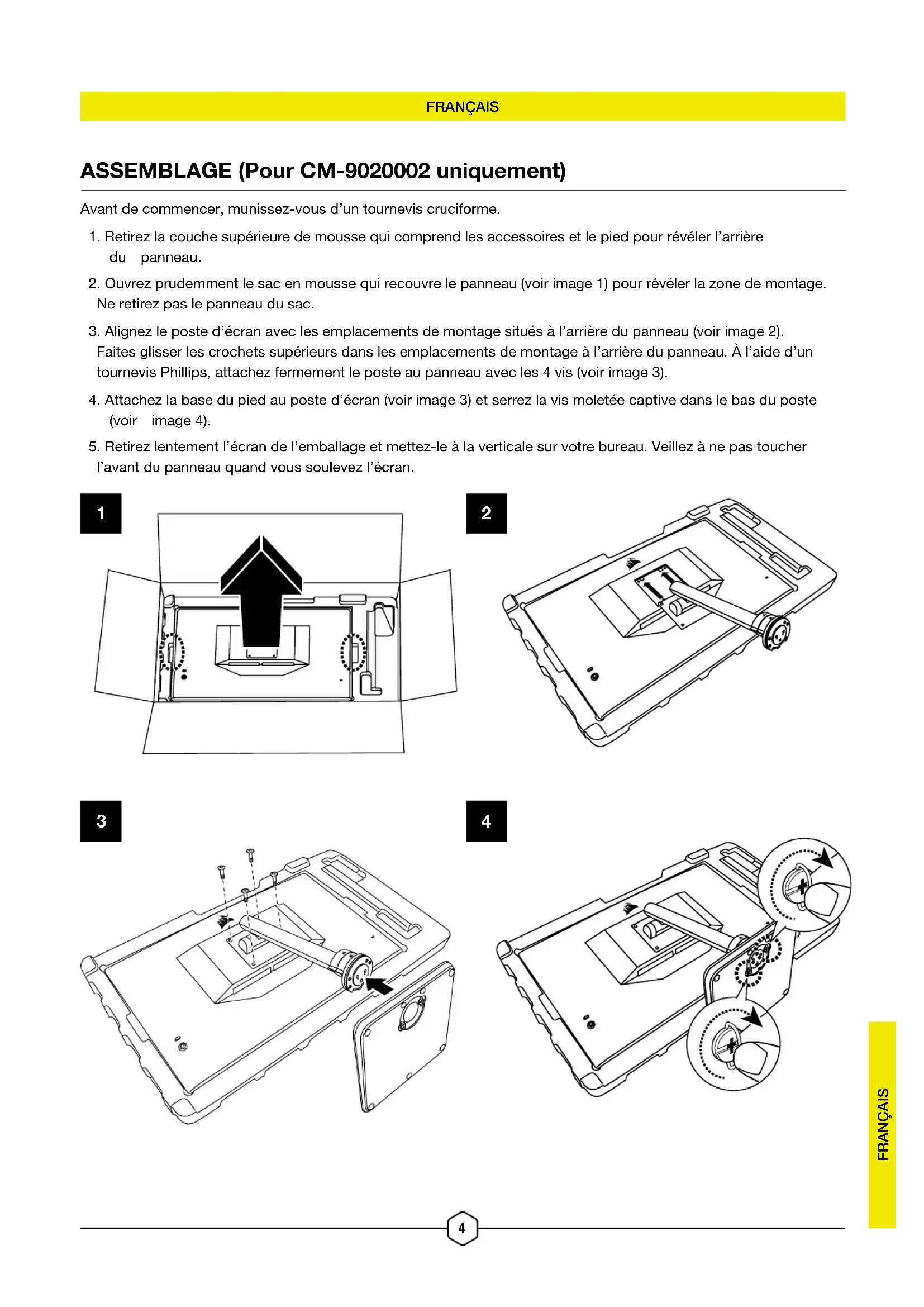 l’avant du panneau quand vous soulevez l’écran. ASSEMBLAGE (Pour CM-9020002 uniquement) FRANÇAIS FRANÇAIS