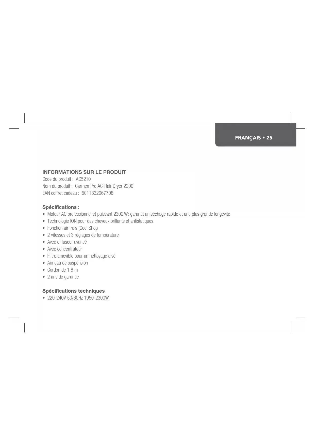 Code du produit : AC5210 Nom du produit : Carmen Pro AC-Hair Dryer 2300 EAN coffret cadeau : 5011832067708 Spécifications :