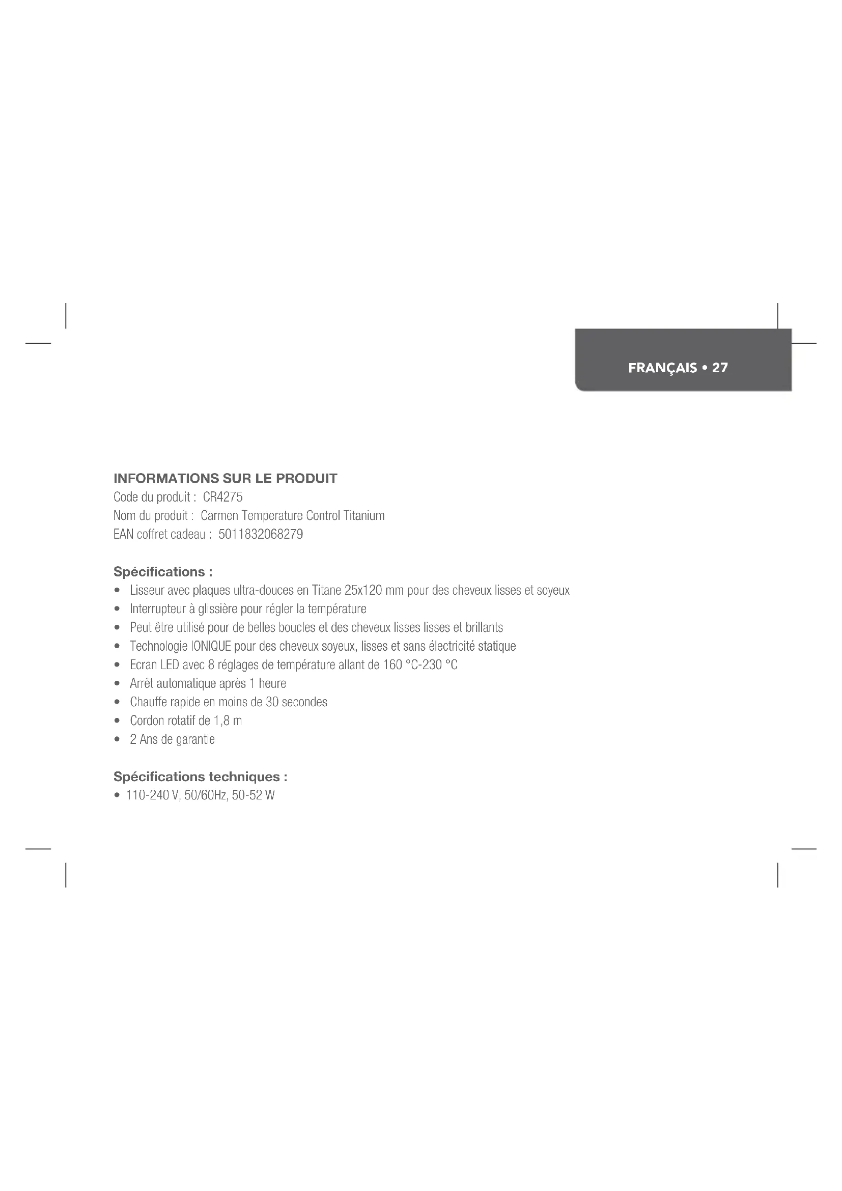 Code du produit : CR4275 Nom du produit : Carmen Temperature Control Titanium EAN coffret cadeau : 5011832068279 Spécifications :