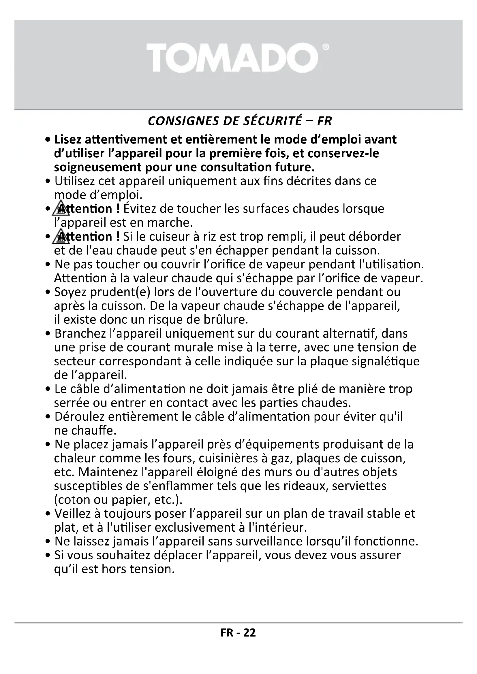 TRC1001S - Cuiseur à riz Tomado - Notice d'utilisation et mode d'emploi gratuit