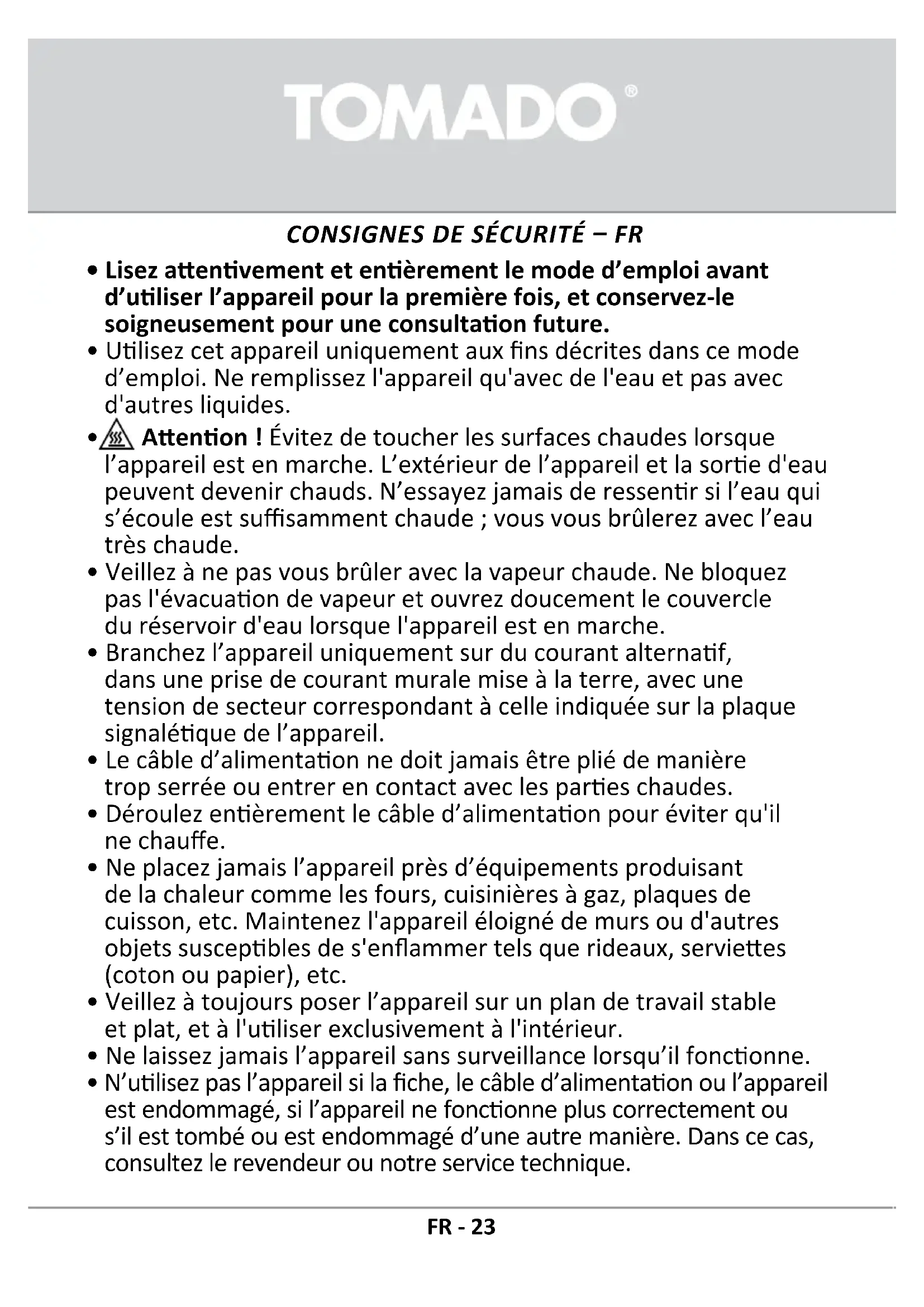 Rendez-vous sur www.tomado.com/support pour acheter des accessoires ou des pièces de rechange.