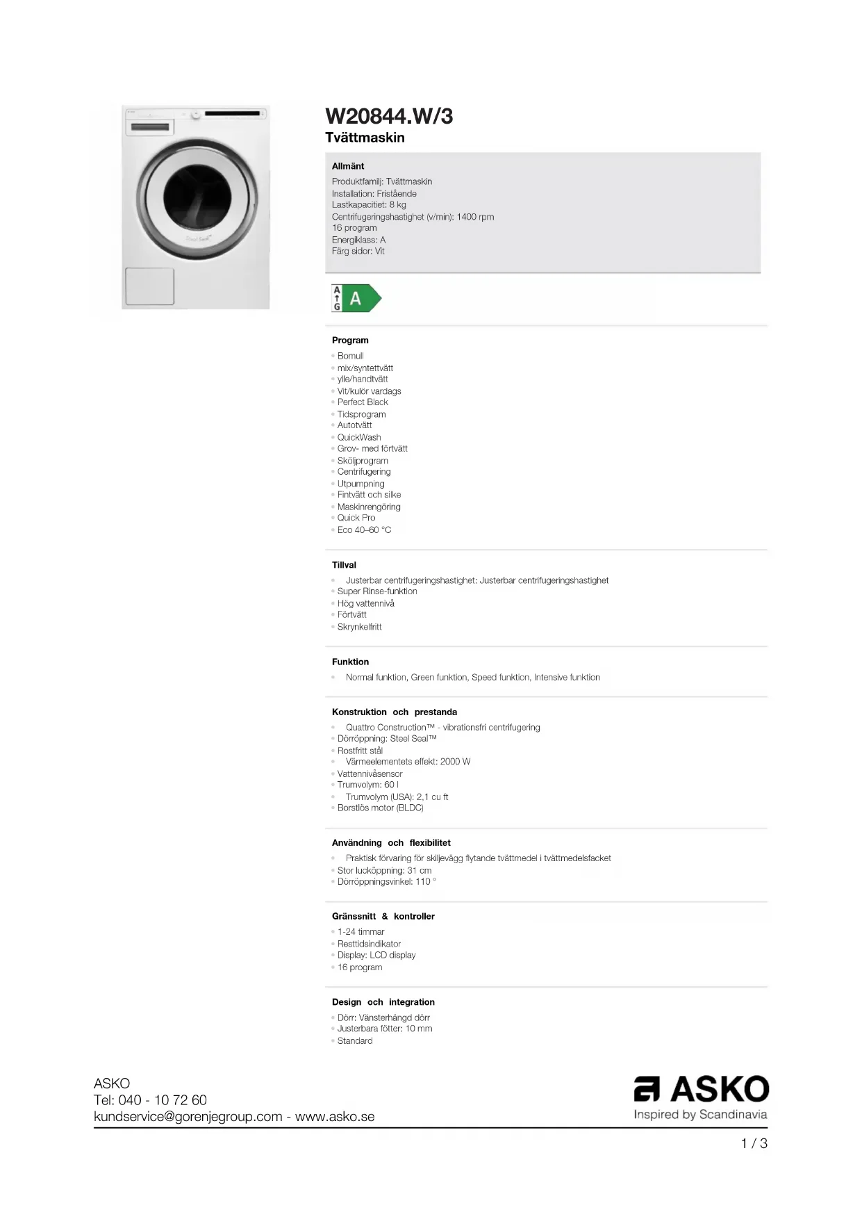 Retrouvez gratuitement la notice de l'appareil W20844.W3 ASKO au format PDF.