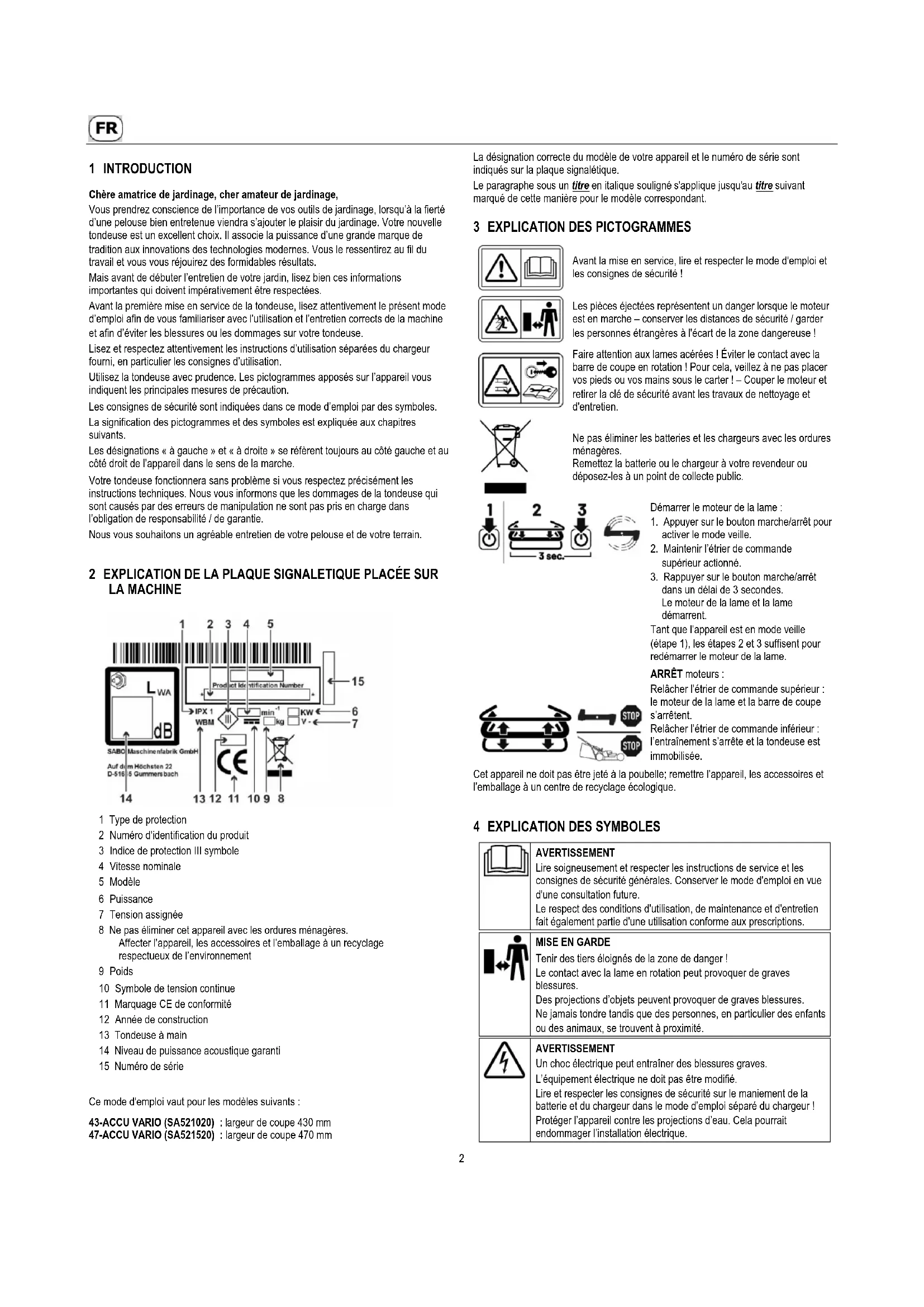 Ce mode d'emploi vaut pour les modèles suivants : 43-ACCU VARIO (SA521020) : largeur de coupe 430 mm 47-ACCU VARIO (SA521520) : largeur de coupe 470 mm La désignation correcte du modèle de votre appareil et le numéro de série sont indiqués sur la plaque signalétique. Le paragraphe sous un titre en italique souligné s'applique jusqu'au titre suivant marqué de cette manière pour le modèle correspondant.