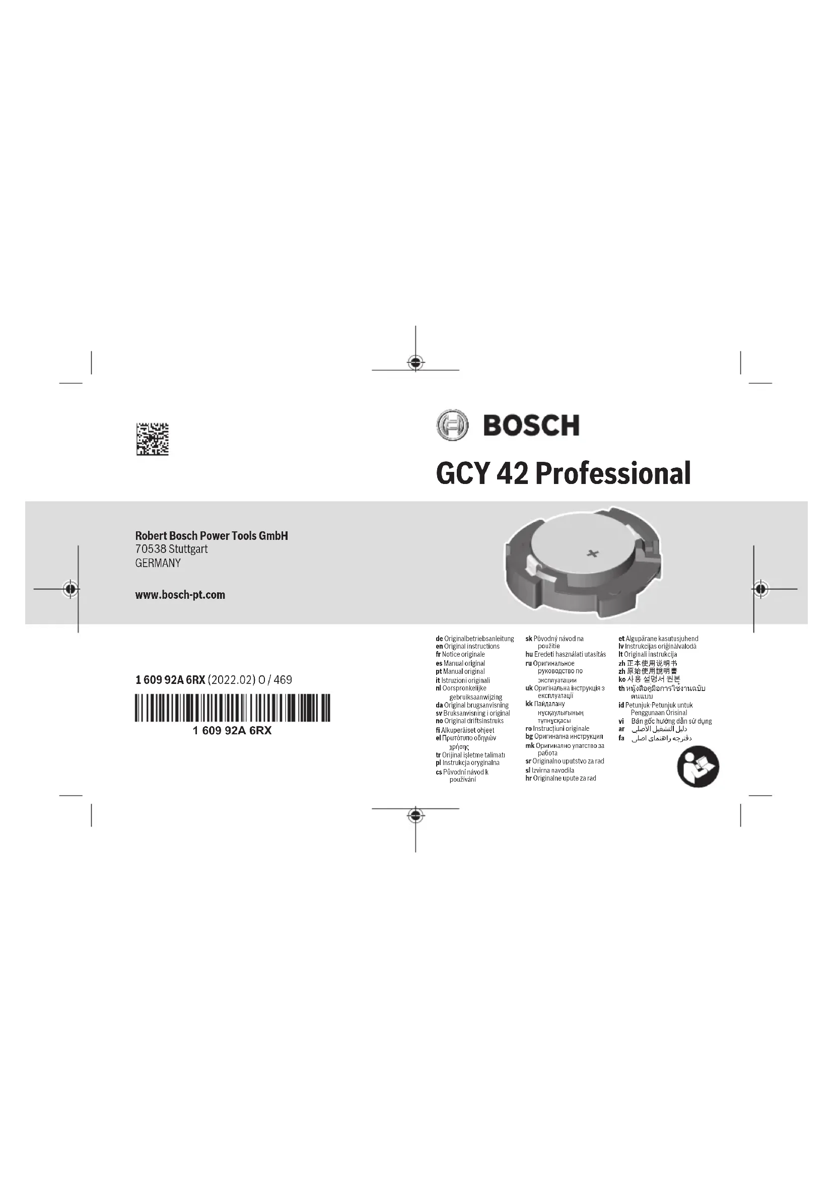 La portée peut varier sensiblement selon les conditions extérieures et le type de périphérique mobile utilisé. Dans une pièce fermée et à travers des barrières métalliques (par exemple, parois murales, étagères, coffres, etc.), la portée du Bluetooth® peut se trouver fortement réduite. Bosch Power Tools 1 609 92A 6RX | (21.02.2022)42 | Français Prérequis système GCY 42 Appareil mobile (tablette, smartphone) Android 6.0 (ou version ulté- rieure) iOS 11 (ou version ultérieure) Montage et mise en service Alimentation électrique u Enlevez le cache du Bluetooth® Low Energy Module GCY 42 sur l’outil électroportatif, p. ex. à l’aide d’un tourne- vis ou d’une grosse pièce de monnaie. L’utilisation d’ob- jets inappropriés peut endommager l’électronique ou le cache. – Pour la mise en service après l’achat ou après un change- ment de la pile (1), procédez comme représenté sur les pages graphiques. Respectez par ailleurs les informations qui suivent. Première mise en service (voir figures A1–A5) 1 609 92A 6RX | (21.02.2022) Bosch Power ToolsFrançais | 43 Remarque : Conservez bien le module factice (3) du module GCY 42. Remettez en place le module factice lorsque vous re- mettez à quelqu’un l’outil électroportatif sans GCY 42. Insérez la pile (1) dans le GCY 42 (2) avec le pôle positif orienté vers le haut. N’exercez pas de pression sur la pile ; elle ne s’enclenche pas. Elle ne se met dans la bonne position que lors de la fermeture du cache. Pour initialiser le GCY 42 après son insertion, actionnez l’inter- rupteur Marche/Arrêt de l’outil électroportatif. Remplacement de la pile (voir figures B1–B4) Retirez la pile usagée (1) seulement avec les doigts. Dans l’application mobile, un message d’avertissement signale quand la pile arrive en fin de vie. Retrait du module GCY 42 (voir figures C1–C2) Ne forcez pas pour retirer le GCY 42 (2). N’utilisez aucun objet pointu ou coupant. Remarque : Le retrait du GCY 42 peut être facilité en retour- nant l’outil électroportatif. Bosch Power Tools 1 609 92A 6RX | (21.02.2022)44 | Français Mise en marche Dès que la pile (1) a été insérée et que l’interrupteur Marche/ Arrêt de l’outil électroportatif a été actionné, le GCY 42 se met à émettre en continu un signal. Le signal Bluetooth® ne cesse d’être émis que quand la pile est déchargée, défectueuse ou a été retirée. Vous obtiendrez plus d’informations directement dans l’appli- cation mobile Bosch. Installation de l’application mobile Pour pouvoir utiliser le GCY 42, vous devez tout d’abord instal- ler l’application Bosch Toolbox. – Téléchargez l’application Bosch Toolbox sur une plate- forme de téléchargement (Apple App Store, Google Play Store). Remarque : Pour ce faire, vous devez disposer d’un compte utilisateur donnant accès à la plateforme de télécharge- ment. – Sélectionnez ensuite dans l’application le sous-menu My- Tools. 1 609 92A 6RX | (21.02.2022) Bosch Power ToolsFrançais | 45 – Sur l’écran de votre périphérique mobile (smartphone, ta- blette) sont alors indiquées toutes les étapes à suivre pour connecter l’outil électroportatif au périphérique. Remarque : Commencez par visionner intégralement le tuto- riel de l’application. Vous obtiendrez ainsi une bonne vue d’en- semble sur la procédure de connexion et l’utilisation des fonc- tions de connectivité. Transmission de données via Bluetooth® Le module GCY42 envoie un signal périodiquement. Le GCY 42 n’est parfois reconnu (dépend de l’environnement) qu’après l’envoi de plusieurs signaux. Si le GCY 42 n’est pas reconnu, vérifiez les points suivants: – La distance avec le périphérique mobile est-elle trop grande? Réduisez la distance entre le périphérique mobile et le GCY