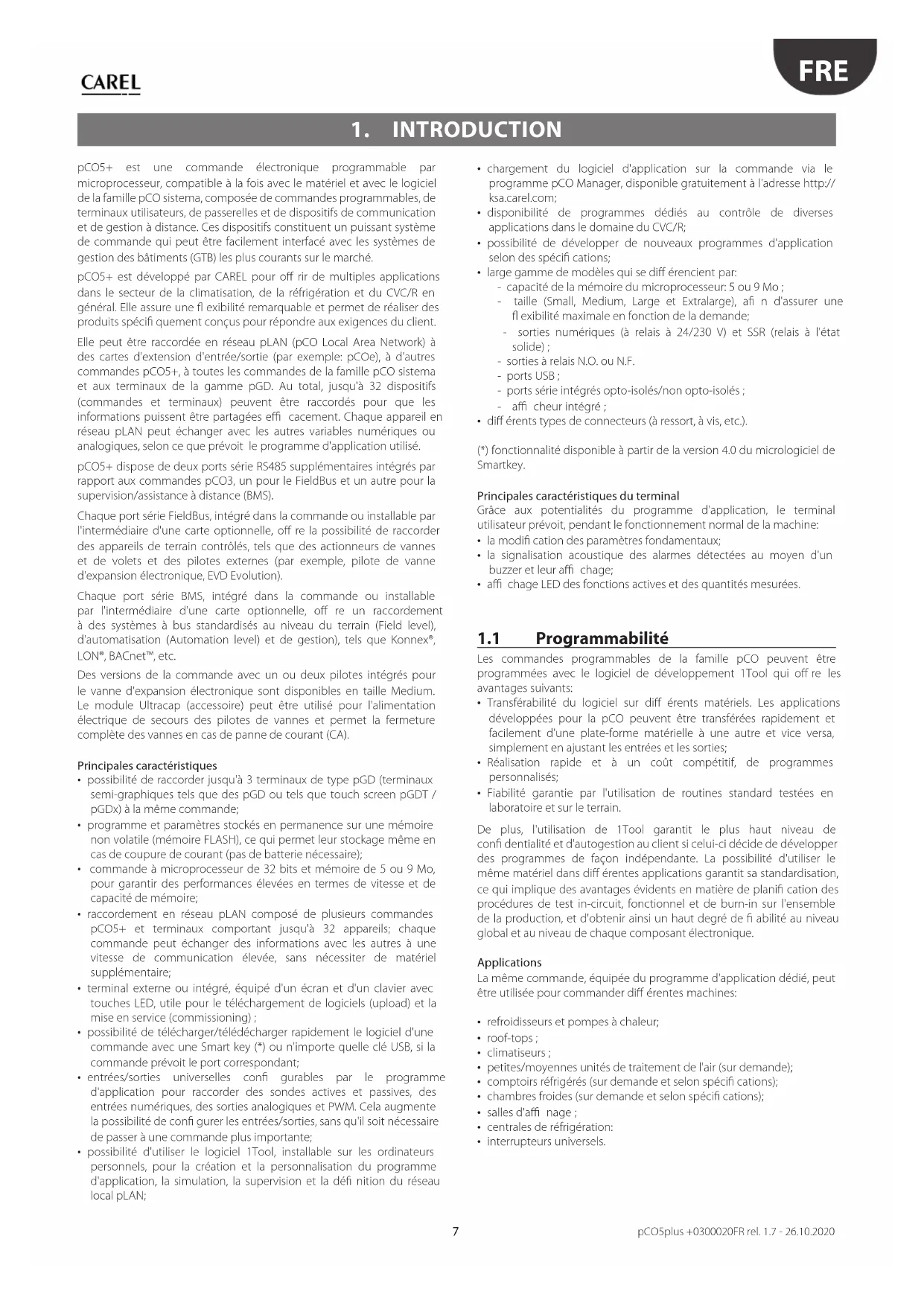 Integrated Control Solutions & Energy Savings pCO5+ NO POWER & SIGNAL CABLES TOGETHER READ CAREFULLY IN THE TEXT! Commande programmable Mode d'emploi3 FRE pCO5plus +0300020FR rel. 1.7 - 26.10.2020 AVERTISSEMENTS CAREL base le développement de ses produits sur plusieurs dizaines d'années d'expérience dans le secteur CVC, ur l'investissement continu en innovation technologique de produit, sur les procédures et processus rigoureux de qualité avec des essais en circuit et fonctionnels sur 100 % de sa production, sur les technologies de production les plus innovantes qui sont disponibles sur le marché. Cependant, CAREL et ses fi liales/franchises ne garantissent pas que tous les aspects du produit et du logiciel compris dans le produit répondront aux exigences de l'application fi nale, bien que le produit soit fabriqué conformément aux techniques et dans les règles de l'art. Le client (fabricant, concepteur ou installateur de l'équipement fi nal) assume toute la responsabilité et tous les risques liés à la confi guration du produit pour qu'il obtienne les résultats prévus dans le cadre de l'installation et/ou équipement fi nal spécifi que. Dans ce cas, CAREL peut intervenir, moyennant des accords spécifi ques préalables, en tant que conseiller pour la bonne réussite de la mise en service de la machine fi nale/application, mais ne peut en aucun cas être tenue responsable du bon fonctionnement de l'équipement/installation fi nale.Le produit CAREL est un produit de pointe, dont le fonctionnement est spécifi é dans la documentation technique fournie avec le produit ou télédéchargeable, même avant l'achat, sur le site internet www.carel.com. Étant donné leur niveau technologique avancé, tous les produits CAREL requièrent une phase de qualifi cation/confi guration/programmation/mise en service afi n de pouvoir fonctionner au mieux pour l'application spécifi que. L'absence de cette phase d'étude, comme indiquée dans le manuel, peut provoquer des dysfonctionnements dans les produits fi naux dont CAREL ne pourra être tenue responsable.Seul un personnel qualifi é peut installer ou eff ectuer des interventions d'assistance technique sur le produit.Le client fi nal ne doit utiliser le produit que selon les modalités décrites dans la documentation concernant ledit produit.Sans pour autant exclure l'obligation de respecter des mises en garde supplémentaires présentes dans le manuel, nous tenons à faire remarquer que dans tous les cas, et ce pour tout Produit CAREL, il faut: