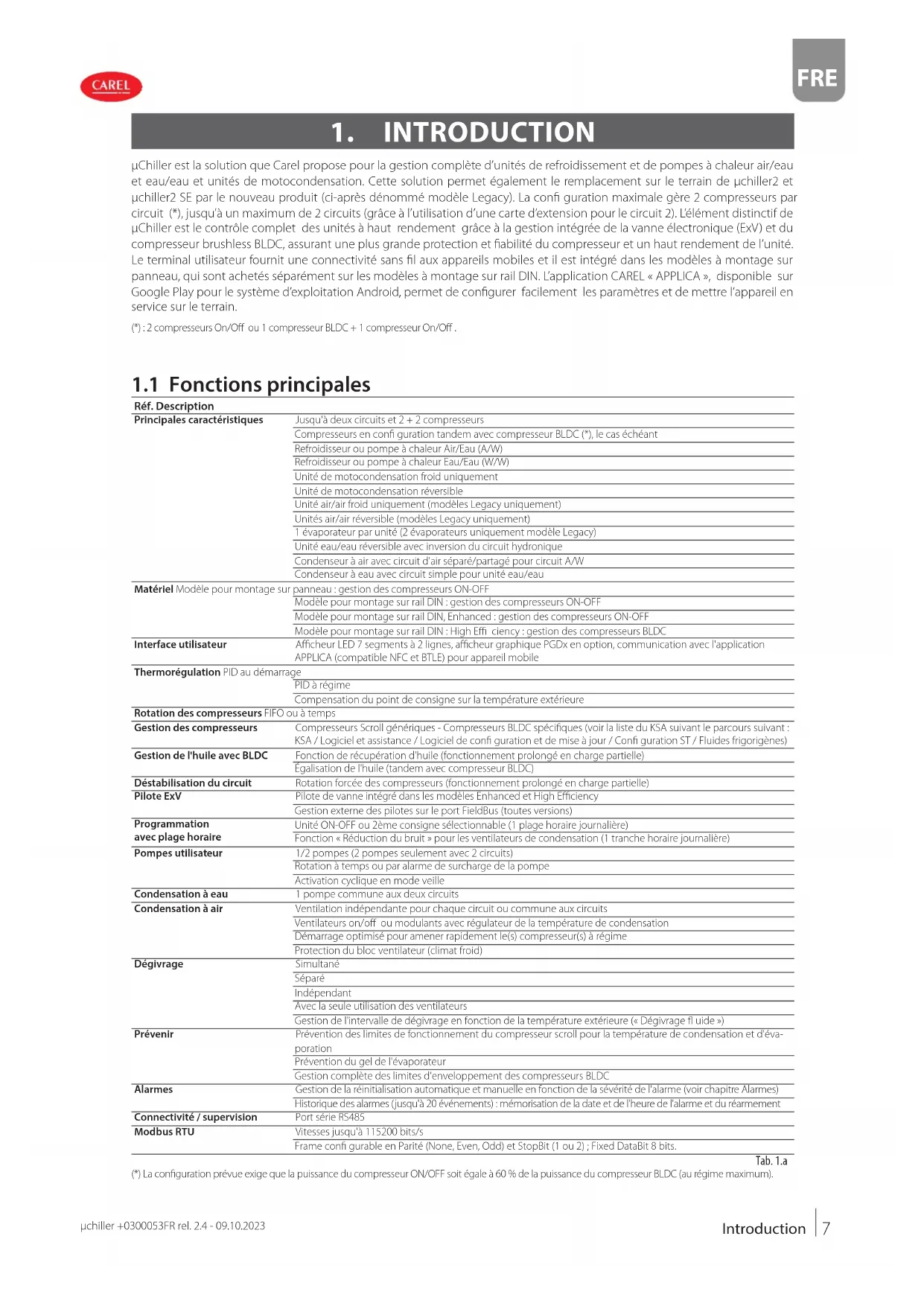 Réf. Description Principales caractéristiques Jusqu'à deux circuits et 2 + 2 compresseurs Compresseurs en confi guration tandem avec compresseur BLDC (*), le cas échéantRefroidisseur ou pompe à chaleur Air/Eau (A/W)Refroidisseur ou pompe à chaleur Eau/Eau (W/W)Unité de motocondensation froid uniquementUnité de motocondensation réversibleUnité air/air froid uniquement (modèles Legacy uniquement)Unités air/air réversible (modèles Legacy uniquement)1 évaporateur par unité (2 évaporateurs uniquement modèle Legacy)Unité eau/eau réversible avec inversion du circuit hydroniqueCondenseur à air avec circuit d'air séparé/partagé pour circuit A/WCondenseur à eau avec circuit simple pour unité eau/eauMatériel Modèle pour montage sur panneau : gestion des compresseurs ON-OFFModèle pour montage sur rail DIN : gestion des compresseurs ON-OFFModèle pour montage sur rail DIN, Enhanced : gestion des compresseurs ON-OFFModèle pour montage sur rail DIN : High Effi ciency : gestion des compresseurs BLDC Interface utilisateur Affi cheur LED 7 segments à 2 lignes, affi cheur graphique PGDx en option, communication avec l'application APPLICA (compatible NFC et BTLE) pour appareil mobileThermorégulation PID au démarragePID à régimeCompensation du point de consigne sur la température extérieureRotation des compresseurs FIFO ou à temps Gestion des compresseurs Compresseurs Scroll génériques - Compresseurs BLDC spécifi ques (voir la liste du KSA suivant le parcours suivant : KSA / Logiciel et assistance / Logiciel de confi guration et de mise à jour / Confi guration ST / Fluides frigorigènes) Gestion de l'huile avec BLDC Fonction de récupération d'huile (fonctionnement prolongé en charge partielle) Égalisation de l'huile (tandem avec compresseur BLDC) Déstabilisation du circuit Rotation forcée des compresseurs (fonctionnement prolongé en charge partielle) Pilote ExV Pilote de vanne intégré dans les modèles Enhanced et High Effi ciency Gestion externe des pilotes sur le port FieldBus (toutes versions)Programmation avec plage horaireUnité ON-OFF ou 2ème consigne sélectionnable (1 plage horaire journalière)Fonction « Réduction du bruit » pour les ventilateurs de condensation (1 tranche horaire journalière) Pompes utilisateur 1/2 pompes (2 pompes seulement avec 2 circuits) Rotation à temps ou par alarme de surcharge de la pompeActivation cyclique en mode veille Condensation à eau 1 pompe commune aux deux circuits Condensation à air Ventilation indépendante pour chaque circuit ou commune aux circuits Ventilateurs on/off ou modulants avec régulateur de la température de condensation Démarrage optimisé pour amener rapidement le(s) compresseur(s) à régimeProtection du bloc ventilateur (climat froid)Dégivrage SimultanéSéparéIndépendantAvec la seule utilisation des ventilateursGestion de l'intervalle de dégivrage en fonction de la température extérieure (« Dégivrage fl uide ») Prévenir Prévention des limites de fonctionnement du compresseur scroll pour la température de condensation et d'éva- porationPrévention du gel de l'évaporateurGestion complète des limites d'enveloppement des compresseurs BLDC Alarmes Gestion de la réinitialisation automatique et manuelle en fonction de la sévérité de l'alarme (voir chapitre Alarmes) Historique des alarmes (jusqu'à 20 événements) : mémorisation de la date et de l'heure de l'alarme et du réarmement Connectivité / supervision Port série RS485 Modbus RTU Vitesses jusqu'à 115200 bits/s Frame confi gurable en Parité (None, Even, Odd) et StopBit (1 ou 2) ; Fixed DataBit 8 bits.Tab. 1.a (*) La confi guration prévue exige que la puissance du compresseur ON/OFF soit égale à 60 % de la puissance du compresseur BLDC (au régime maximum).