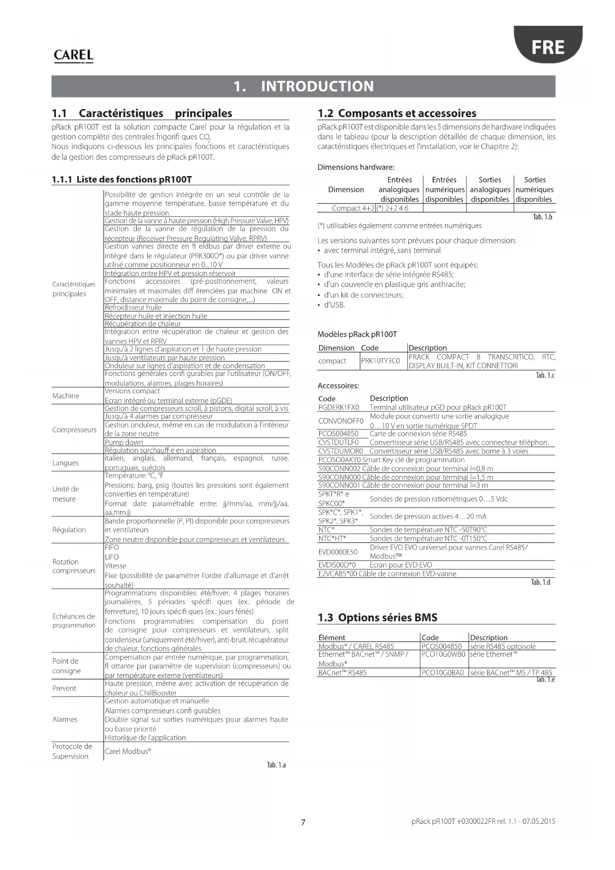 - d'USB. Modèles pRack pR100T Dimension Code Description compact PRK10TY3C0PRACK COMPACT B TRANSCRITICO, RTC, DISPLAY BUILT-IN, KIT CONNETTORI Tab. 1.c Accessoires: Code Description PGDERK1FX0 Terminal utilisateur pGD pour pRack pR100TCONVONOFF0Module pour convertir une sortie analogique 0…10 V en sortie numérique SPDTPCOS004850 Carte de connexion série RS485CVSTDUTLF0 Convertisseur série USB/RS485 avec connecteur téléphon.CVSTDUMOR0 Convertisseur série USB/RS485 avec borne à 3 voiesPCOSO0AKY0 Smart Key clé de programmationS90CONN002 Câble de connexion pour terminal l=0,8 mS90CONN000 Câble de connexion pour terminal l=1,5 mS90CONN001 Câble de connexion pour terminal l=3 mSPKT*R* e SPKC00*Sondes de pression ratiométriques 0…5 VdcSPK*C*, SPK1*, SPK2*, SPK3*Sondes de pression actives 4…20 mANTC* Sondes de température NTC -50T90°CNTC*HT* Sondes de température NTC -0T150°CEVD0000E50Driver EVD EVO universel pour vannes Carel RS485/ModbusEVDIS00D*0 Ecran pour EVD EVOE2VCABS*00 Câble de connexion EVD-vanne Tab. 1.d