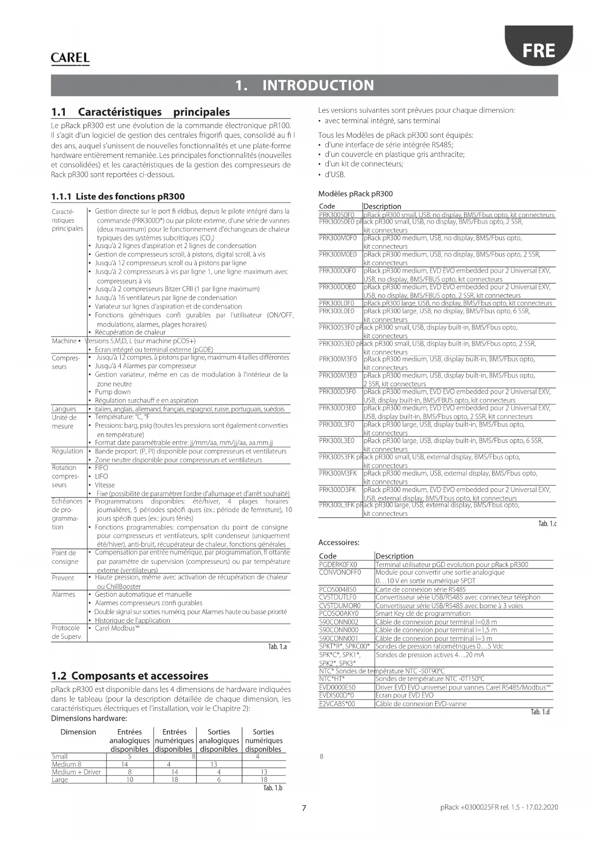 - d’USB. Modèles pRack pR300 Code Description PRK300S0F0 pRack pR300 small, USB, no display, BMS/Fbus opto, kit connecteurs PRK300S0E0 pRack pR300 small, USB, no display, BMS/Fbus opto, 2 SSR, kit connecteursPRK300M0F0 pRack pR300 medium, USB, no display, BMS/Fbus opto, kit connecteurs PRK300M0E0 pRack pR300 medium, USB, no display, BMS/Fbus opto, 2 SSR, kit connecteurs PRK300D0F0 pRack pR300 medium, EVD EVO embedded pour 2 Universal EXV, USB, no display, BMS/FBUS opto, kit connecteurs PRK300D0E0 pRack pR300 medium, EVD EVO embedded pour 2 Universal EXV, USB, no display, BMS/FBUS opto, 2 SSR, kit connecteurs PRK300L0F0 pRack pR300 large, USB, no display, BMS/Fbus opto, kit connecteurs PRK300L0E0 pRack pR300 large, USB, no display, BMS/Fbus opto, 6 SSR, kit connecteurs PRK300S3F0 pRack pR300 small, USB, display built-in, BMS/Fbus opto, kit connecteurs PRK300S3E0 pRack pR300 small, USB, display built-in, BMS/Fbus opto, 2 SSR, kit connecteurs PRK300M3F0 pRack pR300 medium, USB, display built-in, BMS/Fbus opto, kit connecteurs PRK300M3E0 pRack pR300 medium, USB, display built-in, BMS/Fbus opto, 2 SSR, kit connecteurs PRK300D3F0 pRack pR300 medium, EVD EVO embedded pour 2 Universal EXV, USB, display built-in, BMS/FBUS opto, kit connecteursPRK300D3E0 pRack pR300 medium, EVD EVO embedded pour 2 Universal EXV, USB, display built-in, BMS/Fbus opto, 2 SSR, kit connecteurs PRK300L3F0 pRack pR300 large, USB, display built-in, BMS/Fbus opto, kit connecteurs PRK300L3E0 pRack pR300 large, USB, display built-in, BMS/Fbus opto, 6 SSR, kit connecteurs PRK300S3FK pRack pR300 small, USB, external display, BMS/Fbus opto, kit connecteurs PRK300M3FK pRack pR300 medium, USB, external display, BMS/Fbus opto, kit connecteurs PRK300D3FK pRack pR300 medium, EVD EVO embedded pour 2 Universal EXV, USB, external display, BMS/Fbus opto, kit connecteurs PRK300L3FK pRack pR300 large, USB, external display, BMS/Fbus opto, kit connecteurs Tab. 1.c Accessoires: Code Description PGDERK0FX0 Terminal utilisateur pGD evolution pour pRack pR300CONVONOFF0 Module pour convertir une sortie analogique 0…10 V en sortie numérique SPDTPCOS004850 Carte de connexion série RS485CVSTDUTLF0 Convertisseur série USB/RS485 avec connecteur téléphonCVSTDUMOR0 Convertisseur série USB/RS485 avec borne à 3 voiesPCOSO0AKY0 Smart Key clé de programmationS90CONN002 Câble de connexion pour terminal l=0,8 mS90CONN000 Câble de connexion pour terminal l=1,5 mS90CONN001 Câble de connexion pour terminal l=3 mSPKT*R*, SPKC00* Sondes de pression ratiométriques 0…5 VdcSPK*C*, SPK1*, SPK2*, SPK3*Sondes de pression actives 4…20 mANTC* Sondes de température NTC -50T90°CNTC*HT* Sondes de température NTC -0T150°CEVD0000E50 Driver EVD EVO universel pour vannes Carel RS485/Modbus™EVDIS00D*0 Ecran pour EVD EVOE2VCABS*00 Câble de connexion EVD-vanne Tab. 1.d8 pRack +0300025FR rel. 1.5 - 17.02.2020 FRE