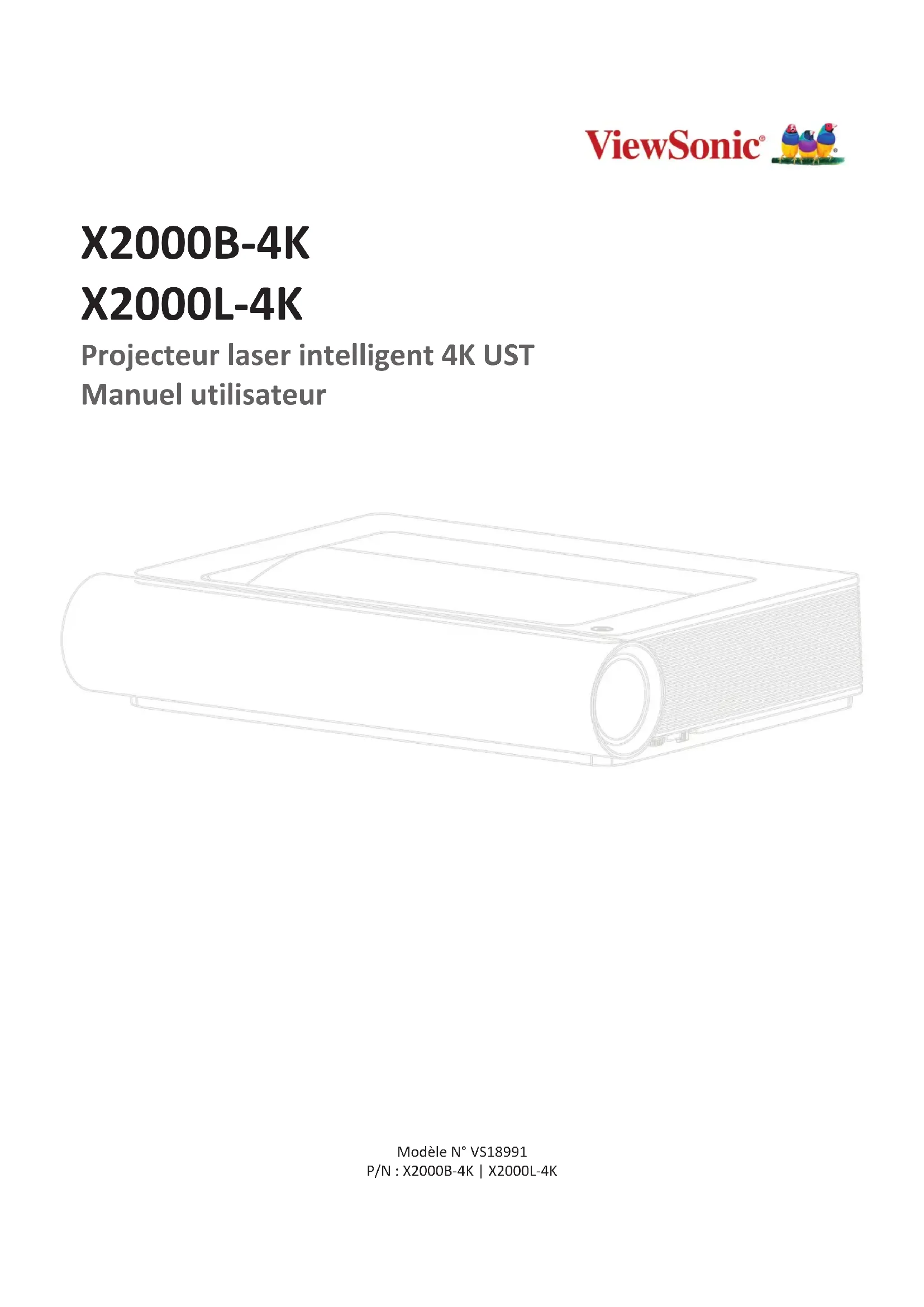 X2000B-4K X2000L-4K Projecteur laser intelligent 4K UST Manuel utilisateur Modèle N° VS18991 P/N : X2000B-4K | X2000L-4K2 Merci d’avoir choisi ViewSonic® En tant que leader mondial de solutions visuelles, ViewSonic® se consacre à dépasser les attentes du monde en matière d’évolution technologique, d’innovation et de simplicité. Chez ViewSonic®, nous pensons que nos produits peuvent avoir un impact positif dans le monde et nous sommes convaincus que le produit ViewSonic® que vous avez choisi vous servira correctement. Une fois de plus, merci d’avoir choisi ViewSonic® !3 Précauons relaves à la sécurité Veuillez lire les Précauons de sécurité suivantes avant de commencer à uliser le projecteur.