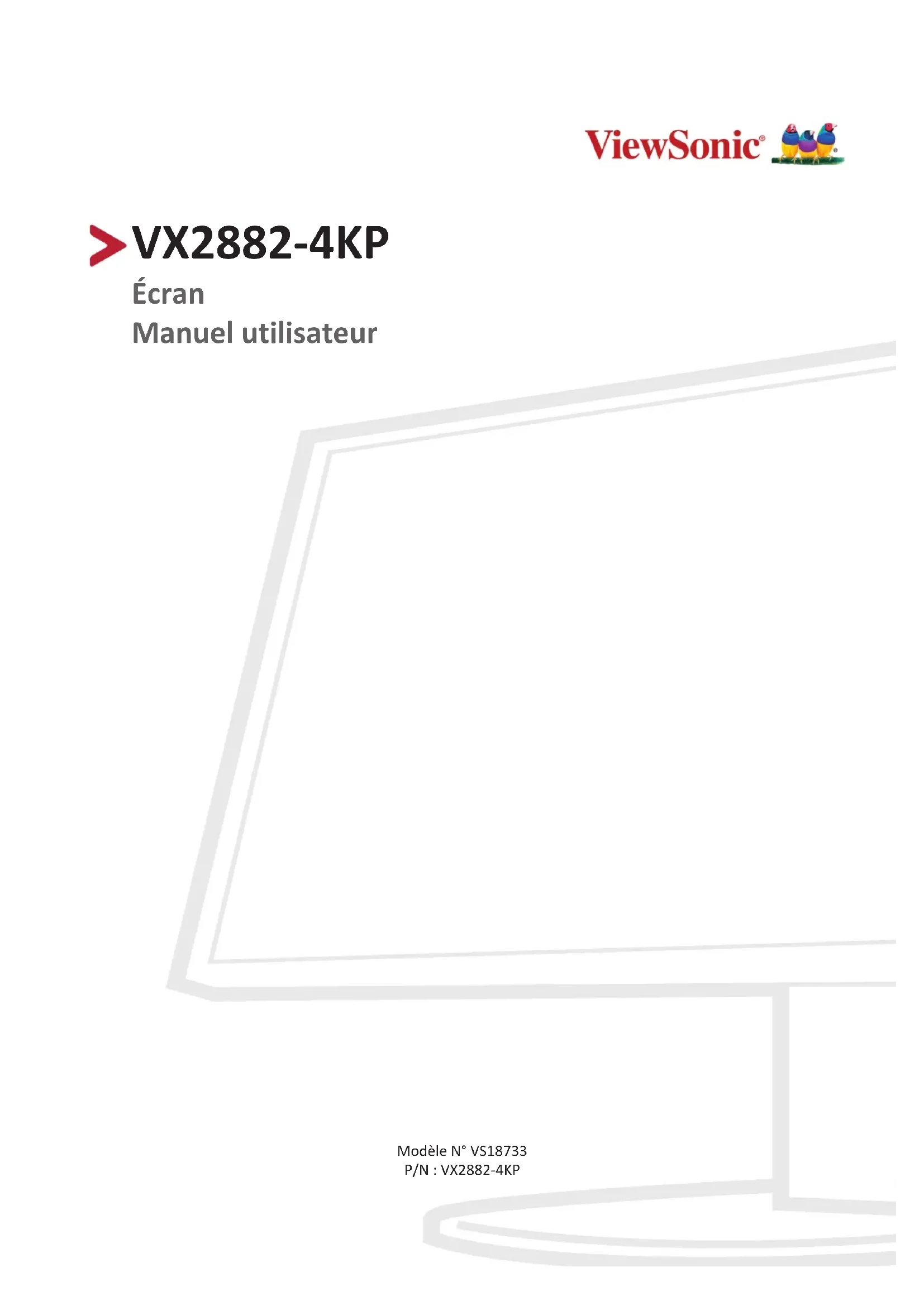 VX2882-4KP Écran Manuel utilisateur Modèle N° VS18733 P/N : VX2882-4KP2 Merci d’avoir choisi ViewSonic® En tant que leader mondial de solutions visuelles, ViewSonic® se consacre à dépasser les attentes du monde en matière d’évolution technologique, d’innovation et de simplicité. Chez ViewSonic®, nous pensons que nos produits peuvent avoir un impact positif dans le monde et nous sommes convaincus que le produit ViewSonic® que vous avez choisi vous servira correctement. Une fois de plus, merci d’avoir choisi ViewSonic® !3 Précauons relaves à la sécurité Veuillez lire les Précautions de sécurité qui suivent avant de commencer à utiliser l’appareil.