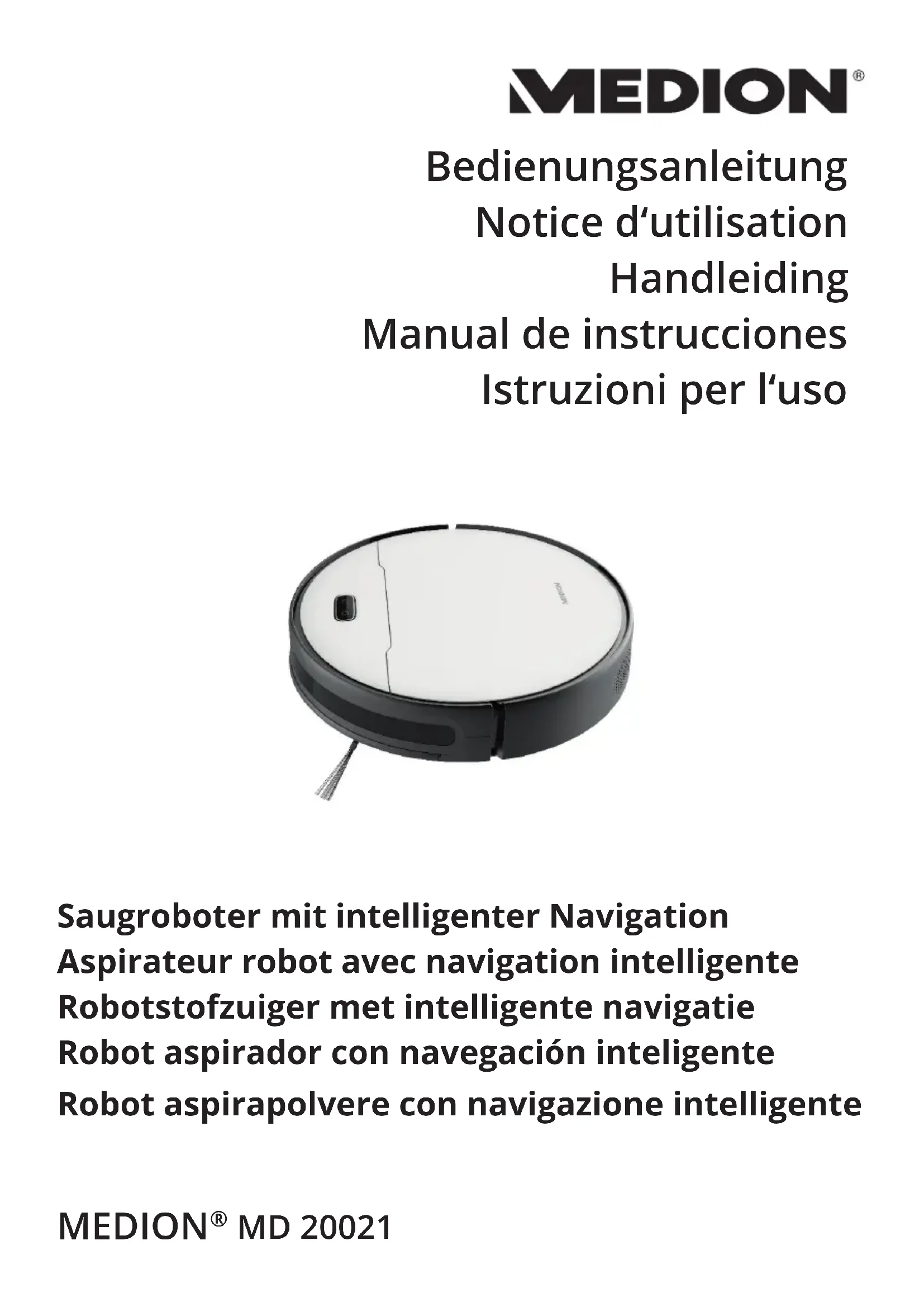 Si vous constatez un dommage causé lors du transport, adres- sez-vous immédiatement au SAV MEDION. En cas d’absence prolongée ou d’orage, débranchez le bloc d’alimentation de la prise de courant. Ne plongez jamais l’aspirateur robot, la station de charge ou le bloc d’alimentation dans l’eau ou tout autre liquide! Avant le nettoyage, l’entretien ou le montage/démontage d’un accessoire, débranchez le bloc d’alimentation de la prise de courant. AVERTISSEMENT! Risque d’explosion! L’aspiration de liquides inflammables ou de certaines matières solides présente un risque d’incendie ou d’ex- plosion. N’utilisez pas l’appareil à proximité de matériaux facilement inflammables. N’aspirez pas d’objets à arêtes saillantes ou facilement inflam- mables tels que des allumettes, des cendres chaudes ou de l’essence. N’aspirez en aucun cas de la poussière de toner (imprimante laser, photocopieuse). ATTENTION! Risque de blessure/d’endommagement de l’appa- reil! Toute manipulation incorrecte présente un risque de blessure ou peut endommager l’appareil. N’utilisez l’appareil que pour aspirer de petites quantités de poussière, de saleté et de miettes. Videz le bac à poussière après chaque utilisation. N’utilisez pas l’appareil pour aspirer des liquides ou de la poussière humide. Laissez sécher complètement les tapis net- toyés à l’eau avant d’aspirer. 20021 ML DS ML Content 5006 7881 RC2.indb 5520021 ML DS ML Content 5006 7881 RC2.indb 55 18.05.2021 14:38:4718.05.2021 14:38:4756 Pour éviter les risques de trébuchement, n’utilisez pas de ral- longe et informez les personnes présentes que l’aspirateur ro- bot est en marche. Avant la mise en marche, éloignez de la surface à nettoyer tous les objets fragiles (p. ex. verre, lampes, vases) et ceux pouvant se coincer dans les brosses ou être aspirés (p. ex. cor- dons, vêtements, journaux, rideaux). Ne couvrez pas les capteurs et fentes d’aération de l’aspira- teur robot.