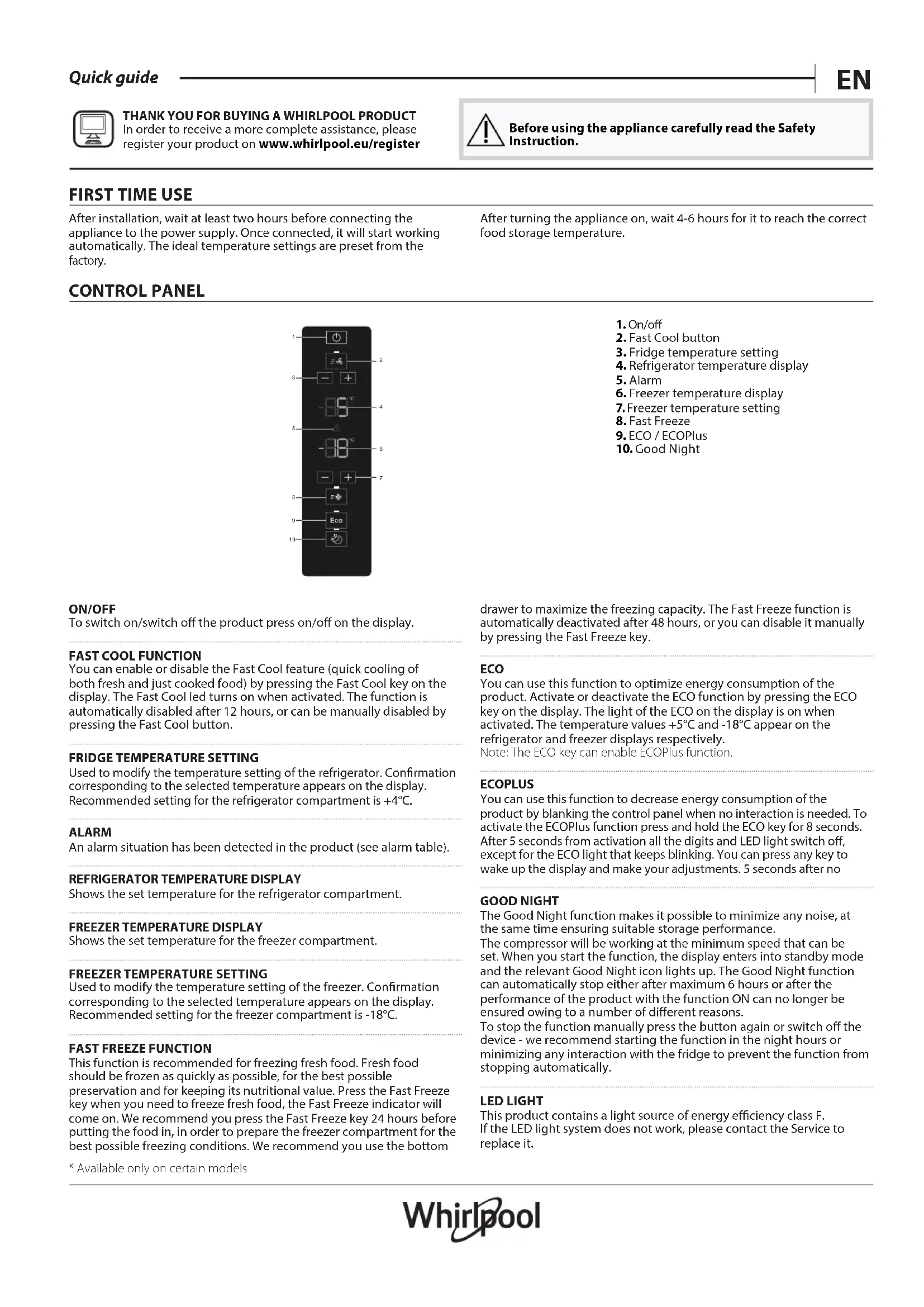 - Disponible sur certains modèles uniquement MERCI D’AVOIR CHOISI UN PRODUIT WHIRLPOOL An de proter d’une assistance complète, veuillez enregistrer votre appareil sur www . whirlpool . eu/ register Lisez attentivement les consignes de sécurité avant d’utiliser l’appareil.