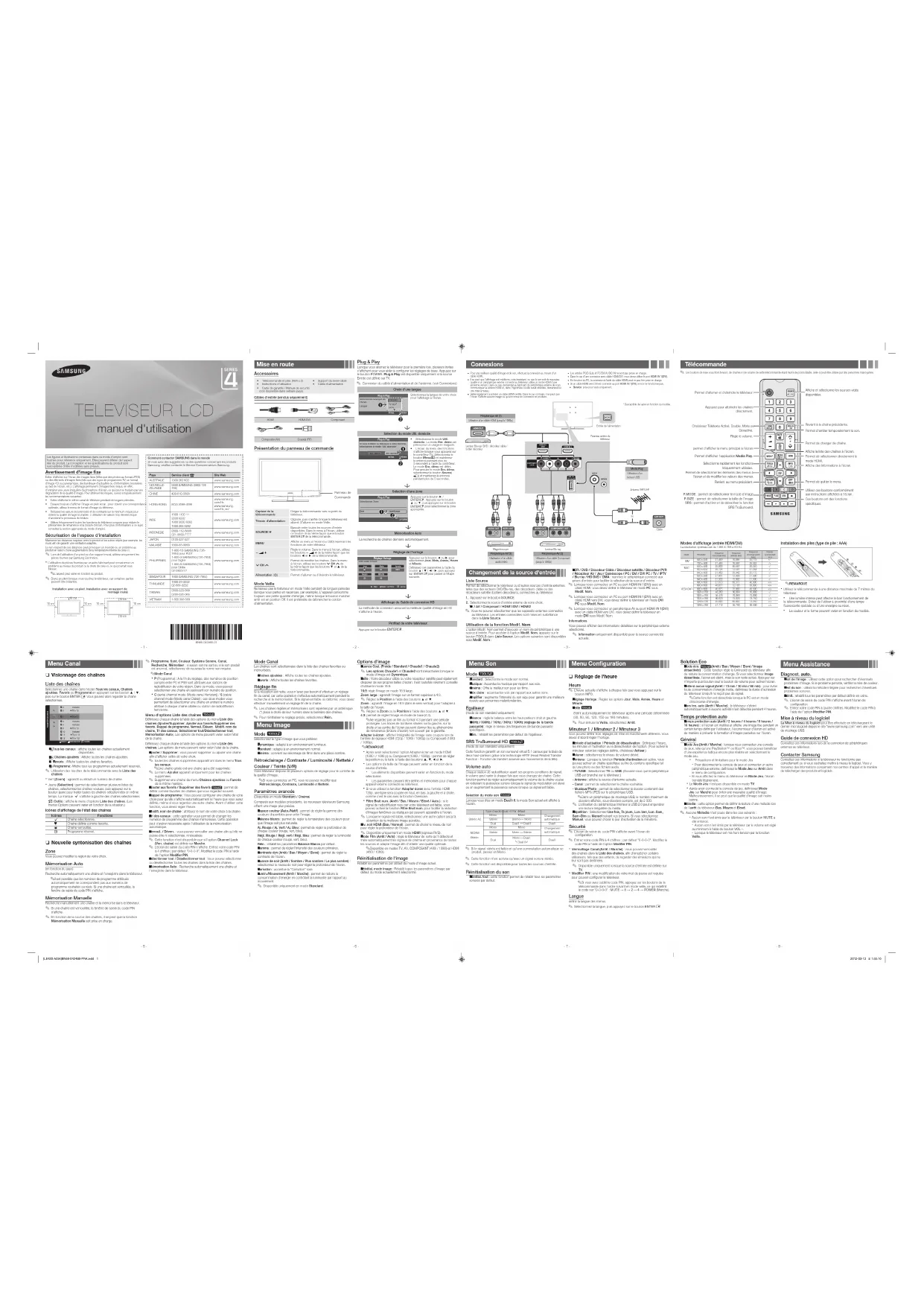 Solution Eco ■Mode éco. (Arrêt / Bas / Moyen / Elevé / Image désactivée) : Cette fonction règle la luminosité du téléviseur afin de réduire la consommation d'énergie. Si vous sélectionnez Image désactivée, l'écran est éteint, mais le son reste activé. Appuyez sur n'importe quel bouton sauf le bouton de volume pour activer l'écran. ■Veille si aucun signal (Arrêt / 15 min / 30 min / 60 min): pour éviter toute consommation d'énergie inutile, définissez la durée d'activation du téléviseur lorsqu'il ne reçoit pas de signal. ✎ Cette fonction est désactivée lorsque le PC est en mode d'économie d'énergie. ■Hors ten. auto (Arrêt / Marche): le téléviseur s'éteint automatiquement si aucune activité n'est détectée pendant 4heures.Temps protection auto ■Temps protection auto (Arrêt /2heures / 4heures / 8heures / 10heures): si l'écran est inutilisé et affiche une image fixe pendant un certain temps défini par l'utilisateur, l'économiseur d'écran est activé de manière à prévenir la formation d'images parasites sur l'écran.Général ■Mode Jeu (Arrêt / Marche): lorsque vous connectez une console de jeux, telle qu'une PlayStation™ ou Xbox™, vous pouvez bénéficier d'une expérience ludique encore plus réaliste en sélectionnant le mode Jeu. x Précautions et limitations pour le mode Jeu - Pour déconnecter la console de jeux et connecter un autre périphérique externe, définissez le Mode Jeu sur Arrêt dans le menu de configuration. - Si vous affichez le menu du téléviseur en Mode Jeu, l'écran tremble légèrement. x Le Mode Jeu n'est pas disponible en mode TV. x Après avoir connecté la console de jeu, définissez Mode Jeu sur Marche pour éviter une mauvaise qualité d'image. Malheureusement, il se peut que la qualité d'image soit moins bonne. ■Mélodie: cette option permet de définir la lecture d'une mélodie lors de l'arrêt du téléviseur (Bas, Moyen et Elevé). ✎ Aucune Mélodie n'est jouée dans les cas suivants : - Aucun son n'est émis par le téléviseur car le bouton MUTE a été enfoncé. - Aucun son n'est émis par le téléviseur car le volume est réglé au minimum à l'aide du bouton VOL –. - Lorsque le téléviseur est mis hors tension par la fonction Veille. Menu Assistance Diagnost. auto. ■Test de l'image: utilisez cette option pour rechercher d'éventuels problèmes d'image. Si le problème persiste, vérifiez la mire de couleur. ■Test du son: utilisez la mélodie intégrée pour rechercher d'éventuels problèmes sonores. ■Réinit.: rétablit tous les paramètres par défaut définis en usine. ✎ L'écran de saisie du code PIN s'affiche avant l'écran de configuration. ✎ Entrez votre code PIN à quatre chiffres. Modifiez le code PIN à l'aide de l'option Modifier PIN.Mise à niveau du logicielLa Mise à niveau du logiciel peut être effectuée en téléchargeant le dernier micrologiciel depuis le site "www.samsung.com" vers une unité de stockageUSB. Guide de connexion HDConsultez ces informations lors de la connexion de périphériques externes au téléviseur.Contacter SamsungConsultez ces informations si le téléviseur ne fonctionne pas correctement ou si vous souhaitez mettre à niveau le logiciel. Vous y trouverez des informations concernant nos centres d'appel et la manière de télécharger des produits et logiciels. TELEVISEUR LCD manuel d'utilisation Mise en route Accessoires• Télécommande et piles (AAAx2)• Instructions d'utilisation• Carte de garantie/Manuel de sécurité (non disponible dans certains pays)• Support du serre-câble• Câble d'alimentationCâbles d'entrée (vendus séparément)HDMI HDMI-DVI ComposantComposite (AV) Coaxial (RF)Présentation du panneau de commandePanneau de CommandeCapteur de la télécommandeDirigez la télécommande vers ce point du téléviseur.Témoin d’alimentationClignote, puis s'arrête lorsque le téléviseur est allumé. S'allume en mode Veille.SOURCE Bascule entre toutes les sources d'entrée disponibles. Dans le menu à l'écran, utilisez ce bouton de la même façon que le bouton ENTER de la télécommande. MENU Affiche un menu à l'écran (ou OSD) reprenant les fonctions de votre téléviseur. Règle le volume. Dans le menu à l'écran, utilisez les boutons de la même façon que les boutons ◄ et ► de la télécommande. Permet de modifier les chaînes. Dans le menu à l'écran, utilisez les boutons