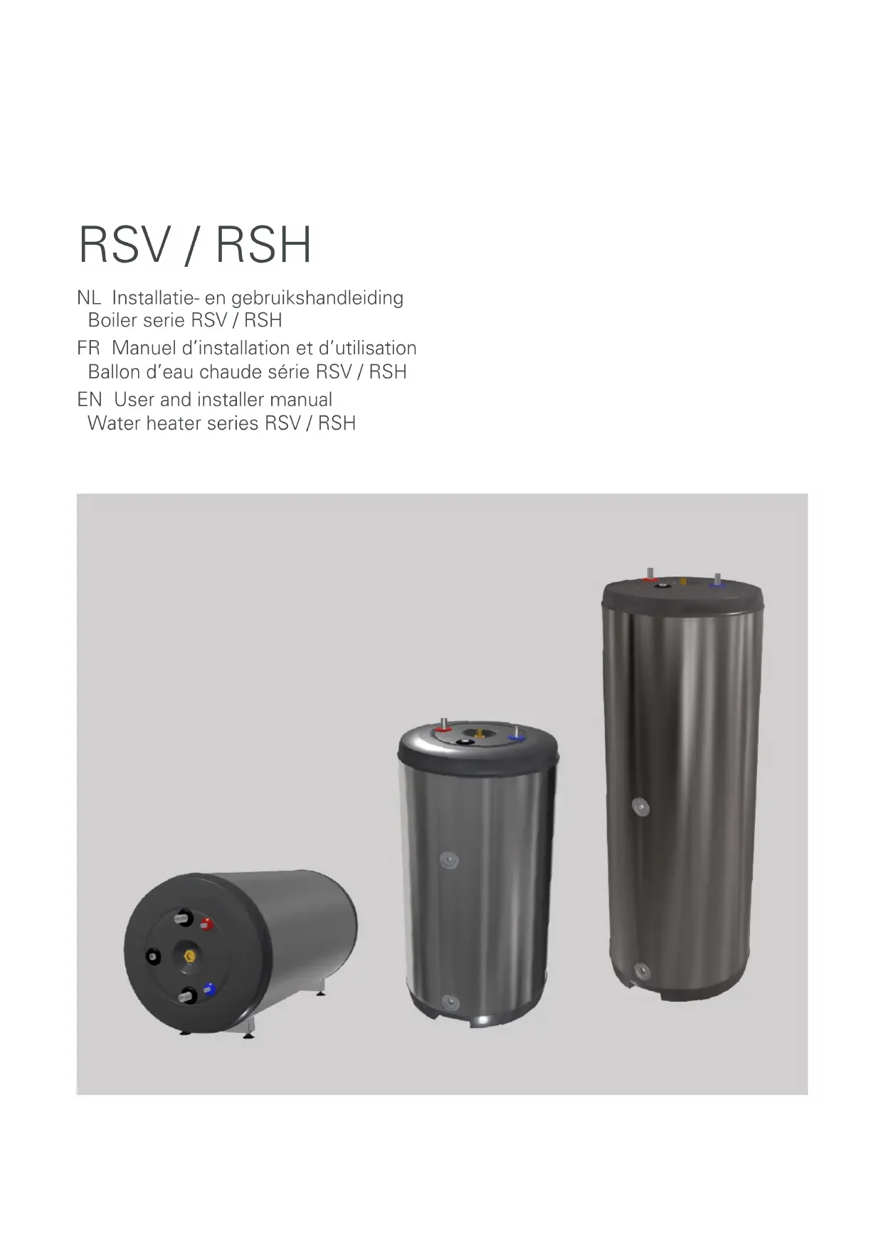 2 Delivery and handling Remember to rotate the cylinder in a direction that allows easy access to the immersion heater and theelectrical box. transported and stored vertically ina dry place. The Titanium HA - WH5 F / FS should be Généralités Ces ballons ECS avec une spirale à chauffage indirect de la série RSV/RSH peut être connectée à une source de chaleur externe, telle qu’une pompe à chaleur air/eau NIBE ou une pompe à chaleur eau/eau solo de NIBE. Le ballon ECS est dotée d’une enveloppe métallique extérieure d’aspect acier inoxydable et d’un réservoir interne en acier inoxydable (sans anode) qui est traité intérieurement pour une résistance accrue à la corrosion. Une coque isolante en polyuréthane (PUR) assure une excellente isolation thermique, tandis qu’un serpentin de chauffage en acier inoxydable assure un transfert de chaleur efficace. La coque isolante et la enveloppe extérieure ne doivent pas être retirées (par exemple à des fins de transport). Le ballon ECS est adaptée à une pression d’arrêt maximale de 10 bars dans le ballon et de 10 bars sur le côté primaire. La température maximale autorisée est de 85°C. Le modèle RSV est équipé d’un doigt de gant pour les capteurs destinés au contrôle et à l’affichage externes du chauffage de l’eau chaude sanitaire. Le modèle RSH est équipé d’un doigt de gant pour une sonde pour le contrôle externe du chauffage de l’eau chaude sanitaire.14 Model Navn