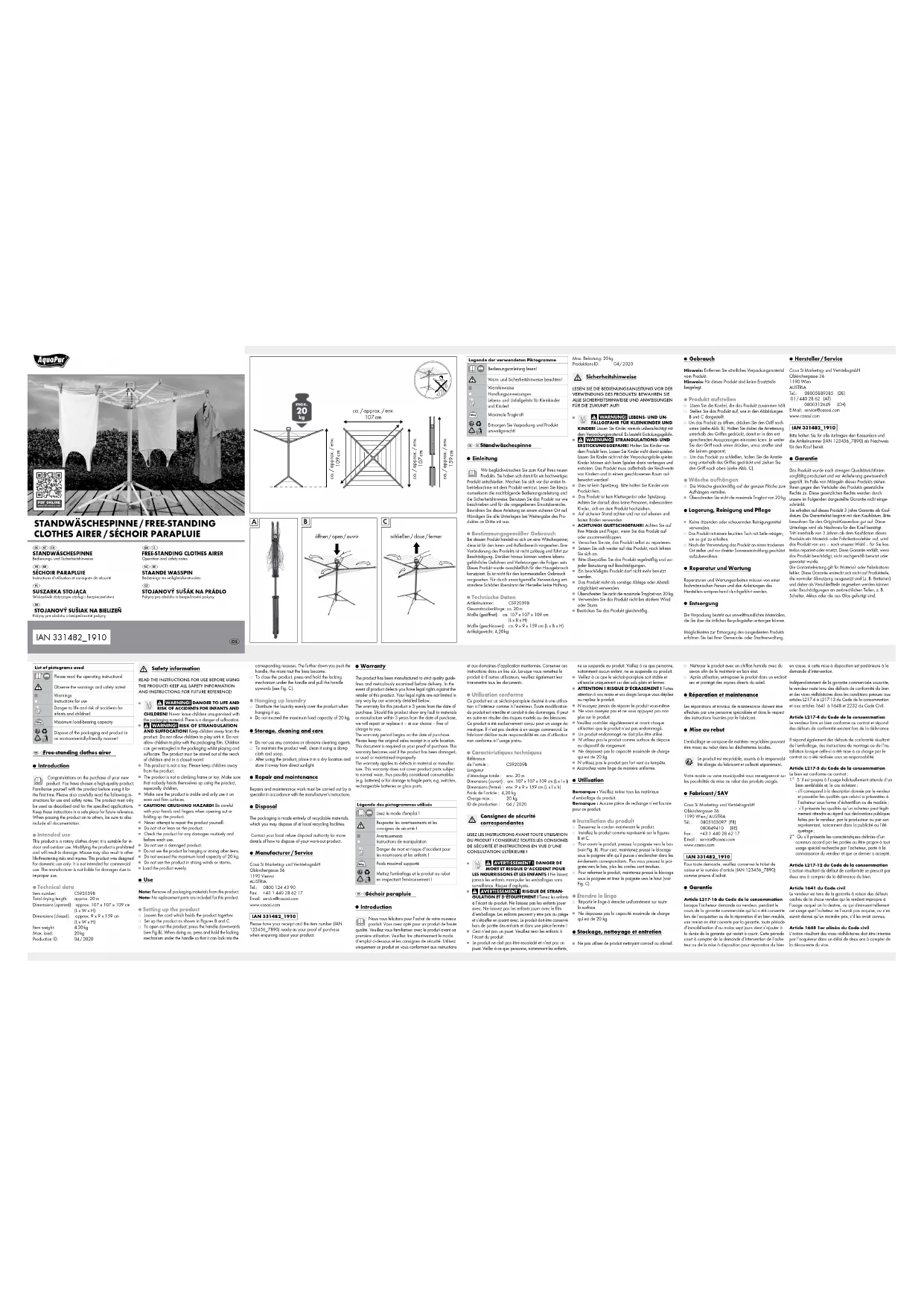 PAP Mettez l'emballage et le produit au rebut en respectant l'environnement! Séchoir parapluie Introduction Nous vous félicitons pour l‘achat de votre nouv eau produit. Vous avez opté pour un produit de haute qualité. Veuillez vous familiariser avec le produit avant sa première utilisation. Veuillez lire attentivement le mode d‘emploi ci-dessous et les consignes de sécurité. Utilisez uniquement ce produit en vous conformant aux instructions Nettoyer le produit avec un chiffon humide avec du savon afin de le maintenir en bon état. Après utilisation, entreposer le produit dans un endroit sec et protégé des rayons directs du soleil. Réparation et maintenance Les réparations et travaux de maintenance doivent être effectués par une personne spécialisée et dans le respect des instructions fournies par le fabricant. Mise au rebut L’emballage se compose de matières recyclables pouvant être mises au rebut dans les déchetteries locales. Le produit est recyclable, soumis à la responsabi- lité élargie du fabricant et collecté séparément. Votre mairie ou votre municipalité vous renseigneront sur les possibilités de mise au rebut des produits usagés. Fabricant / SAV Casa Si Marketing- und VertriebsgmbH Obkirchergasse 36 1190 Wien / AUSTRIA Tél. : 0805103097 (FR) 080049410 (BE) Fax : +43 1 440 28 62 17 E-mail : service@casasi.com www.casasi.com IAN 331482_1910 Pour toute demande, veuillez conserver le ticket de caisse et le numéro d‘article (IAN 123456_7890) comme preuve d‘achat. Garantie Article L217-16 du Code de la consommation Lorsque l‘acheteur demande au vendeur, pendant le cours de la garantie commerciale qui lui a été consentie lors de l‘acquisition ou de la réparation d‘un bien meuble, une remise en état couverte par la garantie, toute période d‘immobilisation d‘au moins sept jours vient s‘ajouter à la durée de la garantie qui restait à courir. Cette période court à compter de la demande d‘intervention de l‘ache- teur ou de la mise à disposition pour réparation du bien en cause, si cette mise à disposition est postérieure à la demande d‘intervention. Indépendamment de la garantie commerciale souscrite, le vendeur reste tenu des défauts de conformité du bien et des vices rédhibitoires dans les conditions prévues aux articles L217-4 à L217-13 du Code de la consommation et aux articles 1641 à 1648 et 2232 du Code Civil. Article L217-4 du Code de la consommation Le vendeur livre un bien conforme au contrat et répond des défauts de conformité existant lors de la délivrance. Il répond également des défauts de conformité résultant de l‘emballage, des instructions de montage ou de l‘ins- tallation lorsque celle-ci a été mise à sa charge par le contrat ou a été réalisée sous sa responsabilité. Article L217-5 du Code de la consommation Le bien est conforme au contrat : 1° S´il est propre à l‘usage habituellement attendu d‘un bien semblable et, le cas échéant :