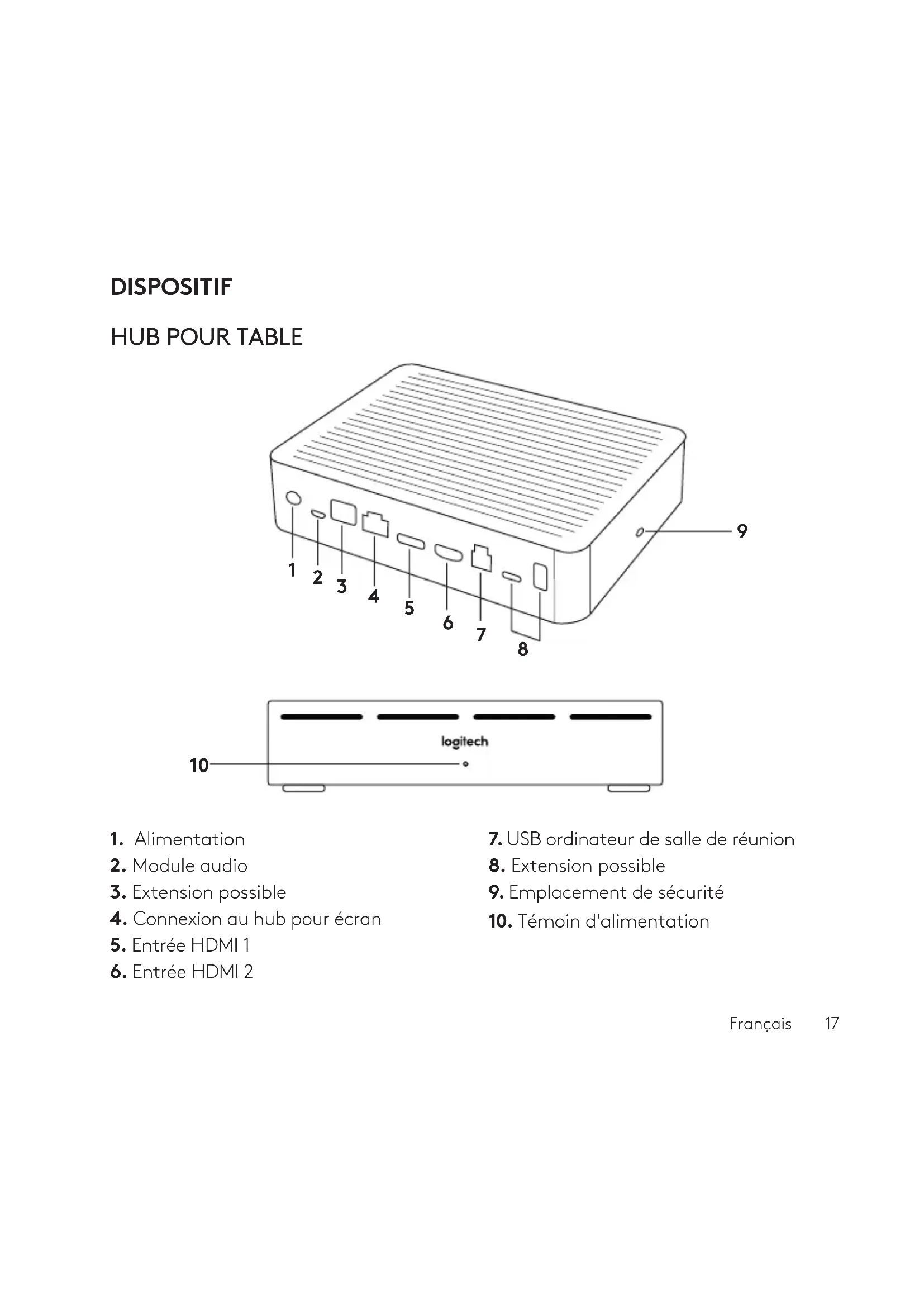 le hub pour table, le hub pour écran, la caméra et les haut-parleurs.