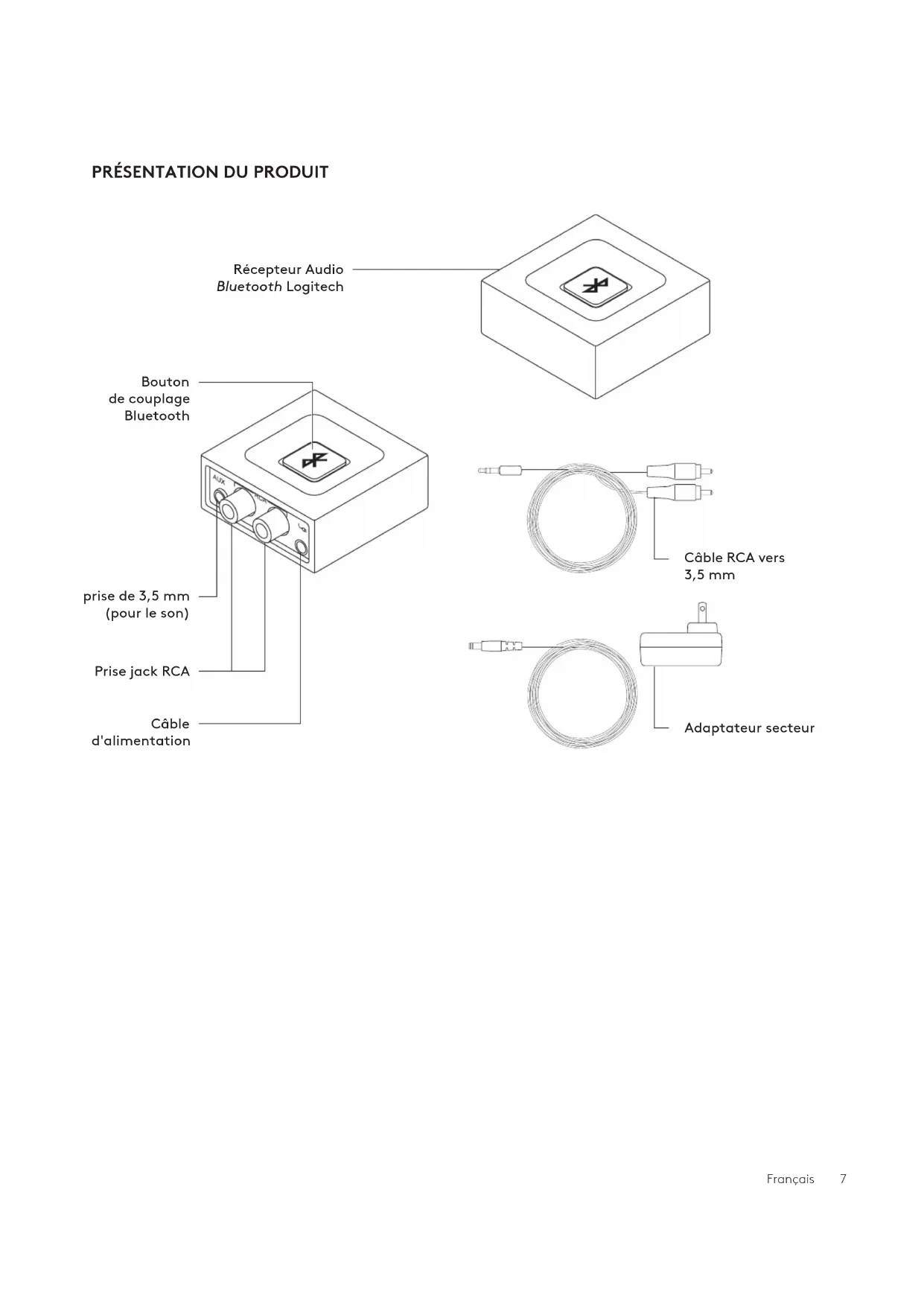 Adaptateur secteur Câble RCA vers 3,5mm Récepteur Audio Bluetooth Logitech prise de 3,5 mm (pour le son) Câble d'alimentation Prise jack RCA Bouton decouplage BluetoothFrançais 8