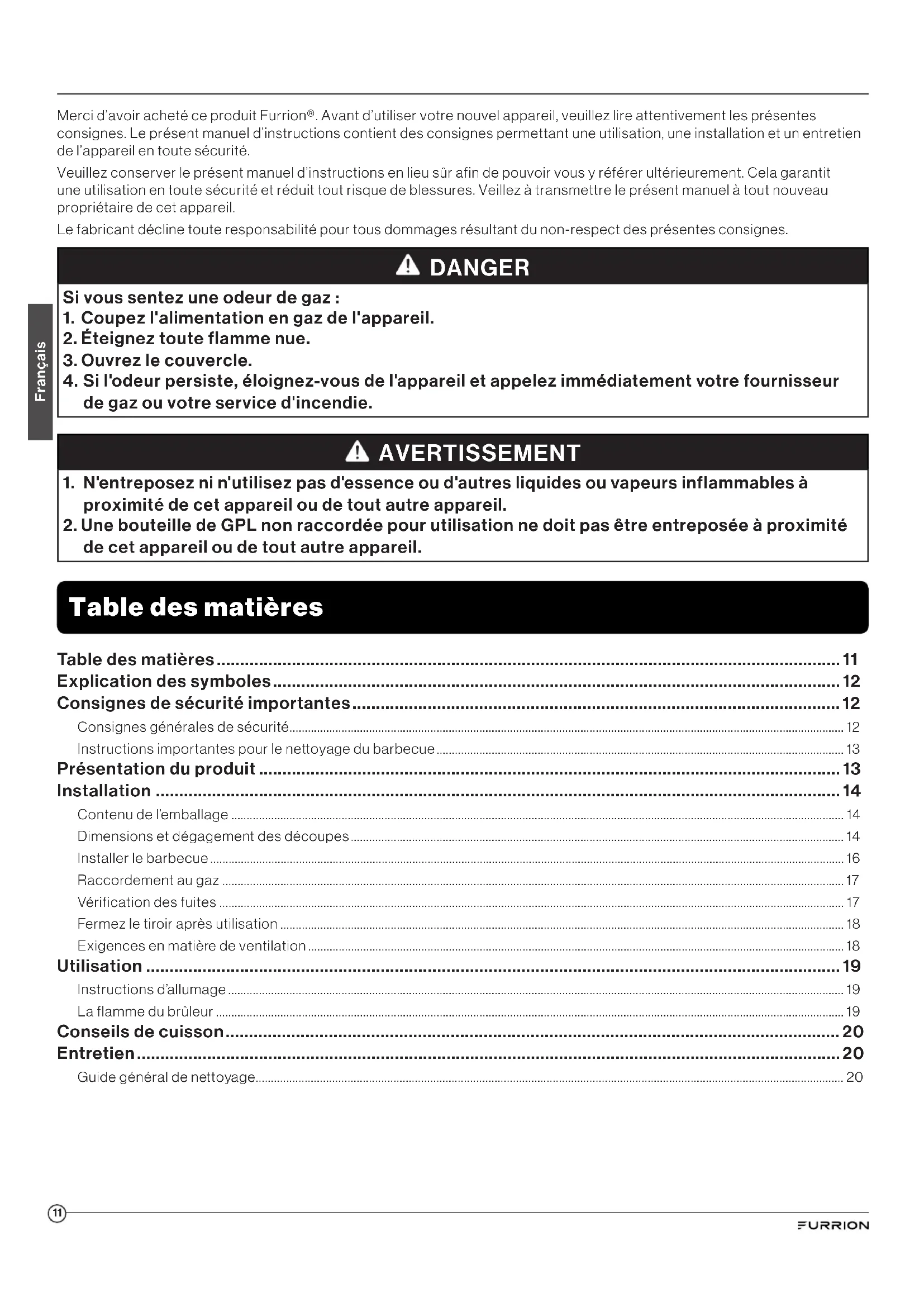 NOTE: Make sure the curved edge is facing left while replacing the flame diffuser. Curved edge11 Français Merci d’avoir acheté ce produit Furrion®. Avant d’utiliser votre nouvel appareil, veuillez lire attentivement les présentes consignes. Le présent manuel d’instructions contient des consignes permettant une utilisation, une installation et un entretien de l’appareil en toute sécurité. Veuillez conserver le présent manuel d’instructions en lieu sûr afin de pouvoir vous y référer ultérieurement. Cela garantit une utilisation en toute sécurité et réduit tout risque de blessures. Veillez à transmettre le présent manuel à tout nouveau propriétaire de cet appareil. Le fabricant décline toute responsabilité pour tous dommages résultant du non-respect des présentes consignes. DANGER Si vous sentez une odeur de gaz: