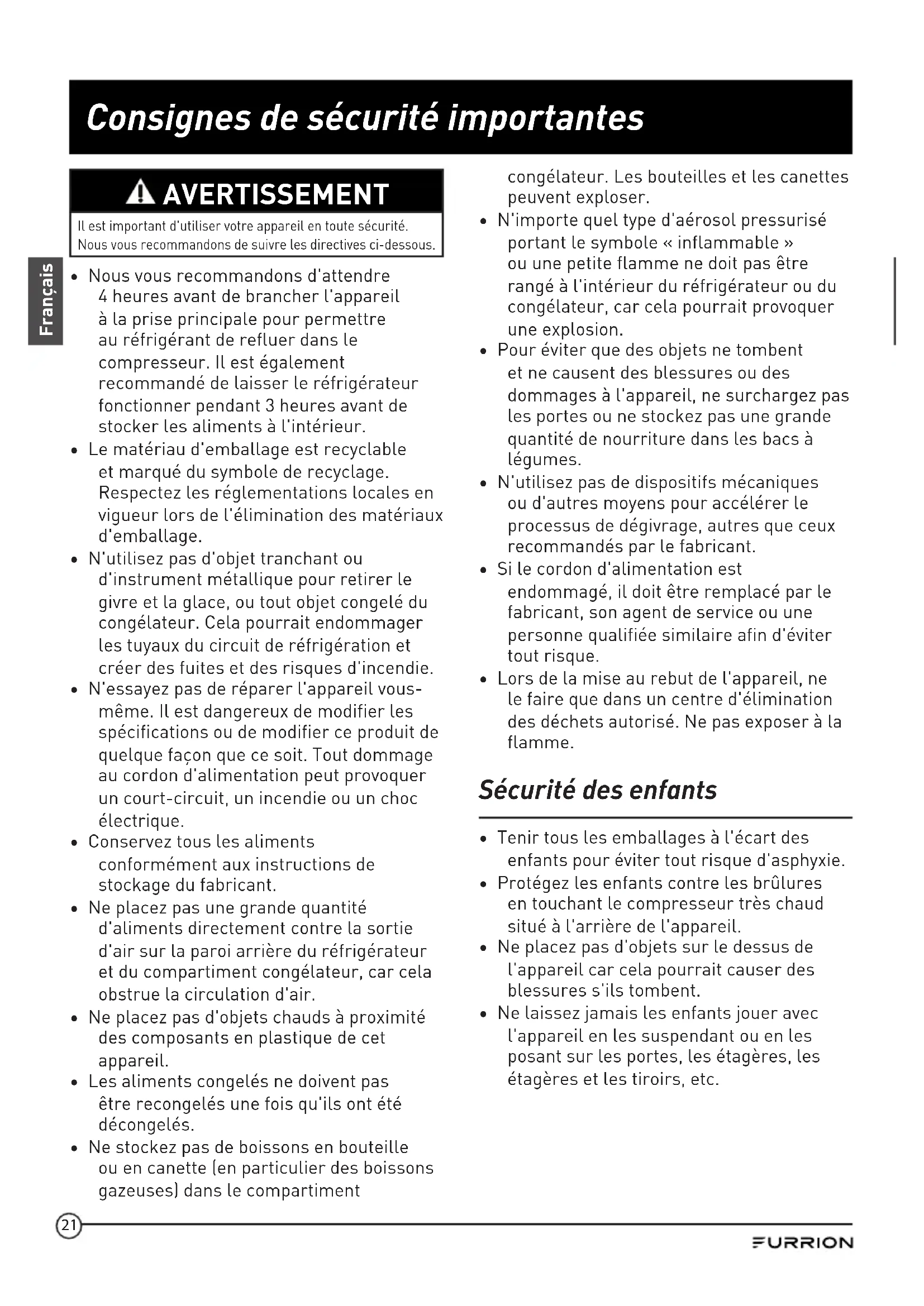 Merci d'avoir acheté ce réfrigérateur Furrion® 20 pi cu. Avant d'utiliser votre nouvel appareil, veuillez lire ces consignes attentivement. Le présent guide d'utilisation contient des informations permettant l'utilisation, l'installation et l'entretien en toute sécurité de l'appareil.