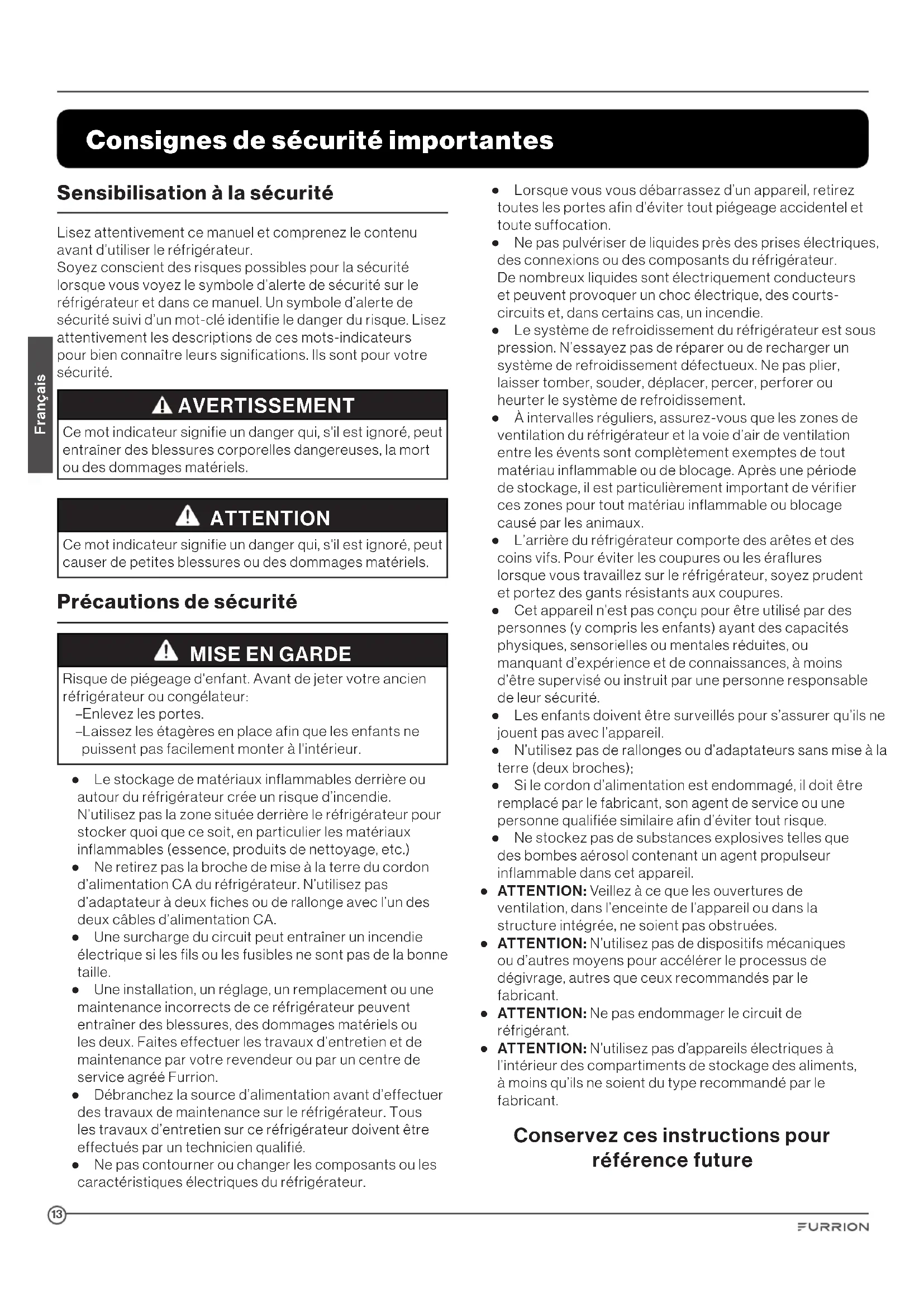 Risque de piégeage d'enfant. Avant de jeter votre ancien réfrigérateur ou congélateur: – Enlevez les portes. – Laissez les étagères en place afin que les enfants ne puissent pas facilement monter à l'intérieur. ● Le stockage de matériaux inflammables derrière ou autour du réfrigérateur crée un risque d’incendie. N’utilisez pas la zone située derrière le réfrigérateur pour stocker quoi que ce soit, en particulier les matériaux inflammables (essence, produits de nettoyage, etc.) ● Ne retirez pas la broche de mise à la terre du cordon d’alimentation CA du réfrigérateur. N’utilisez pas d’adaptateur à deux fiches ou de rallonge avec l’un des deux câbles d’alimentation CA. ● Une surcharge du circuit peut entraîner un incendie électrique si les fils ou les fusibles ne sont pas de la bonne taille. ● Une installation, un réglage, un remplacement ou une maintenance incorrects de ce réfrigérateur peuvent entraîner des blessures, des dommages matériels ou les deux. Faites effectuer les travaux d’entretien et de maintenance par votre revendeur ou par un centre de service agréé Furrion. ● Débranchez la source d’alimentation avant d’effectuer des travaux de maintenance sur le réfrigérateur. Tous les travaux d’entretien sur ce réfrigérateur doivent être effectués par un technicien qualifié. ● Ne pas contourner ou changer les composants ou les caractéristiques électriques du réfrigérateur. ● Lorsque vous vous débarrassez d’un appareil, retirez toutes les portes afin d’éviter tout piégeage accidentel et toute suffocation. ● Ne pas pulvériser de liquides près des prises électriques, des connexions ou des composants du réfrigérateur. De nombreux liquides sont électriquement conducteurs et peuvent provoquer un choc électrique, des courts- circuits et, dans certains cas, un incendie. ● Le système de refroidissement du réfrigérateur est sous pression. N’essayez pas de réparer ou de recharger un système de refroidissement défectueux. Ne pas plier, laisser tomber, souder, déplacer, percer, perforer ou heurter le système de refroidissement. ● À intervalles réguliers, assurez-vous que les zones de ventilation du réfrigérateur et la voie d’air de ventilation entre les évents sont complètement exemptes de tout matériau inflammable ou de blocage. Après une période de stockage, il est particulièrement important de vérifier ces zones pour tout matériau inflammable ou blocage causé par les animaux. ● L’arrière du réfrigérateur comporte des arêtes et des coins vifs. Pour éviter les coupures ou les éraflures lorsque vous travaillez sur le réfrigérateur, soyez prudent et portez des gants résistants aux coupures. ● Cet appareil n’est pas conçu pour être utilisé par des personnes (y compris les enfants) ayant des capacités physiques, sensorielles ou mentales réduites, ou manquant d’expérience et de connaissances, à moins d’être supervisé ou instruit par une personne responsable de leur sécurité. ● Les enfants doivent être surveillés pour s’assurer qu’ils ne jouent pas avec l’appareil. ● N’utilisez pas de rallonges ou d’adaptateurs sans mise à la terre (deux broches); ● Si le cordon d’alimentation est endommagé, il doit être remplacé par le fabricant, son agent de service ou une personne qualifiée similaire afin d’éviter tout risque. ● Ne stockez pas de substances explosives telles que des bombes aérosol contenant un agent propulseur inflammable dans cet appareil. ● ATTENTION: Veillez à ce que les ouvertures de ventilation, dans l’enceinte de l’appareil ou dans la structure intégrée, ne soient pas obstruées. ● ATTENTION: N’utilisez pas de dispositifs mécaniques ou d’autres moyens pour accélérer le processus de dégivrage, autres que ceux recommandés par le fabricant. ● ATTENTION: Ne pas endommager le circuit de réfrigérant. ● ATTENTION: N’utilisez pas d’appareils électriques à l’intérieur des compartiments de stockage des aliments, à moins qu’ils ne soient du type recommandé par le fabricant. Conservez ces instructions pour référence future Consignes de sécurité importantes14 Français Pièces et caractéristiques Article Nom de la pièce