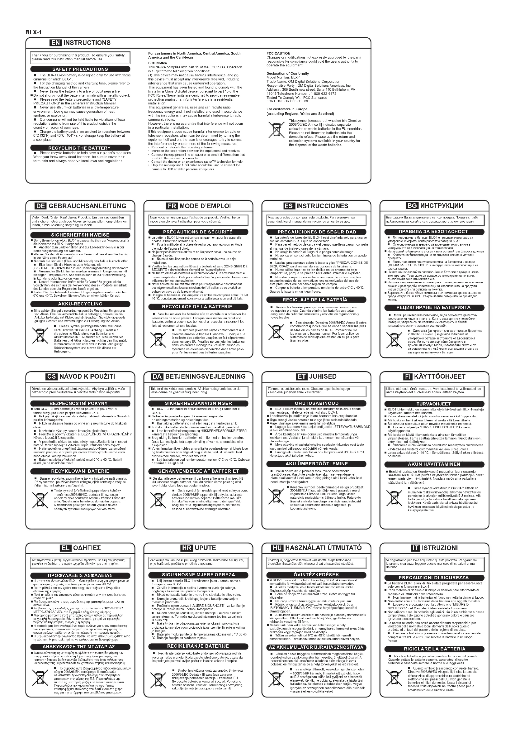 La batterie BLX-1 Li-ion est conçue uniquement pour les appareils photos utilisant les batteries BLX-1. Pour la méthode et la durée de recharge, reportez-vous au Mode d’emploi de l’appareil photo. Ne jetez pas la batterie au feu et ne l'exposez pas à une source de chaleur élevée. Ne court-circuitez pas les bornes de la batterie avec un objet métallique. Veuillez lire les précautions liées à la batterie et les « CONSIGNES DE SÉCURITÉ » dans le Mode d’emploi de l’appareil photo. N’utilisez jamais de batteries au lithium-ion dans un environnement à basse température. Cela pourrait entraîner l’apparition de chaleur, une inflammation ou une explosion. Notre société ne saurait être tenue pour responsable des violations des réglementations locales résultant de l’utilisation de ce produit en dehors du pays ou de la région d’achat. Chargez la batterie à une température ambiante comprise entre 0 °C et 40 °C. Lors du rangement, conservez la batterie dans un endroit frais.