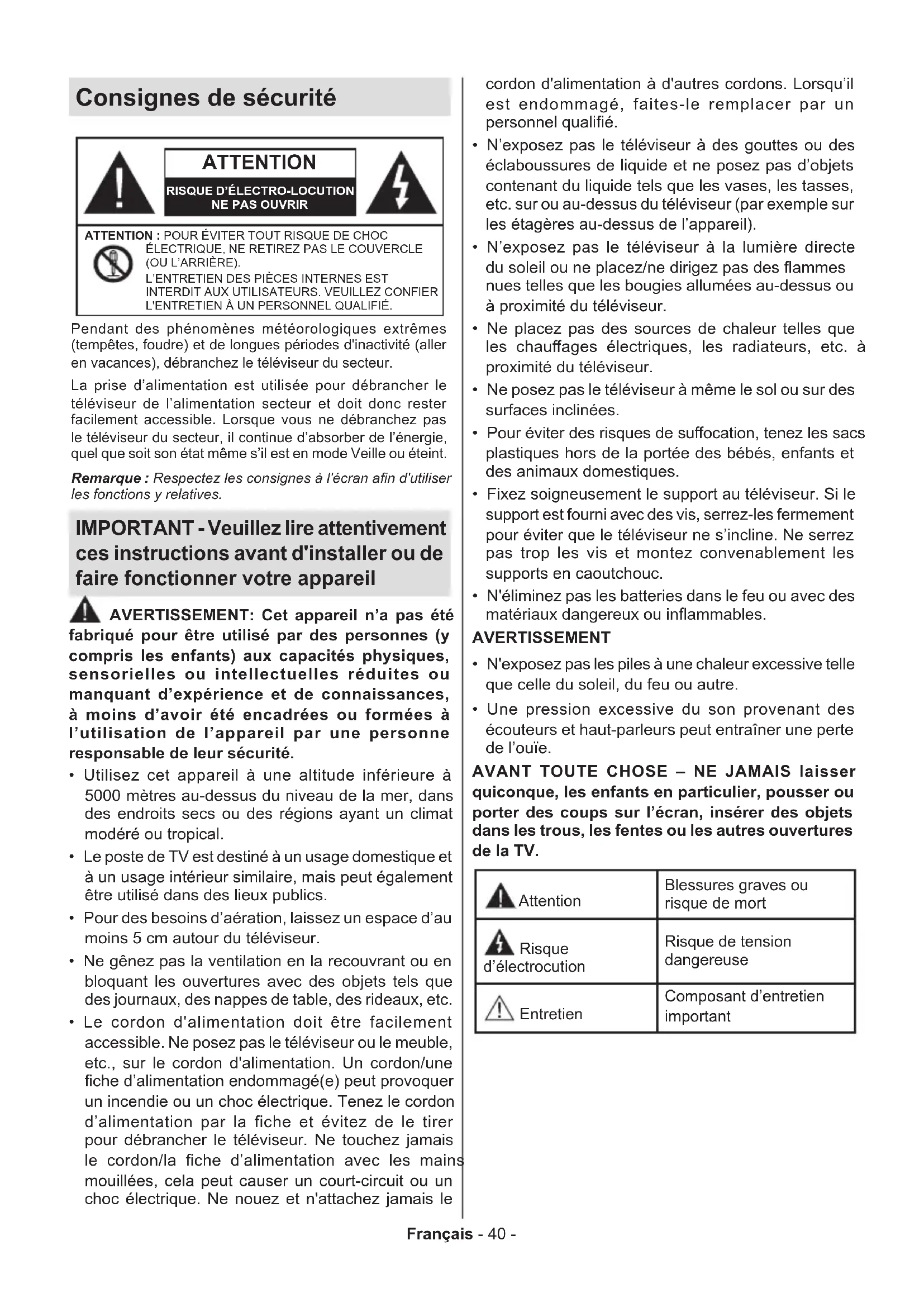 Produit Laser de Classe 1 : Ce produit est équipé d’une source laser de Classe 1 sans danger dans des condi- tions d’utilisation raisonna- blement prévisibles. AVERTISSEMENT N'avalez pas la pile. Les produits chimiques y contenus pourraient vous brûler. Ce produit ou les accessoires fournis avec celui-ci pourraient contenir une pile bouton. L'ingestion d'une pile bouton peut causer non seulement de sévères brûlures internes en seulement 2 heures, mais aussi le décès. Gardez les nouvelles et anciennes piles hors de portée des enfants. Si le compartiment à piles ne se ferme pas correcte- ment, arrêtez d’utiliser le produit et tenez-le hors de la portée des enfants. Si vous pensez que des piles ont été avalées ou logées n’importe où à l’intérieur du corps, consultez de toute urgence un médecin. – – – – – – – – – – – – Avertissement Danger de Stabilité Un téléviseur peut tomber, causant des blessures graves ou mortelles. Vous pouvez éviter de nom