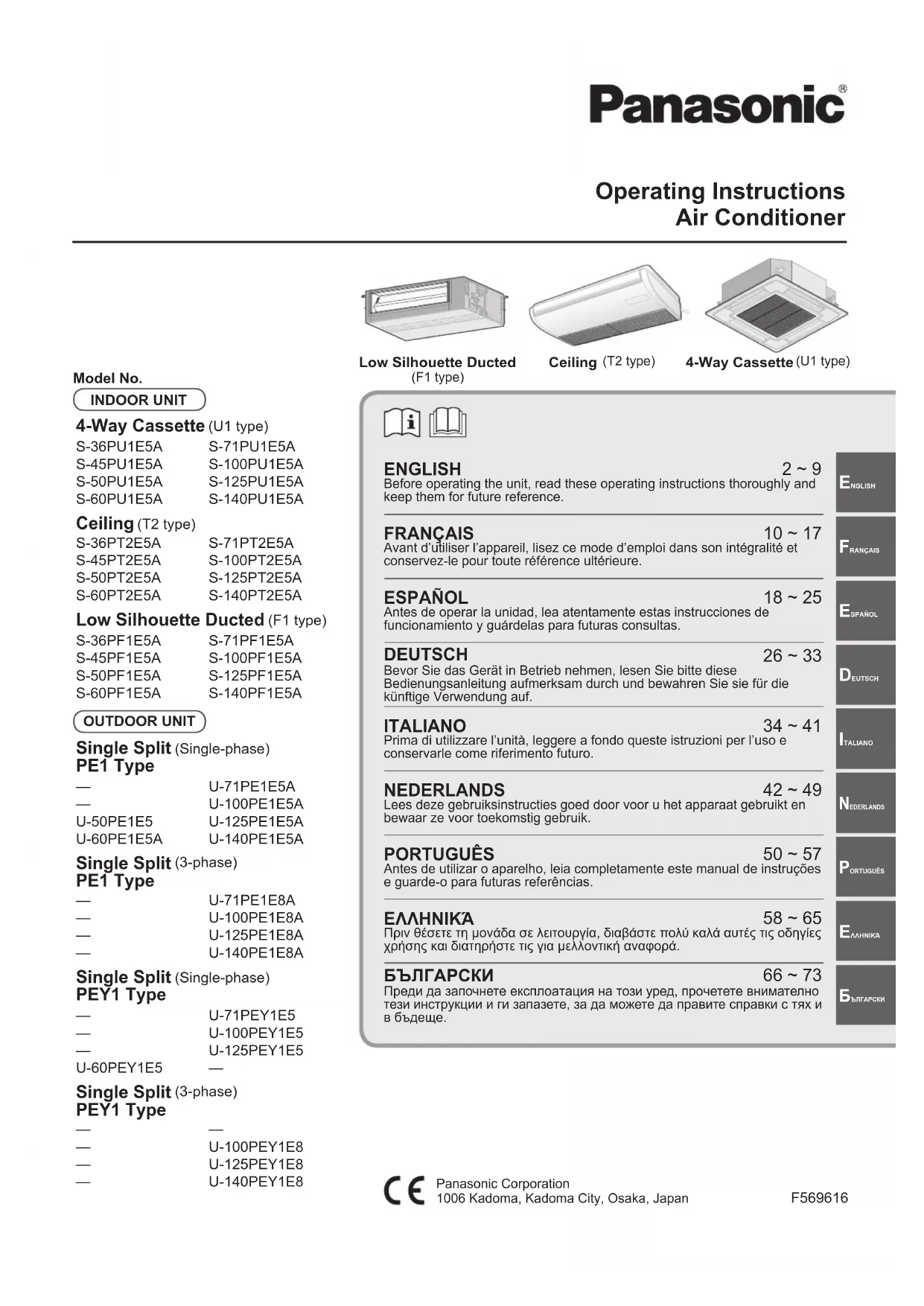 U125PEY1E8 - Climatisation PANASONIC - Notice d'utilisation et mode d'emploi gratuit
