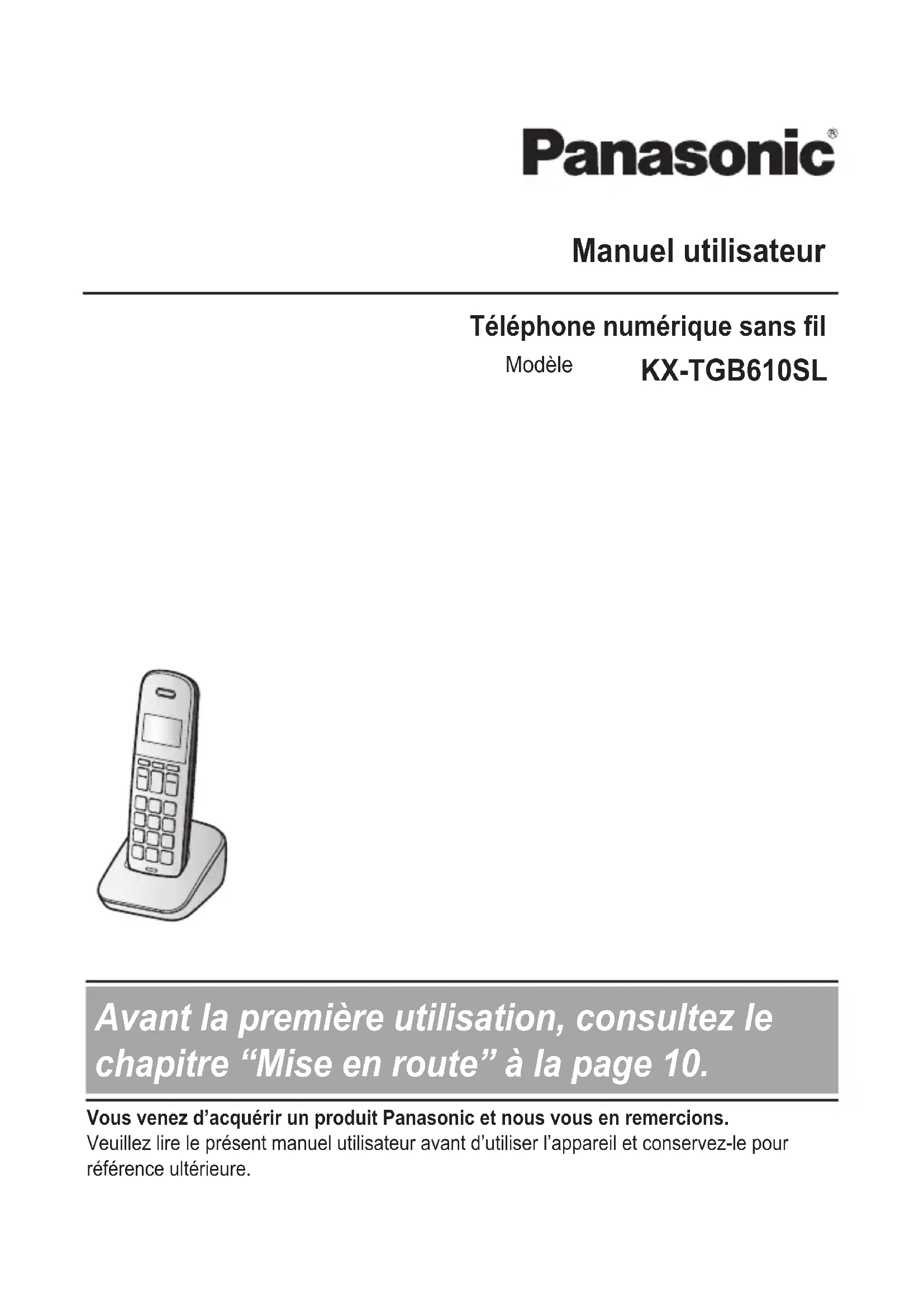 - Manuel utilisateur Téléphone numérique sans fil Modèle KX-TGB610SL Avant la première utilisation, consultez le chapitre “Mise en route” à la page 10. Vous venez d’acquérir un produit Panasonic et nous vous en remercions.Veuillez lire le présent manuel utilisateur avant d’utiliser l’appareil et conservez-le pourréférence ultérieure.KX-TGB610SL_(fr-SL)_1120_ver002.pdf 1 12/3/2020 6:58:30 PMIntroduction Informations sur les accessoires p. 3