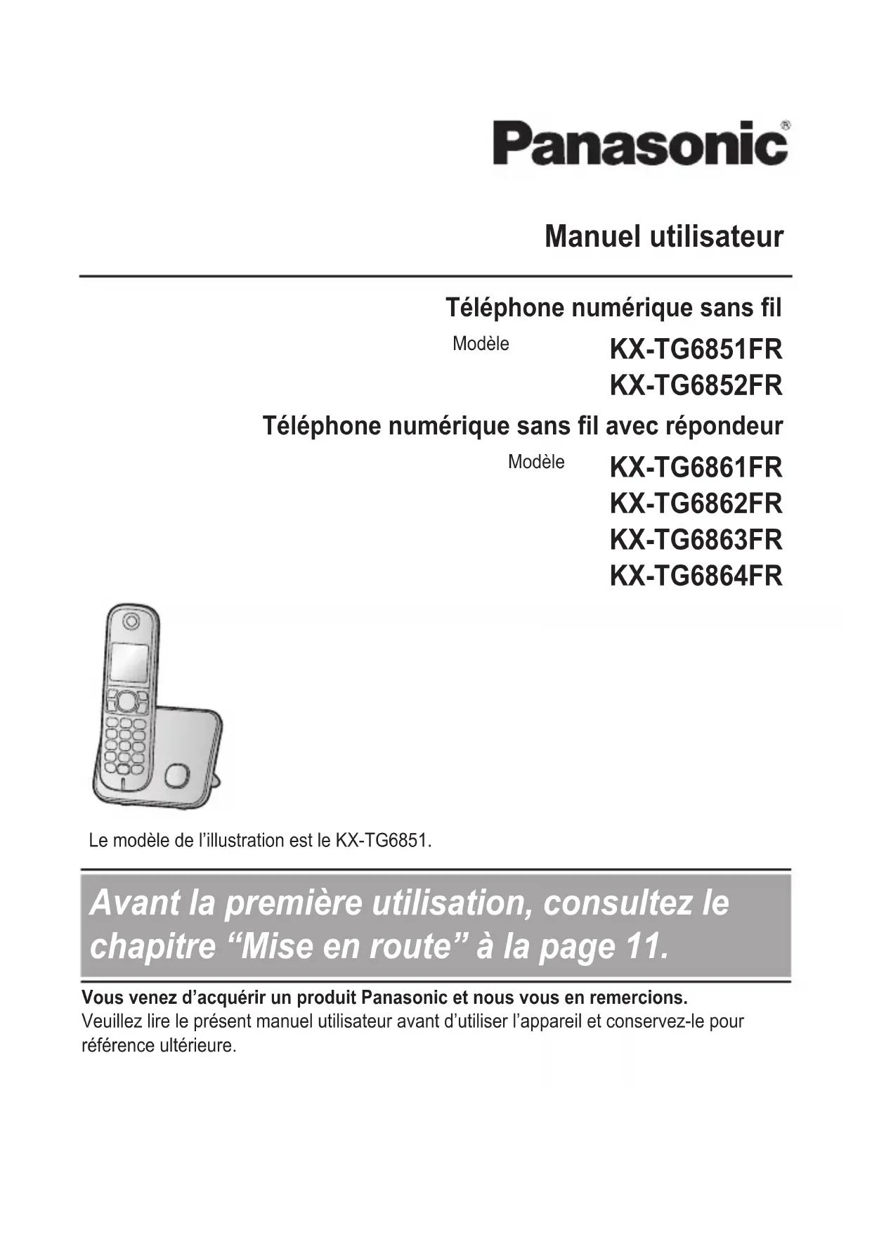- Manuel utilisateur Téléphone numérique sans fil Modèle KX-TG6851FR KX-TG6852FR Téléphone numérique sans fil avec répondeur Le modèle de l’illustration est le KX-TG6851. Modèle KX-TG6861FR KX-TG6862FR KX-TG6863FR KX-TG6864FR Avant la première utilisation, consultez le chapitre “Mise en route” à la page 11. Vous venez d’acquérir un produit Panasonic et nous vous en remercions. Veuillez lire le présent manuel utilisateur avant d’utiliser l’appareil et conservez-le pour référence ultérieure.Introduction Composition du modèle p. 3