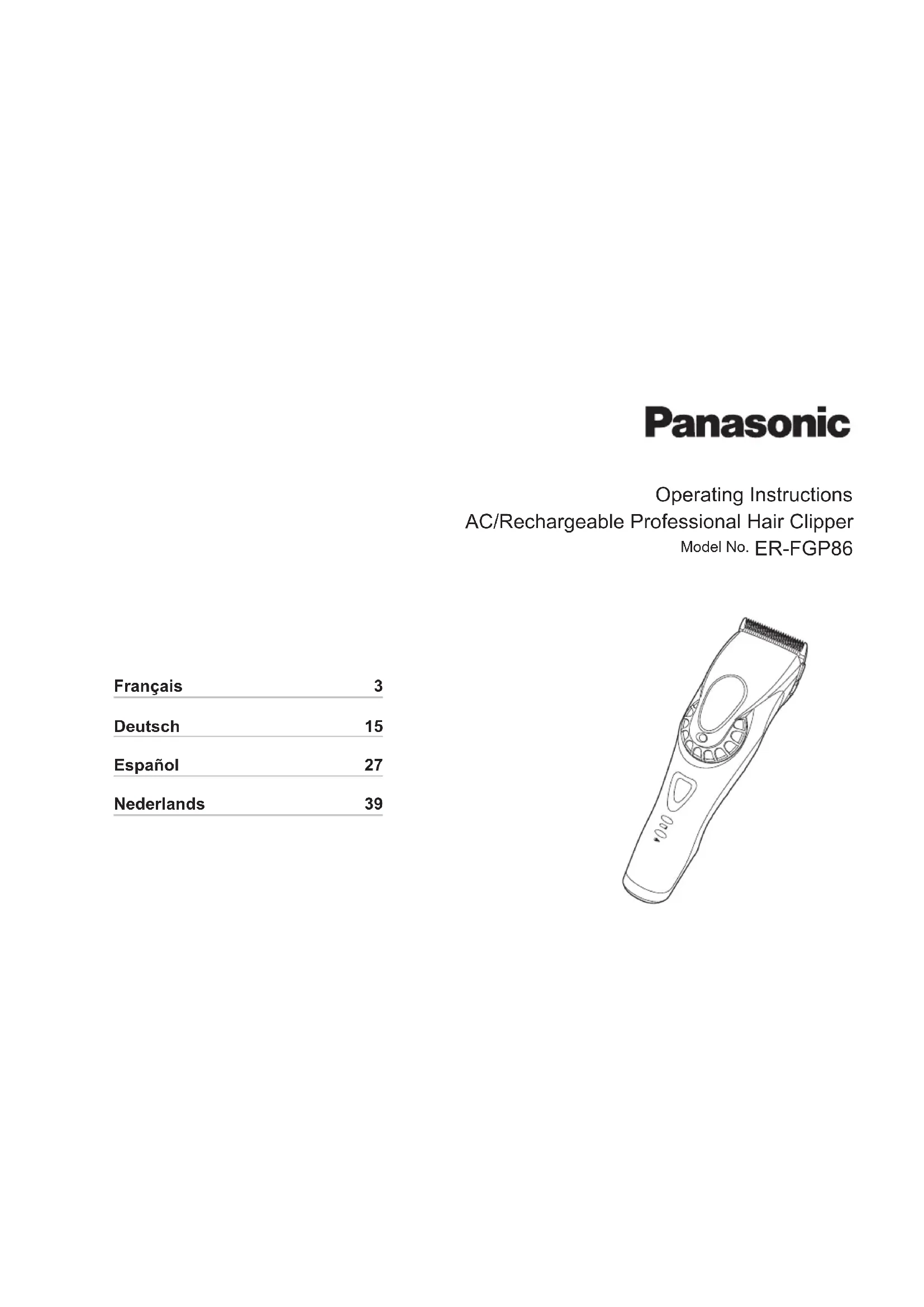 - Operating Instructions AC/Rechargeable Professional Hair Clipper Model No. ER‑FGP86 Français 3 Deutsch 15 Español 27 Nederlands 3923 Français Mode d’emploi Tondeuse à cheveux rechargeable, à usage professionnel Modèle No ER‑FGP86 Merci d’avoir choisi ce produit Panasonic. Avant de faire fonctionner cet appareil, veuillez lire toutes les instructions et les conserver pour une utilisation ultérieure. Consignes de sécurité 5 Informations importantes p. 7