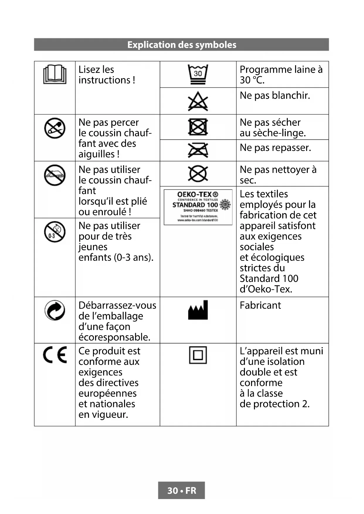 - Legen Sie während der Lagerung keine Gegenstände auf das Heizkissen ab um zu vermieden, dass es scharf geknickt wird. 28 • DERecycling Dieses Symbol weist darauf hin, dass dieses Produkt nicht mit dem normalen Hausmüll entsorgt werden darf (2012/19/EU). Befolgen Sie die in Ihrem Land geltenden Vorschriften in Bezug auf die getrennte Sammlung von Elektro- und Elektronikgeräten. Durch eine korrekte Entsorgung des Produkts beugen Sie negativen Folgen für die Umwelt und die Volksgesundheit vor. Das Verpackungsmaterial ist zu 100% recycelbar; sammeln Sie das Verpackungsmaterial daher getrennt ein. 29 • DELisez les instructions! Programme laine à 30 °C. Ne pas blanchir. Ne pas percer le coussin chauf- fant avec des aiguilles! Ne pas sécher au sèche-linge. Ne pas repasser. Ne pas utiliser le coussin chauf- fant lorsqu’il est plié ou enroulé! Ne pas nettoyer à sec. Les textiles employés pour la fabrication de cet appareil satisfont aux exigences sociales et écologiques strictes du Standard 100 d’Oeko-Tex. Ne pas utiliser pour de très jeunes enfants (0-3 ans). Débarrassez-vous de l’emballage d’une façon écoresponsable. Fabricant Ce produit est conforme aux exigences des directives européennes et nationales en vigueur. L’appareil est muni d’une isolation double et est conforme à la classe de protection 2. 30 • FR Explication des symbolesJetez l’appareil électrique en respectant les exigences de la directive CE relative aux DEEE (déchets d’équipements électriques et électroniques). AVERTISSEMENT; vous avertit d’un risque de blessure ou de danger pour votre santé. ATTENTION; avertissement de sécurité concernant un risque d’endommagement de l’appareil ou des accessoires. MISE EN GARDE; signale une information importante. 31 • FRConsignes de sécurité Consignes de sécurité importantes - Lireattentivement et conserver pour uneutilisation future ! AVERTISSEMENT