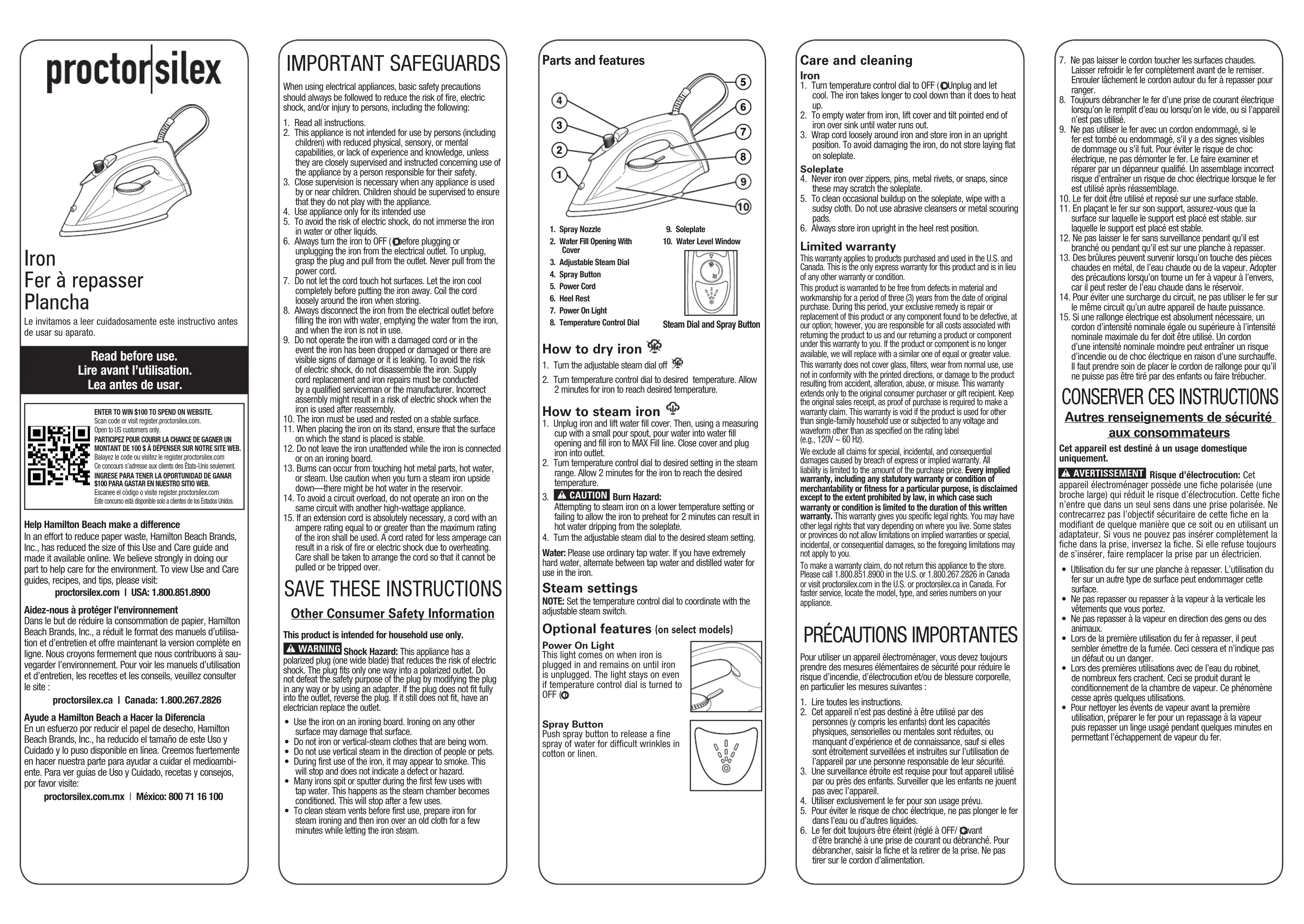 Garantie limitée Cette garantie s’applique aux produits achetés et utilisées aux É.-U. et au Canada. C’est la seule garantie expresse pour ce produit et est en lieu et place de tout autre garantie ou condition.Ce produit est garanti contre tout défaut de matériaux et de main-d’oeuvre pour une période de trois (3) ans à compter de la date d’achat d’origine. Au cours de cette période, votre seul recours est la réparation ou le remplacement de ce produit ou tout composant s’avérant défectueux, à notre gré, mais vous êtes responsable de tous les coûts liés à l’expédition du produit et le retour d’un produit ou d’un composant dans le cadre de cette garantie. Si le produit ou un composant n’est plus offert, nous le remplacerons par un produit similaire de valeur égale ou supérieure.Cette garantie ne couvre pas le verre, les filtres, l’usure d’un usage normal, l’utilisation non conforme aux directives imprimées, ou des dommages au produit résultant d’un accident, modification, utilisation abusive ou incorrecte. Cette garantie s’applique seulement à l’acheteur original ou à la personne l’ayant reçu en cadeau. La présentation du reçu de vente d’origine comme preuve d’achat est nécessaire pour faire une réclamation au titre de cette garantie. Cette garantie s’annule si le produit est utilisé autrement que par une famille ou si l’appareil est soumis à toute tension ou forme d’onde différente des caractéristiques nominales précisées sur l’étiquette (par ex. : 120 V ~ 60 Hz).Nous excluons toutes les réclamations au titre de cette garantie pour les dommages spéciaux, consécutifs et indirects causés par la violation de garantie expresse ou implicite. Toute responsabilité est limitée au prix d’achat. Chaque garantie implicite, y compris toute garantie ou condition de qualité marchande ou d’adéquation à un usage particulier, est exonérée, sauf dans la mesure interdite par la loi, auquel cas la garantie ou condition est limitée à la durée de cette garantie écrite. Cette garantie vous donne des droits légaux précis. Vous pouvez avoir d’autres droits qui varient selon l’endroit où vous habitez. Certaines provinces ne permettent pas les limitations sur les garanties implicites ou les dommages spéciaux ou indirects de telle sorte que les limitations ci-dessus ne s’appliquent peut-être pas à votre cas.Ne pas retourner cet appareil au magasin lors d’une réclamation au titre de cette garantie. Téléphoner au 1.800.851.8900 aux É.-U. ou au 1.800.267.2826 au Canada ou visiter le site internet www.proctorsilex.com aux É.-U. ou www.proctorsilex.ca au Canada. Pour un service plus rapide, trouvez le numéro de modèle, le type d’appareil et les numéros de série sur votre appareil.