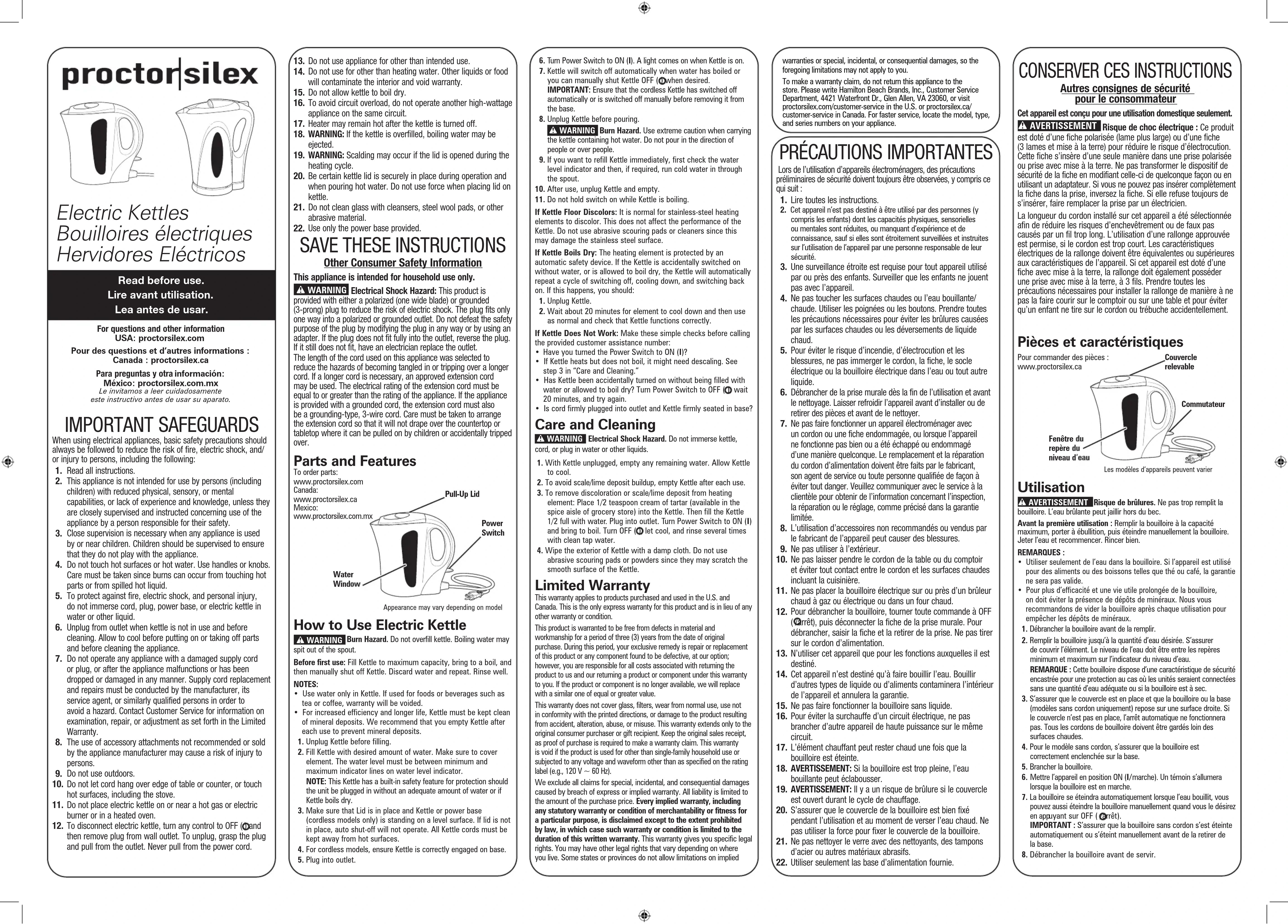 - Si la bouilloire chauffe, mais sans faire bouillir l’eau, elle a peut-être besoin d’être détartrée. Voir l’étape 3 de la section « Entretien et nettoyage » .• Est-ce que la bouilloire a été accidentellement mise sous tension sans eau ou a-t-elle fonctionné à vide ? Positionner l’interrupteur à OFF ( /arrêt), et attendre 20 minutes. Essayer à nouveau.• Le cordon est-il fermement branché dans la prise murale et est-ce que la bouilloire est bien installée sur son socle ? Entretien et nettoyage w AVERTISSEMENT Risque de choc électrique. Ne pas immerger la bouilloire, cordon ou fiche dans tout autre liquide.1. Débrancher la bouilloire, vider tout résidu d’eau. Laisser la bouilloire refroidir.2. Pour éviter tout dépôt de tartre, vider la bouilloire après chaque utilisation. 3. Pour éliminer la décoloration et les dépôts de tartre de l’élément chauffant : Versez 2,5 ml (1/2 c. à thé) de crème de tartre (offert dans l’allée des épices de l’épicerie) dans la bouilloire. Remplir la bouilloire jusqu’à la moitié avec de l’eau. Brancher, mettre sous tension ON (I/marche) et amener l’eau à ébullition. Mettre hors tension OFF ( /arrêt), laisser refroidir et rincer plusieurs fois avec de l’eau du robinet.4. Essuyer l’extérieur de la bouilloire avec un linge humide. Ne pas utiliser de tampons à récurer ou produits abrasifs car ils pourraient égratigner la surface lisse de la bouilloire. Garantie limitée Cette garantie s’applique aux produits achetés aux É.-U. et au Canada. C’est la seule garantie expresse pour ce produit et est en lieu et place de tout autre garantie ou condition. Ce produit est garanti contre tout défaut de matériaux et de main-d’oeuvre pour une période de trois (3) ans à compter de la date d’achat d’origine. Au cours de cette période, votre seul recours est la réparation ou le remplacement de ce produit ou tout composant s’avérant défectueux, à notre gré, mais vous êtes responsable de tous les coûts liés à l’expédition du produit et le retour d’un produit ou d’un composant dans le cadre de cette garantie. Si le produit ou un composant n’est plus offert, nous le remplacerons par un produit similaire de valeur égale ou supérieure. Cette garantie ne couvre pas le verre, les filtres, l’usure d’un usage normal, l’utilisation non conforme aux directives imprimées, ou des dommages au produit résultant d’un accident, modification, utilisation abusive ou incorrecte. Cette garantie s’applique seulement à l’acheteur original ou à la personne l’ayant reçu en cadeau. La présentation du reçu de vente d’origine comme preuve d’achat est nécessaire pour faire une réclamation au titre de cette garantie. Cette garantie s’annule si le produit est utilisé autrement que par une famille ou si l’appareil est soumis à toute tension ou forme d’onde différente des caractéristiques nominales précisées sur l’étiquette (par ex. : 120 V ~ 60 Hz). Nous excluons toutes les réclamations au titre de cette garantie pour les dommages spéciaux, consécutifs et indirects causés par la violation de garantie expresse ou implicite. Toute responsabilité est limitée au prix d’achat. Chaque garantie implicite, y compris toute garantie ou condition de qualité marchande ou d’adéquation à un usage particulier, est exonérée, sauf dans la mesure interdite par la loi, auquel cas la garantie ou condition est limitée à la durée de cette garantie écrite. Cette garantie vous donne des droits légaux précis. Vous pouvez avoir d’autres droits qui varient selon l’endroit où vous habitez. Certaines provinces ne permettent pas les limitations sur les garanties implicites ou les dommages spéciaux ou indirects de telle sorte que les limitations ci-dessus ne s’appliquent peut-être pas à votre cas. Ne pas retourner cet appareil au magasin lors d’une réclamation au titre de cette garantie. Veuillez nous écrire à Hamilton Beach Brands, Inc., Customer Service Department, 4421 Waterfront Dr., Glen Allen, VA 23060, ou visiter le site proctorsilex.com/customer- service aux États-Unis ou proctorsilex.ca/customer-service au Canada. Pour obtenir un service plus rapide, veuillez repérer les numéros de modèle, de type et de séries sur votre appareil.ach.ca/ customer-service in Canada. SALVAGUARDIAS IMPORTANTES Cuando utilice aparatos eléctricos, siempre deben seguirse precauciones de seguridad básicas a fin de reducir el riesgo de incendio, descarga eléctrica, y/o lesiones a personas, incluyendo las siguientes: