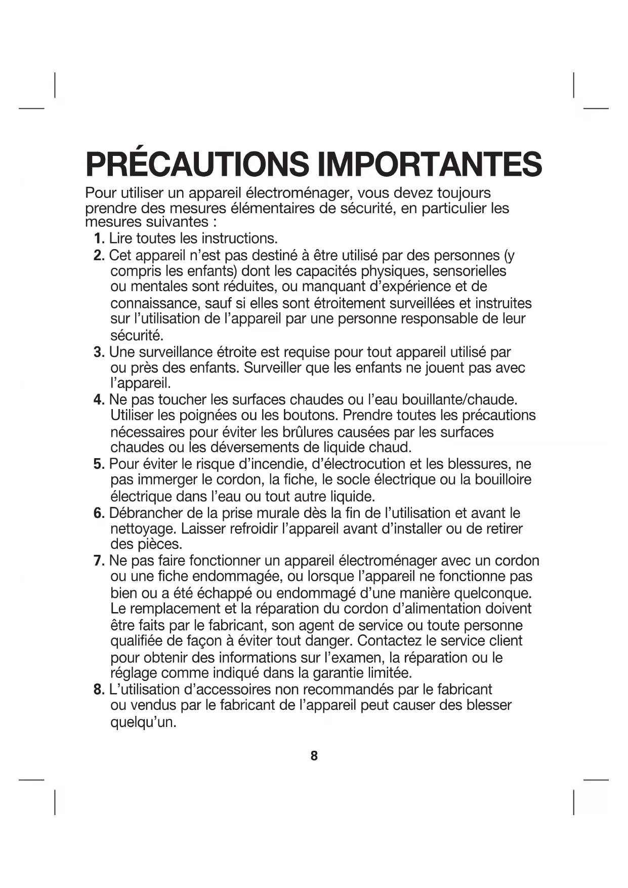 - Pour plus d’efficacité et une vie utile prolongée de la Autres consignes de sécurité pour le consommateur Cet appareil est destiné à un usage domestique uniquement. Pour éviter une surcharge du circuit, ne pas faire fonctionner un autre appareil à tension élevée sur le même circuit. w AVERTISSEMENT Risque de choc électrique : Ce produit est fourni avec une fiche polarisée (lame plus large) ou d’une fiche à prise de terre (3 lames) pour réduire le risque d’électrocution. Cette fiche s’insère d’une seule manière dans une prise polarisée ou prise avec mise à la terre. Ne pas transformer le dispositif de sécurité de la fiche en modifiant celle-ci de quelconque façon ou en utilisant un adaptateur. Si vous ne pouvez pas insérer complètement la fiche dans la prise, inversez la fiche. Si elle refuse toujours de s’insérer, faire remplacer la prise par un électricien. La longueur du cordon installé sur cet appareil a été sélectionnée afin de réduire les risques d’enchevêtrement ou de faux pas causés par un fil trop long. L’utilisation d’une rallonge approuvée est permise, si le cordon est trop court. Les caractéristiques électriques de la rallonge doivent être équivalentes ou supérieures aux caractéristiques de l’appareil. Si cet appareil est du type à mise à la terre, la rallonge doit être du type à mise à la terre, à 3 fils. Prendre toutes les précautions nécessaires pour installer la rallonge de manière à ne pas la faire courir sur le comptoir ou sur une table pour éviter qu’un enfant ne tire sur le cordon ou trébuche accidentellement. w AVERTISSEMENT Risque de brûlure Pour éviter les brûlures et réduire le risque de blessure personnelle, faire très attention lors du transport d’une bouilloire qui contient de l’eau chaude. Ne pas verser dans la direction des gens ou en se penchant par dessus eux.11 bouilloire, on doit éviter la présence de dépôts de minéraux. Nous vous recommandons de vider la bouilloire après chaque utilisation pour empêcher les dépôts de minéraux. 1 Débrancher la bouilloire avant de la remplir. 2 Remplir la bouilloire jusqu’à la quantité d’eau désirée. S’assurer de couvrir l’élément. Le niveau de l’eau doit être entre les repères minimum et maximum sur l’indicateur du niveau d’eau. w AVERTISSEMENT Risque de brûlure Si la bouilloire est trop remplie, l’eau bouillante risque de s’échapper du bec verseur. REMARQUE : Cette bouilloire dispose d’une caractéristique de sécurité encastrée pour une protection au cas où les unités seraient connectées sans une quantité d’eau adéquate ou si la bouilloire est à sec. 3 S’assurer que le couvercle est en place et que la bouilloire ou la base (modèles sans cordon uniquement) repose sur une surface droite. Si le couvercle n’est pas en place, l’arrêt automatique ne fonctionnera pas. Tous les cordons de bouilloire doivent être gardés loin des surfaces chaudes. 4 P our le modèle sans cordon, s’assurer que la bouilloire est correctement enclenchée sur la base. (Voir l’illustration.) 5 Brancher la fiche dans la prise murale. 6 Mettre l’appareil en marche position ON (I). Un témoin s’allumera lorsque la bouilloire est en marche. 7 La bouilloire se éteindra automatiquement lorsque l’eau bouillit, vous pouvez aussi éteindre la bouilloire manuellement quand vous le désirez en appuyant sur OFF ( ). IMPORTANT : S’assurer que la bouilloire sans cordon s’est éteinte automatiquement ou s’éteint manuellement avant de la retirer de la base. 8 Débrancher la bouilloire avant de servir. 9 Si vous voulez remplir la bouilloire immédiatement, vérifier d’abord le témoin du niveau d’eau puis, au besoin, faire couler de l’eau froide dans le bec verseur. 10 Après utilisation, débrancher la bouilloire et la vider. 11 Ne pas retenir le bouton en position de marche lorsque la bouilloire bout.12 Si votre bouilloire bout jusqu’au point où il n’y a plus d’eau L’élément de la bouilloire est protégé par un dispositif de sécurité automatique. Si la bouilloire est allumée accidentellement sans eau, ou s’il n’y a plus d’eau, la bouilloire répètera automatique- ment un programme d’arrêt, de refroidissement et de remise en marche. Si cela se produit, vous devez : 1 Débrancher la bouilloire. 2 Attendre environ 20 minutes pour que l’élément refroidisse puis utiliser la bouilloire normalement et vérifier qu’elle fonctionne correctement. Nettoyage et détartrage de votre bouilloire w AVERTISSEMENT Risque de choc électrique : Ne jamais immerger la bouilloire dans l’eau ou autres liquides. 1 Débrancher la bouilloire, vider tout résidu d’eau et rincer. Laisser la bouilloire refroidir. 2 Pour éviter tout dépôt de tartre, vider la bouilloire après chaque utilisation. 3 Si vous voyez un dépôt dans la bouilloire, ajoutez une demicuillère de crème de tartre et remplissez d’eau jusqu’à la ligne. Allumez la bouilloire et laissez bouillir. Éteignez la bouilloire. Laissez reposer pendant 15 minutes. Videz la bouilloire et rincez avec de l’eau fraîche. 4 Assuyer l’extérieur de la bouilloire avec un linge humide. Ne pas utiliser de tampons à récurer ou produits abrasifs car ils pourraient égratigner la surface lisse de la bouilloire.13