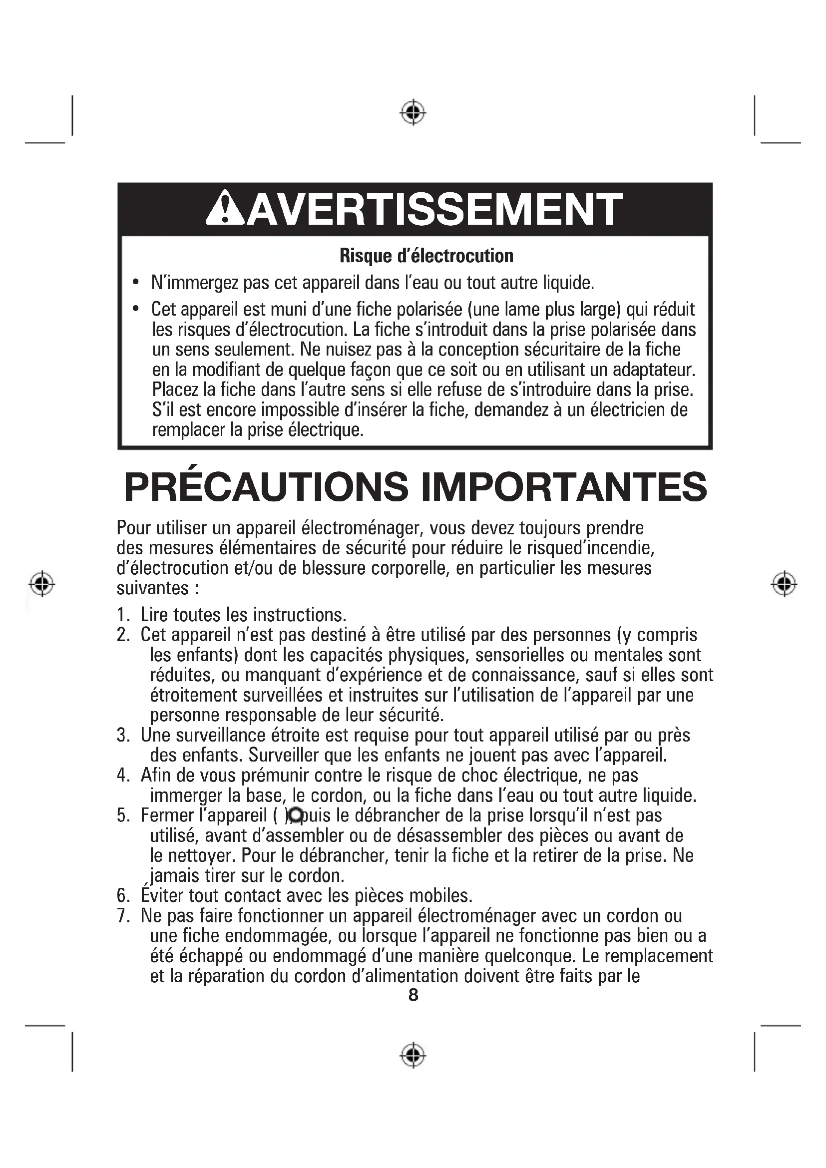 Pour utiliser un appareil électroménager, vous devez toujours prendre des mesures élémentaires de sécurité pour réduire le risqued’incendie, d’électrocution et/ou de blessure corporelle, en particulier les mesures suivantes :