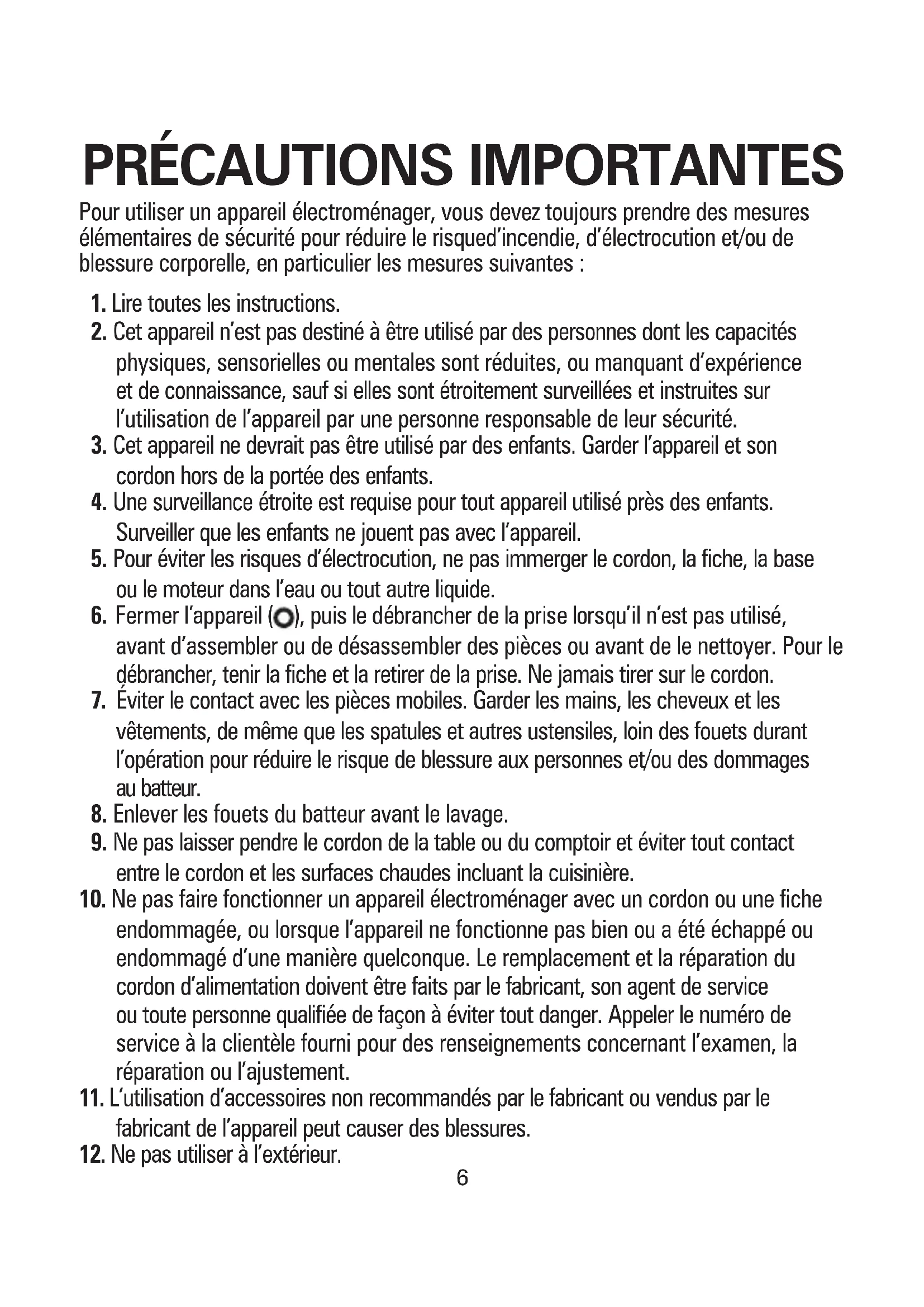 Cet appareil est destiné à un usage domestique uniquement. w AVERTISSEMENT Risque de choc électrique : Cet appareil est fourni avec une fiche polarisée (une broche large) pour réduire le risque d’électrocution. Cette fiche n’entre que dans un seul sens dans une prise polarisée. Ne contrecarrez pas l’objectif sécuritaire de cette fiche en la modifiant de quelque manière que ce soit ou en utilisant un adaptateur. Si vous ne pouvez pas insérer complètement la fiche dans la prise, inversez la fiche. Si elle refuse toujours de s’insérer, faire remplacer la prise par un électricien. La longueur du cordon installé sur cet appareil a été sélectionnée afin de réduire les risques d’enchevêtrement ou de faux pas causés par un fil trop long. L’utilisation d’une rallonge approuvée est permise si le cordon est trop court. Les caractéristiques électriques de la rallonge doivent être équivalentes ou supérieures aux caractéristiques de l’appareil. Prendre toutes les précautions nécessaires pour installer la rallonge de manière à ne pas la faire courir sur le comptoir ou sur une table pour éviter qu’un enfant ne tire sur le cordon ou trébuche accidentellement. w ATTENTION Risque de pièces en mouvement. Pour réduire le risque de blessure personnelle, toujours débrancher le batteur avant d’insérer ou d’enlever les fouets. Renseignements sur la puissance/puissance de crête La notation marquée du batteur à main est déterminée par le Underwriters Laboratories comme la consommation stabilisée maximum de puissance du batteur à grande vitesse dans des conditions de charge. La puissance de crête est la puissance maximum moyenne consommée par le batteur pendant son fonctionnement initialà grande vitesse. Autres consignes de sécurité pour le consommateur