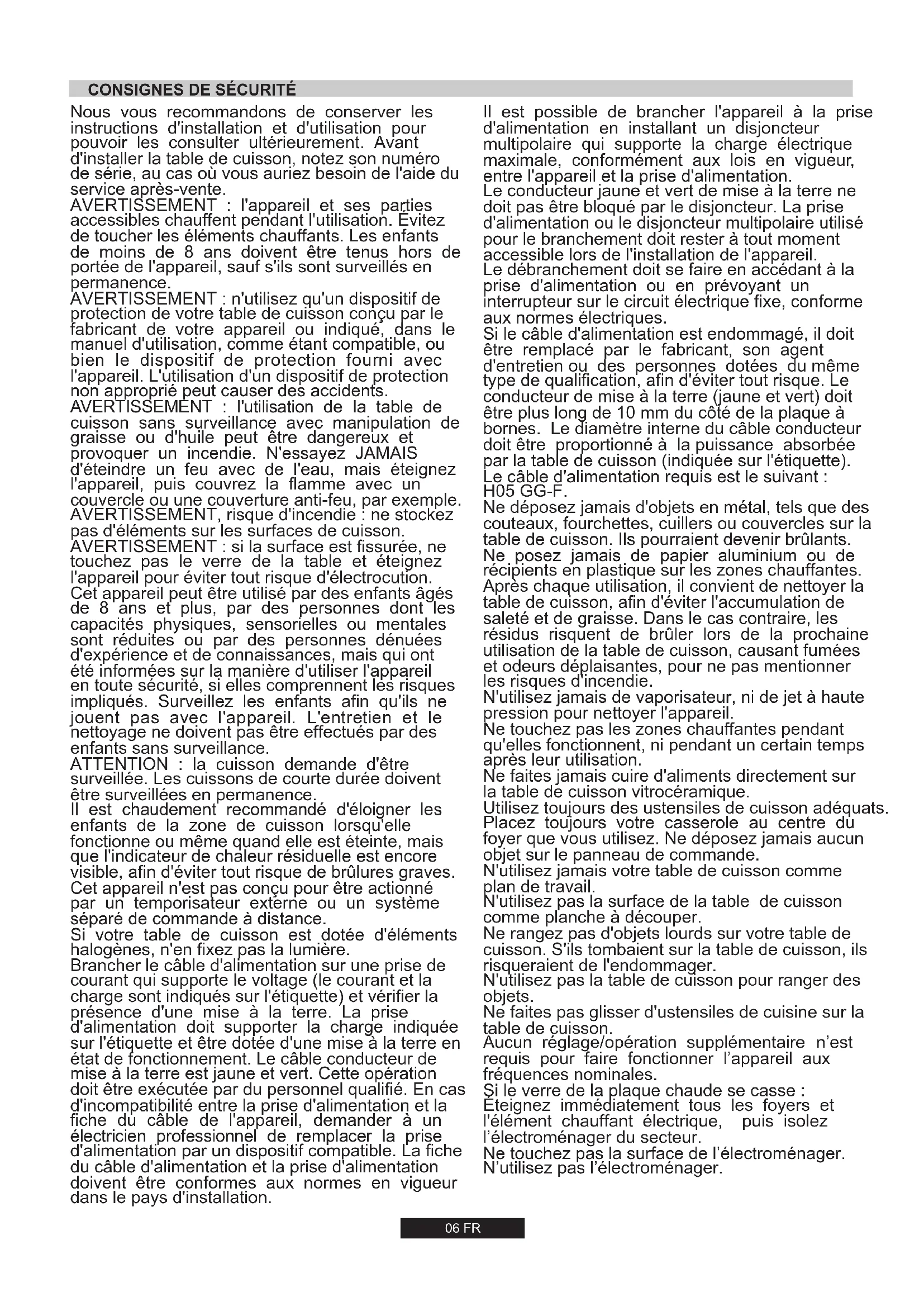 touchez pas le verre de la table et éteignez l'appareil pour éviter tout risque d'électrocution. Cet appareil peut être utilisé par des enfants âgés de 8 ans et plus, par des personnes dont les capacités physiques, sensorielles ou mentales sont réduites ou par des personnes dénuées d'expérience et de connaissances, mais qui ont été informées sur la manière d'utiliser l'appareil en toute sécurité, si elles comprennent les risques impliqués. Surveillez les enfants afin qu'ils ne jouent pas avec l'appareil. L'entretien et le nettoyage ne doivent pas être effectués par des enfants sans surveillance. Cet appareil n'est pas conçu pour être actionné par un temporisateur externe ou un système séparé de commande à distance. Si votre table de cuisson est dotée d'éléments halogènes, n'en fixez pas la lumière. Brancher le câble d'alimentation sur une prise de courant qui supporte le voltage (le courant et la charge sont indiqués sur l'étiquette) et vérifier la présence d'une mise à la terre. La prise d'alimentation doit supporter la charge indiquée sur l'étiquette et être dotée d'une mise à la terre en état de fonctionnement. Le câble conducteur de mise à la terre est jaune et vert. Cette opération doit être exécutée par du personnel qualifié. En cas d'incompatibilité entre la prise d'alimentation et la fiche du câble de l'appareil, demander à un électricien professionnel de remplacer la prise d'alimentation par un dispositif compatible. La fiche du câble d'alimentation et la prise d'alimentation doivent être conformes aux normes en vigueur dans le pays d'installation. Il est chaudement recommandé d'éloigner les enfants de la zone de cuisson lorsqu'elle fonctionne ou même quand elle est éteinte, mais que l'indicateur de chaleur résiduelle est encore visible, afin d'éviter tout risque de brûlures graves.