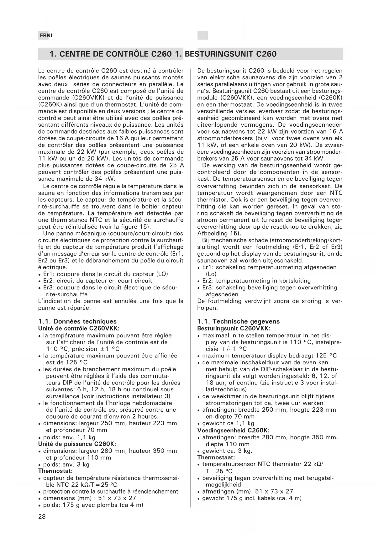 Le centre de contrôle C260 est destiné à contrôler les poêles électriques de saunas puissants montés avec deux séries de connecteurs en parallèle. Le centre de contrôle C260 est composé de l’unité de commande (C260VKK) et de l’unité de puissance (C260K) ainsi que d’un thermostat. L’unité de com- mande est disponible en deux versions ; le centre de contrôle peut ainsi être utilisé avec des poêles pré- sentant différents niveaux de puissance. Les unités de commande destinées aux faibles puissances sont dotées de coupe-circuits de 16 A qui leur permettent de contrôler des poêles présentant une puissance maximale de 22 kW (par exemple, deux poêles de 11 kW ou un de 20 kW). Les unités de commande plus puissantes dotées de coupe-circuits de 25 A peuvent contrôler des poêles présentant une puis- sance maximale de 34 kW. Le centre de contrôle régule la température dans le sauna en fonction des informations transmises par les capteurs. Le capteur de température et la sécu- rité-surchauffe se trouvent dans le boîtier capteur de température. La température est détectée par une thermistance NTC et la sécurité de surchauffe peut-être réinitialisée (voir la figure 15). Une panne mécanique (coupure/court-circuit) des circuits électriques de protection contre la surchauf- fe et du capteur de température produit l’affichage d’un message d’erreur sur le centre de contrôle (Er1, Er2 ou Er3) et le débranchement du poêle du circuit électrique.