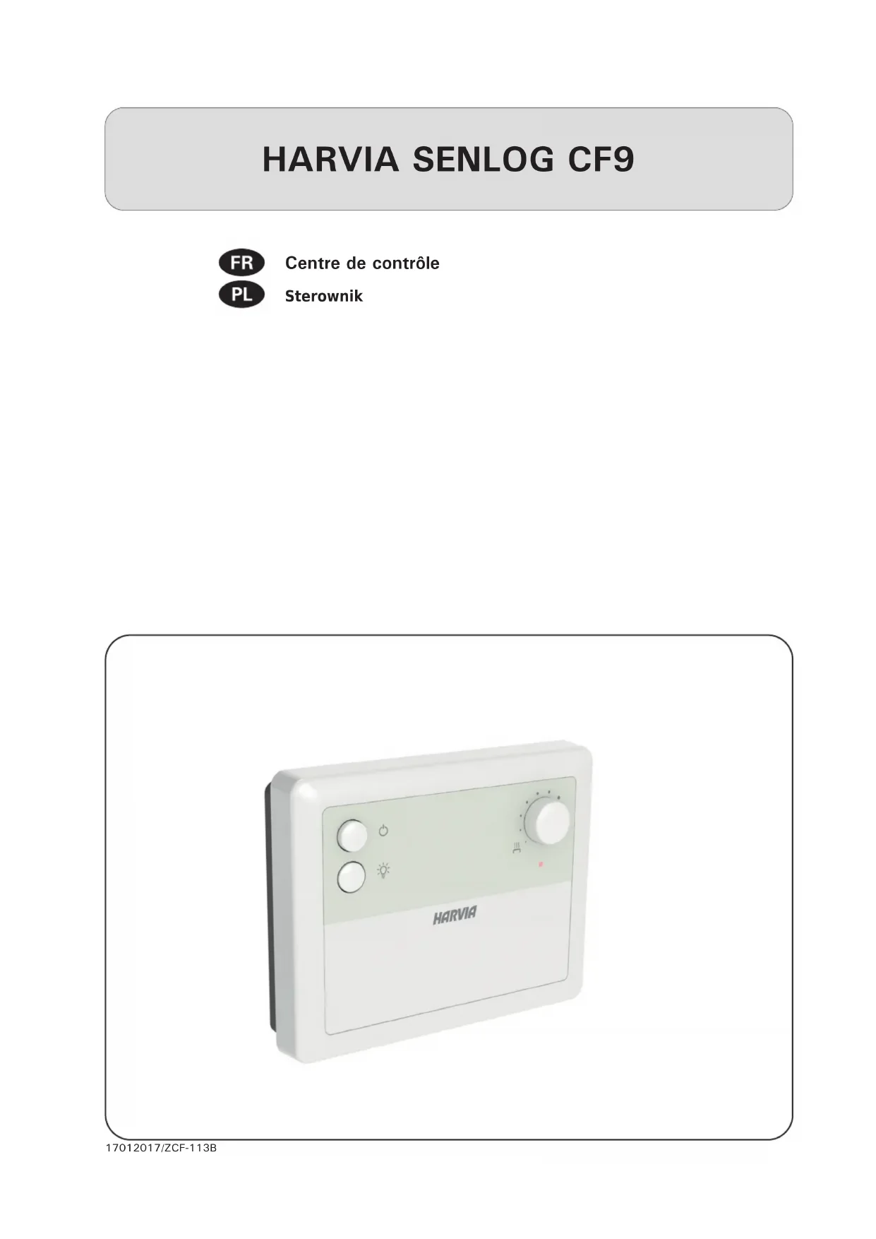 Centre de contrôle SterownikCes instructions d’installation et d’utilisation s’adressent aux propriétaires de saunas, poêles et centres de contrôle, aux personnes responsables de saunas, poêles et centres de contrôle, et aux électriciens chargés d’installer les poêles et centres de contrôle. Une fois le centre de contrôle installé, ces instructions d’installation et d’utilisation seront remises au propriétaire des saunas, poêles et centre de contrôle, ou à la personne chargée de leur main- tenance. CENTRE DE CONTRÔLE HARVIA SENLOG CF9 Fonction du centre de contrôle : le centre de contrôle sert à contrôler les fonctions du poêle. Il ne doit en aucun cas être utilisé pour tout autre objet. Félicitations pour cet excellent choix ! Poni¿sza instrukcja instalacji i obs³ugi sterownika Senlog skierowana jest do osób posiadaj±cych saunê (piec i sterownik), osób odpowiedzialnych za funkcjonowanie sauny (pieca i sterownika) jak i dla monterów oraz elektryków. Instrukcja ta powinna byæ przekazana w³a¶cicielowi sauny (pieca i ster- ownika) lub osobie odpowiedzialnej za prawid³owe funkcjonowanie sauny (pieca i sterownika).