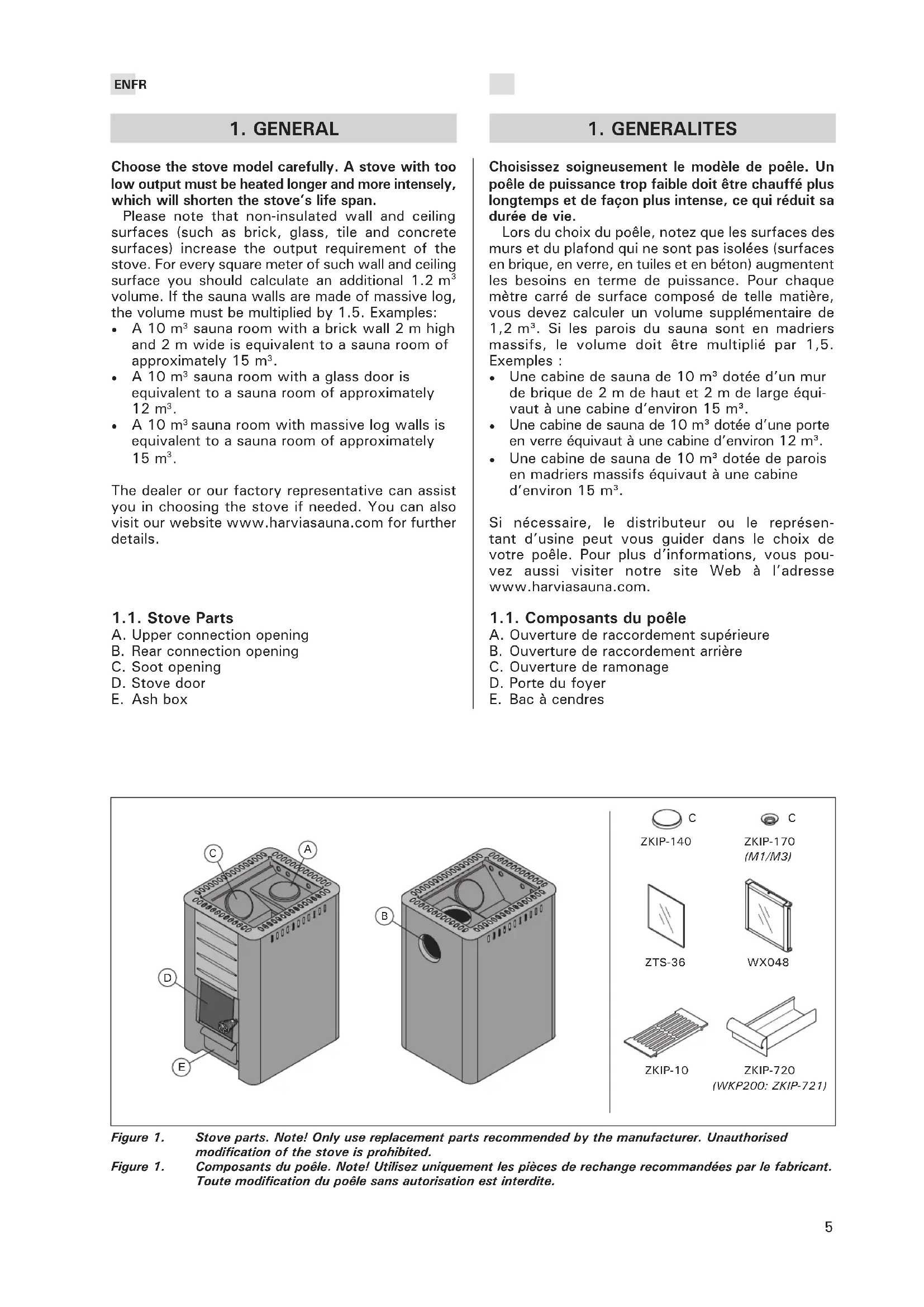 - Une cabine de sauna de 10 m³ dotée de parois en madriers massifs équivaut à une cabine d’environ 15 m³. Si nécessaire, le distributeur ou le représen- tant d’usine peut vous guider dans le choix de votre poêle. Pour plus d’informations, vous pou- vez aussi visiter notre site Web à l’adresse www.harviasauna.com. 1.1. Composants du poêle A. Ouverture de raccordement supérieure B. Ouverture de raccordement arrière C. Ouverture de ramonage D. Porte du foyer E. Bac à cendres Choose the stove model carefully. A stove with too low output must be heated longer and more intensely, which will shorten the stove’s life span. Please note that non-insulated wall and ceiling surfaces (such as brick, glass, tile and concrete surfaces) increase the output requirement of the stove. For every square meter of such wall and ceiling surface you should calculate an additional 1.2 m