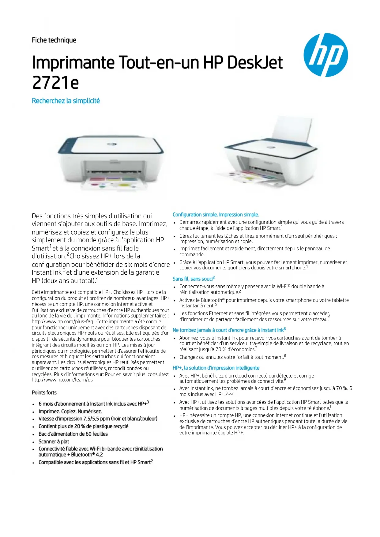 Fiche technique Imprimante Tout-en-un HP DeskJet 2721e Recherchez la simplicité Des fonctions très simples d’utilisation qui viennent s’ajouter aux outils de base. Imprimez, numérisez et copiez et configurez le plus simplement du monde grâce à l’application HP Smart et à la connexion sans fil facile d’utilisation. Choisissez HP+ lors de la configuration pour bénéficier de six mois d’encre Instant Ink et d’une extension de la garantie HP (deux ans au total). Cette imprimante est compatible HP+. Choisissez HP+ lors de la configuration du produit et profitez de nombreux avantages. HP+ nécessite un compte HP, une connexion Internet active et l’utilisation exclusive de cartouches d’encre HP authentiques tout au long de la vie de l’imprimante. Informations supplémentaires : http://www.hp.com/plus-faq . Cette imprimante a été conçue pour fonctionner uniquement avec des cartouches disposant de circuits électroniques HP neufs ou réutilisés. Elle est équipée d'un dispositif de sécurité dynamique pour bloquer les cartouches intégrant des circuits modifiés ou non-HP. Les mises à jour périodiques du micrologiciel permettent d'assurer l'efficacité de ces mesures et bloquent les cartouches qui fonctionnaient auparavant. Les circuits électroniques HP réutilisés permettent d'utiliser des cartouches réutilisées, reconditionnées ou recyclées. Plus d'informations sur: Pour en savoir plus, consultez: http://www.hp.com/learn/ds Points forts 6 mois d’abonnement à Instant Ink inclus avec HP+ Imprimez. Copiez. Numérisez. Vitesse d'impression 7,5/5,5ppm (noir et blanc/couleur) Contient plus de 20 % de plastique recyclé Bac d'alimentation de 60 feuilles Scanner à plat Connectivité fiable avec Wi-Fi bi-bande avec réinitialisation automatique + Bluetooth® 4.2 Compatible avec les applications sans fil et HP Smart Configuration simple. Impression simple. Démarrez rapidement avec une configuration simple qui vous guide à travers chaque étape, à l'aide de l'application HP Smart. Gérez facilement les tâches et tirez énormément d'un seul périphériques : impression, numérisation et copie. Imprimez facilement et rapidement, directement depuis le panneau de commande. Grâce à l'application HP Smart, vous pouvez facilement imprimer, numériser et copier vos documents quotidiens depuis votre smartphone. Sans fil, sans souci Connectez-vous sans même y penser avec la Wi-Fi® double bande à réinitialisation automatique. Activez le Bluetooth® pour imprimer depuis votre smartphone ou votre tablette instantanément. Les fonctions Ethernet et sans fil intégrées vous permettent d'accéder, d'imprimer et de partager facilement des ressources sur votre réseau. Ne tombez jamais à court d’encre grâce à Instant Ink Abonnez-vous à Instant Ink pour recevoir vos cartouches avant de tomber à court et bénéficier d’un service ultra-simple de livraison et de recyclage, tout en réalisant jusqu’à 70 % d’économies. Changez ou annulez votre forfait à tout moment. HP+, la solution d'impression intelligente Avec HP+, bénéficiez d’un cloud connecté qui détecte et corrige automatiquement les problèmes de connectivité. Avec Instant Ink, ne tombez jamais à court d’encre et économisez jusqu’à 70 %. 6 mois inclus avec HP+. Avec HP+, utilisez les solutions avancées de l’application HP Smart telles que la numérisation de documents à pages multiples depuis votre téléphone. HP+ nécessite un compte HP, une connexion Internet continue et l'utilisation exclusive de cartouches d'encre HP authentiques pendant toute la durée de vie de l'imprimante. Vous pouvez accepter ou décliner HP+ à la configuration de votre imprimante éligible HP+.