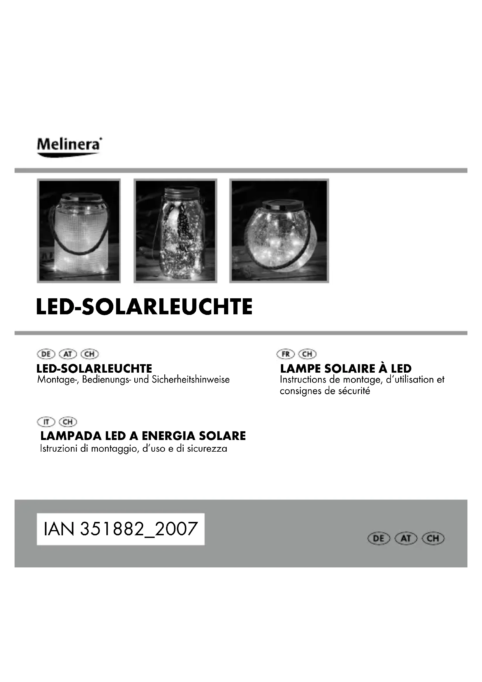 Vis Contenu de la livraison 1 lampe solaire à LED et pile rechargeable 1 manuel de montage, d‘utilisation et consignes de sécurité28 FR/CH Caractéristiques techniques Tension de service : 1,2 V Pile : 1 pile Ni-MH / AAA / 1,2 V / 300 mAh LED : 20 micro LED Puissance : max. 0,021 W (HG07137A) max. 0,022 W (HG07137B) max. 0,024 W (HG07137C) Indice de protection: IP44 (protégé contre les projections d‘eau) Cellule solaire : env. 40 x 40 mm Durée d‘éclairage (lorsque la pile est entièrement chargée) : env. 8 heures Consignes de sécurité VEUILLEZ LIRE LE MODE D‘EMPLOI AVANT UTILISATION! LE MODE D‘EMPLOI EST À CONSERVER SOIGNEUSEMENT! LORSQUE VOUS REMETTEZ LE PRODUIT À D‘AUTRES29 FR/CH