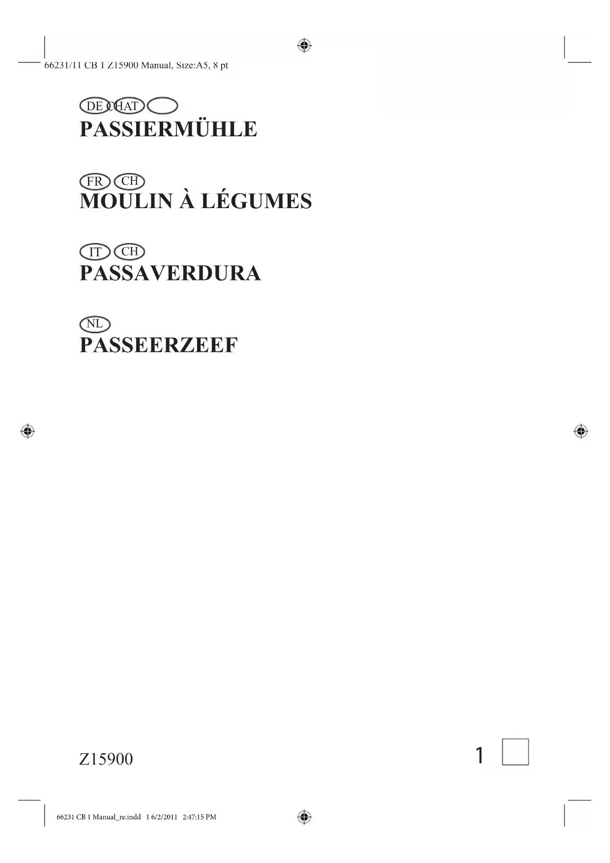 Pour démonter le moulin poussez une extrémité du support vers le bas avec précaution et faites-le sortir latéralement de l’ouverture en le faisant pivoter. Veillez à ne pas rayer inutilement la surface. Vous pouvez ensuite retirer la manivelle et le disque facilement. Nettoyage et entretien Si vous les lavez à la main, n’utilisez pas d’objets pointus ou aiguisés. Traitement des déchets Veuillezjeterl’articleconformémentauxdispositionsofcielleslocales. Elimination de l’emballage Eliminer tous les matériaux d’emballage dans le respect de l’environnement. FR CH 66231 CB 1 Manual_re.indd 3 6/2/2011 2:47:16 PM66231/11 CB 1 Z15900 Manual, Size:A5, 8 pt 66231/11 CB 1 Z15900 Manual, Size:A5, 8 pt