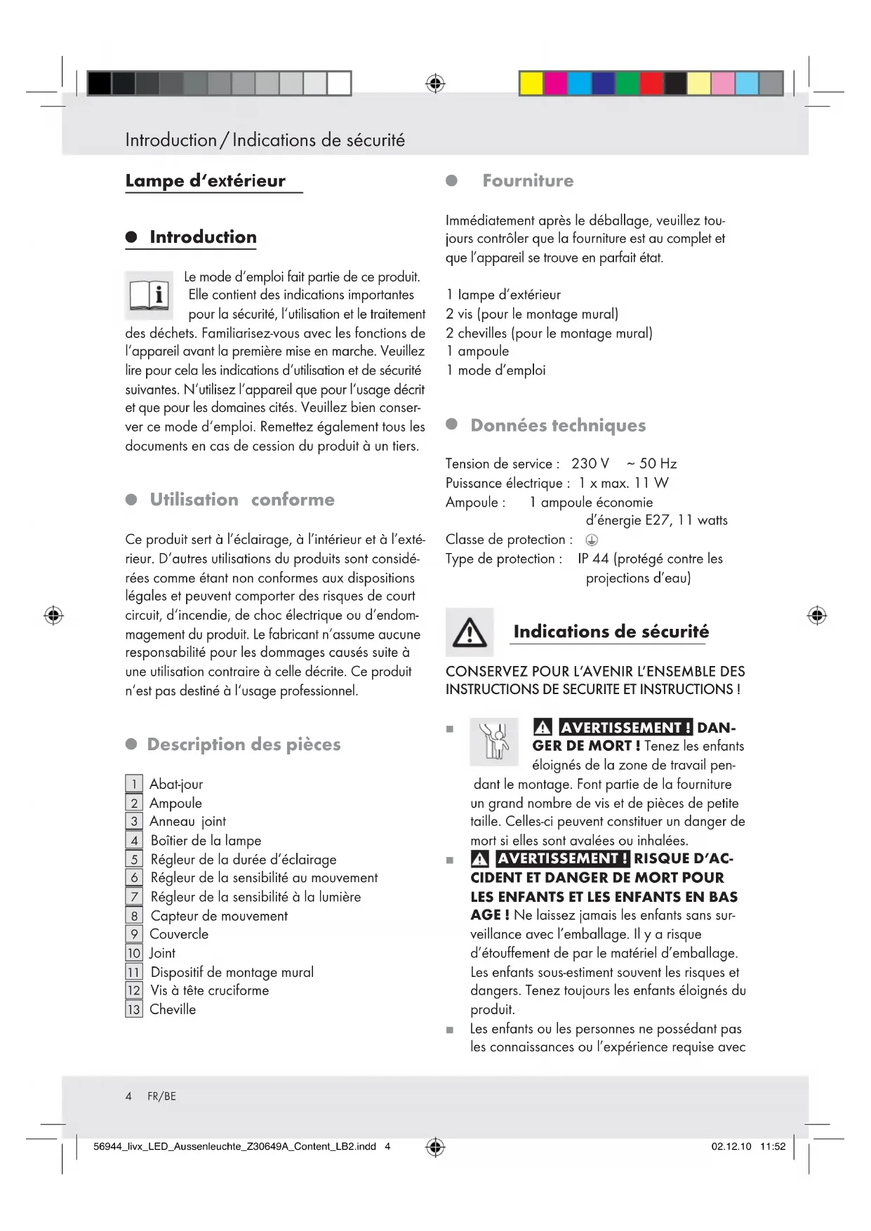 LES ENFANTS ET LES ENFANTS EN BAS AGE! Ne laissez jamais les enfants sans sur- veillance avec l’emballage. Il y a risque d’étouffement de par le matériel d’emballage. Les enfants sous-estiment souvent les risques et dangers. Tenez toujours les enfants éloignés du produit. Les enfants ou les personnes ne possédant pas les connaissances ou l’expérience requise avec Introduction / Indications de sécurité 56944_livx_LED_Aussenleuchte_Z30649A_Content_LB2.indd 4 02.12.10 11:525 FR/BE cet appareil, ou dont les aptitudes physiques, sensorielles ou mentales sont limitées, ne doivent pas utiliser l’appareil sans la surveillance ou la direction d’une personne responsable pour leur sécurité. Il convient de surveiller les enfants de manière à ce qu’ils ne jouent pas avec l’appareil. Ce produit n‘est pas un jouet et doit être tenu à l‘écart des mains d‘enfants. Les enfants ne sont pas en mesure de reconnaître les dangers liés à des appareils électriques. N‘utilisez pas l‘article, si vous remarquez des endommagements quelconques.