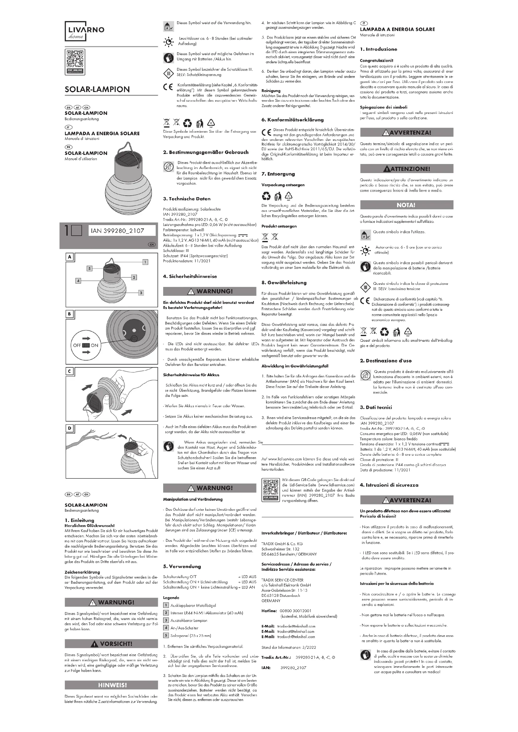 pourrez envoyer, sans frais de port, le produit défectu- eux, y compris une preuve d'achat et une description du défaut. Vous pouvez télécharger ces manuels, ainsi que de nom- breux autres, des vidéos de produits et des logiciels d’in- stallation sur www.lidl-service.com. Ce code QR vous amène directement sur la page de service Lidl (www.lidl-service.com) et vous pouvez ouvrir votre manuel d’utilisation en saisissant le numéro d’article (IAN) 399280_2107. Distributeur: TRADIX GmbH & Co. KG Schwanheimer Str. 132 DE-64625 Bensheim / GERMANY Adresse du service: TRADIX SERVICE-CENTER c/o Teknihall Elektronik GmbH Assar-Gabrielsson-Str. 11-13 DE-63128 Dietzenbach GERMANY Ligne directe : 00800 30012001 (gratuit, le mobile autrement ) E-Mail: tradix-fr@teknihall.com Statut des informations : 3/2022 Tradix Art.-Nr.: 399280-21-A, -B, -C, -D IAN: 399280_2107 SOLAR-LAMPION Manuel d’utilisation