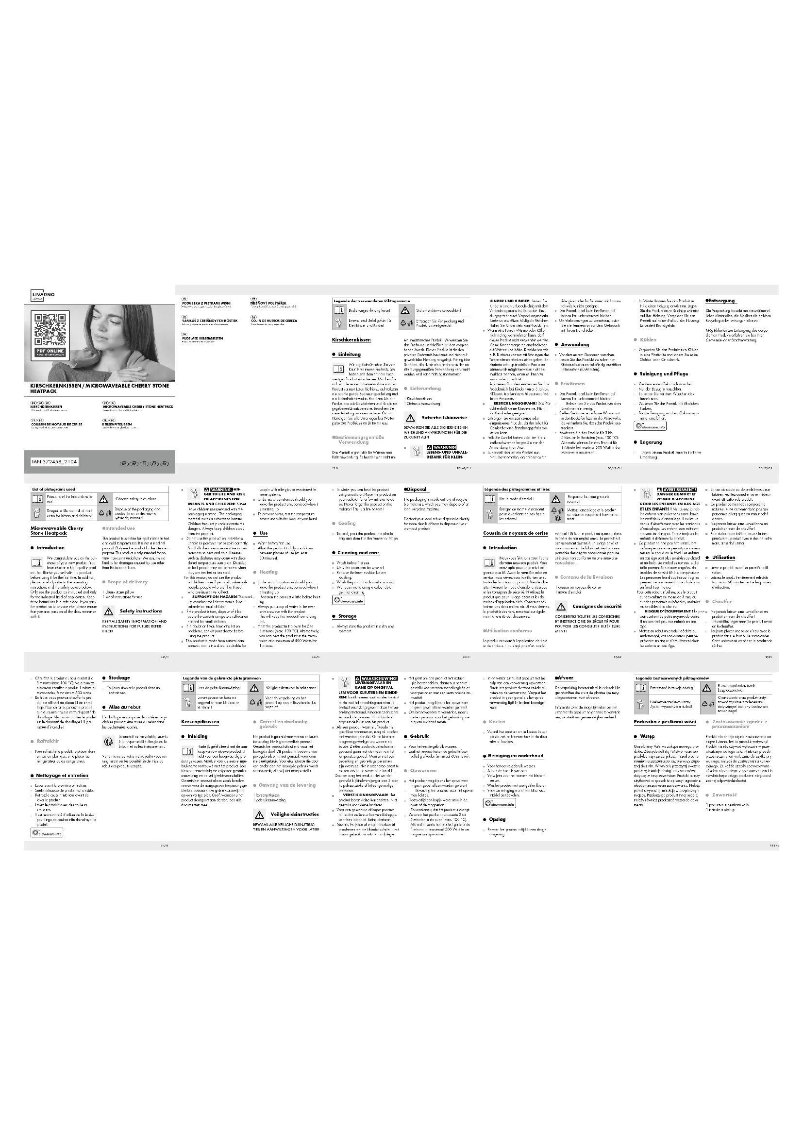 PAP Mettez l'emballage et le produit au rebut en respectant l'environne- ment! Coussin de noyaux de cerise Introduction Nous vous félicitons pour l‘achat de votre nouveau produit. Vous avez opté pour un produit de grande qualité. Avant la première mise en service, vous devez vous familiariser avec toutes les fonctions du produit. Veuillez lire attentivement le mode d’emploi ci-dessous et les consignes de sécurité. N’utilisez le produit que pour l’usage décrit et les do- maines d’application cités. Conserver ces instructions dans un lieu sûr. Si vous donnez le produit à des tiers, remettez-leur égale- ment la totalité des documents. Utilisation conforme Le produit convient à l’application de froid et de chaleur. Il ne s’agit pas d’un produit médical! Utilisez le produit uniquement dans le cadre de son emploi prévu. Le produit est exclusivement destiné à un usage privé et non commercial. Le fabricant n’est pas res- ponsable des dégâts occasionnés par une utilisation non conforme ou une mauvaise manipulation. Contenu de la livraison 1 coussin en noyaux de cerise 1 mode d’emploi Consignes de sécurité
