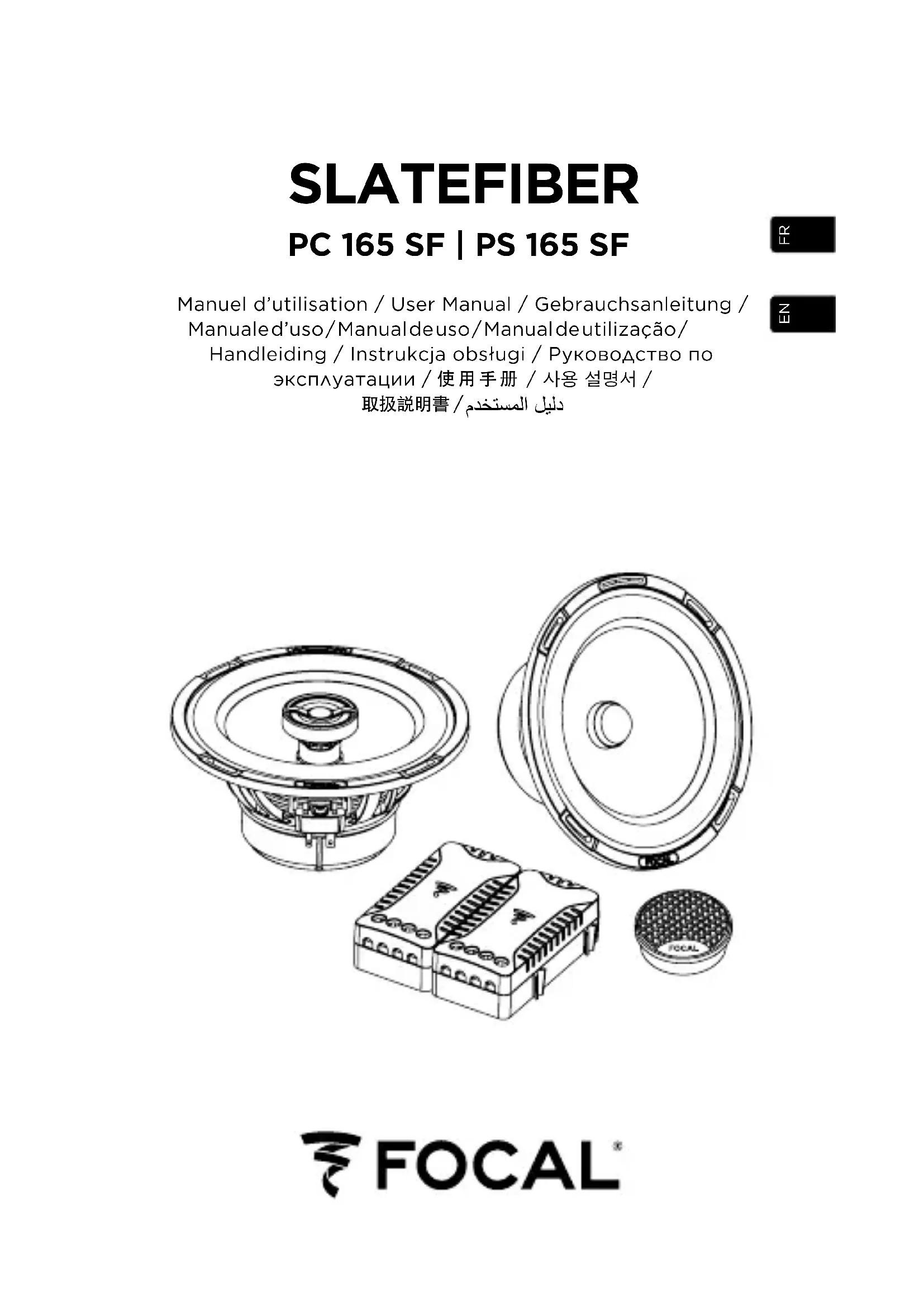 SLATEFIBER Manuel d’utilisation Nous vous remercions d’avoir choisi les kits PC 165 SF, PS 165 SF, et de partager avec nous notre passion du son, de la musique. Ces haut-parleurs de haute technicité intègrent les perfectionnements Focal en matière de conception de haut-parleurs pour l’obtention d’un son puissant et de très haute qualité. Afin de tirer le meilleur de votre système et d’exploiter toutes leurs performances, nous vous conseillons de lire ce livret, puis de le conserver avec précaution pour pouvoir vous y référer ultérieurement. Tout problème dû au non-respect des règles d’utilisation peut entraîner l’invalidation de la garantie. Pour un résultat optimal, nous vous recommandons de faire effectuer l'installation par un professionnel. Recommandations importantes Avant tout, vérifiez l’espace disponible pour l’encastrement des haut-parleurs (se reporter aux plans sur l’emballage) puis procédez aux découpes. Dans le cas d’un montage en emplacement d’origine, vérifiez qu’il y ait un espace suffisant entre le haut- parleur et la grille de protection.