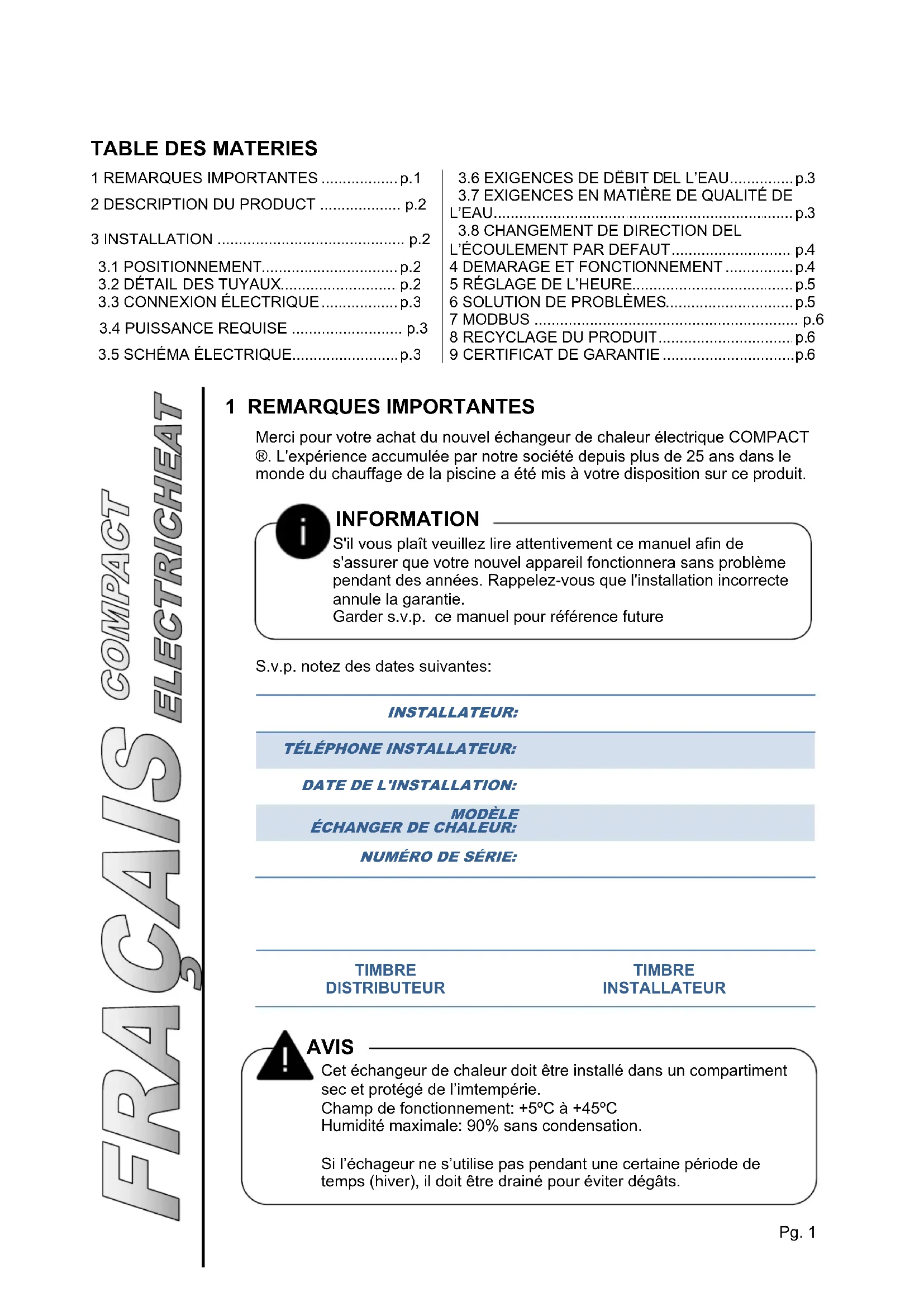 1 REMARQUES IMPORTANTES Merci pour votre achat du nouvel échangeur de chaleur électrique COMPACT ®. L'expérience accumulée par notre société depuis plus de 25 ans dans le monde du chauffage de la piscine a été mis à votre disposition sur ce produit.